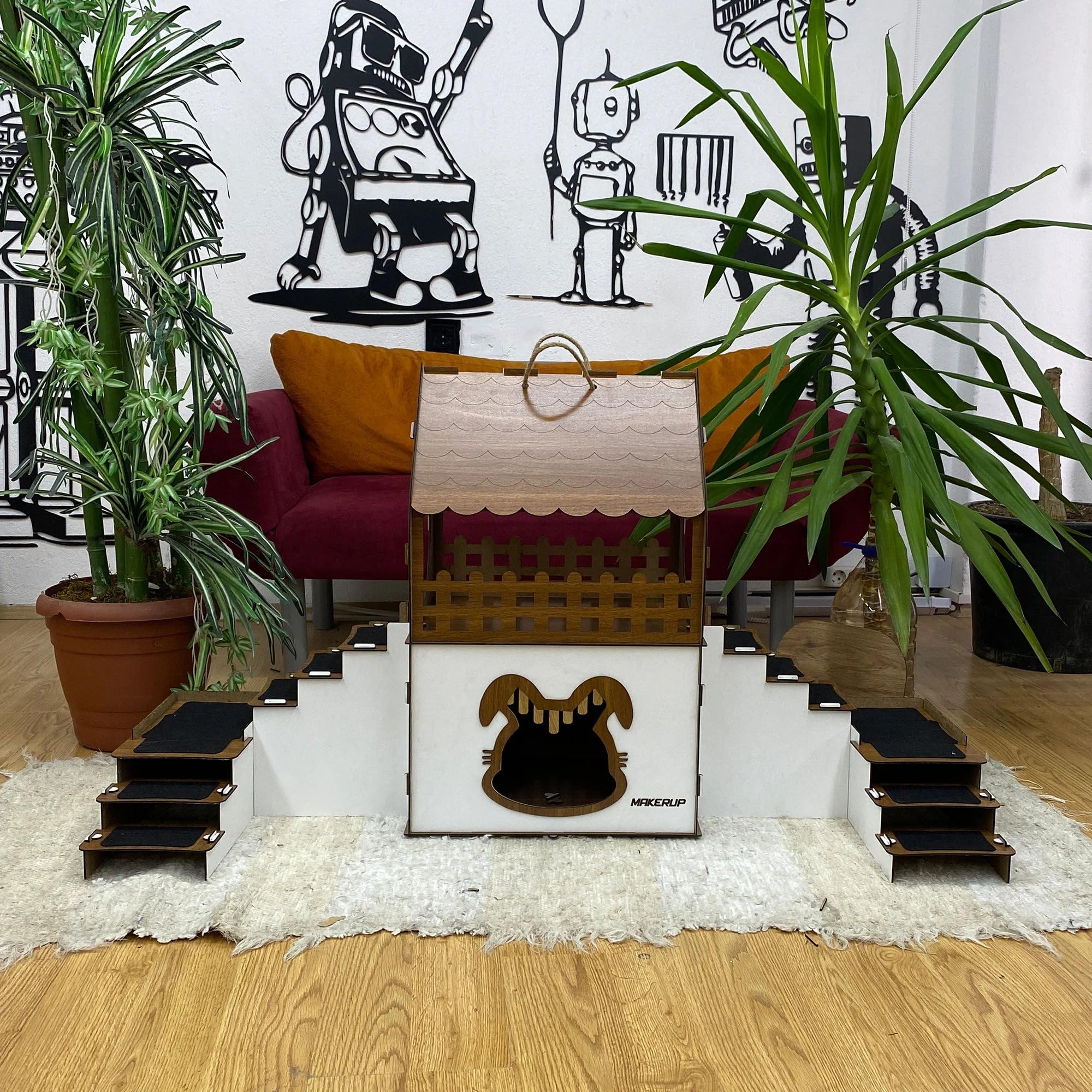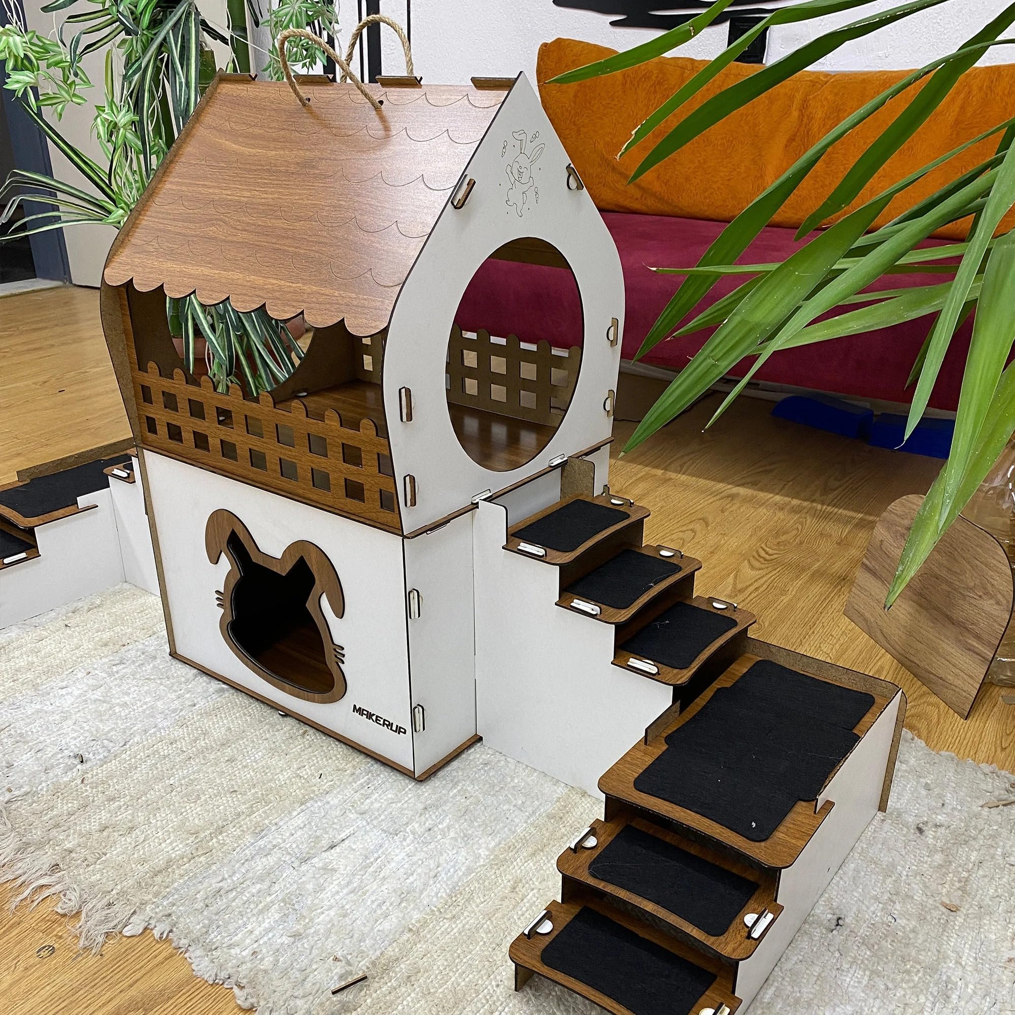 Ein liebevoll gestaltetes Zuhause für Ihre flauschigen Mitbewohner – funktional, sicher und stilvoll. Das PrimePetHouse Kaninchenhaus wurde speziell für 1–2 Kaninchen oder Chinchillas entwickelt. Mit seinen zwei Etagen, sechs robusten Stufen und einem durchdachten Aufbau bietet es sowohl Sicherheit als auch Spielspaß. Die untere Etage verfügt über eine charmante Tür im Hasenkopfdesign sowie eine seitliche Klappe für zusätzlichen Zugang. Oben befinden sich zwei breite, runde Eingänge, die eine flexible Platzierung der Leiter ermöglichen. Die integrierten Schutzgeländer verhindern das Herunterfallen und schaffen eine sichere Umgebung für Ihre Tiere. Dank der mitgelieferten Juteseile ist das Haus einfach zu tragen und kann bequem in jedem Raum platziert oder dekoriert werden. Ein stilvolles Namensschild verleiht dem Ganzen eine persönliche Note. ? Materialqualität: Das Haus besteht aus 3 mm starkem, antibakteriellem Sperrholz – jedes Stück mit natürlicher Maserung und einzigartigem Charakter. Unser Holz entspricht internationalen Gesundheits- und Sicherheitsstandards. ? Produktmaße: Höhe: 65 cm Gesamtbreite: 120 x 40 cm Höhe untere Etage: 30 cm Türdurchmesser: 24 cm ? Lieferumfang: Zerlegtes Kaninchenhaus Juteseil-Tragegriff Namensschild Aufbauanleitung ? Aufbau & Pflege: Schnelle und einfache Montage mit passgenauen Stecksystemen – ganz ohne Werkzeug. Reinigung mit feuchtem Tuch. Für den Innenbereich gedacht. Schenken Sie Ihren Kaninchen ein Zuhause, das Sicherheit, Stil und Lebensfreude vereint