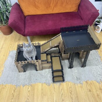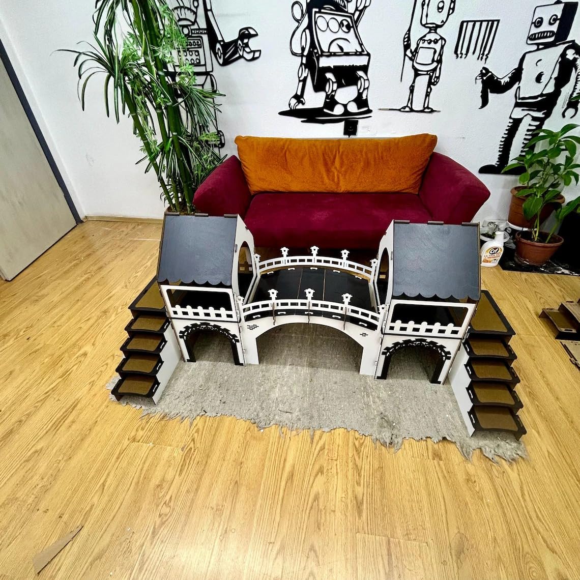 Ein modernes, dreistöckiges Katzenhaus aus hochwertigem 3 mm Sperrholz – ideal für bis zu 2 Katzen (max. 10 kg). Ausgestattet mit Rampe, Treppen, zwei offenen Terrassen und einer Holzbrücke bietet es viel Raum zum Ausruhen und Spielen. Das platzsparende Design eignet sich für Innenbereiche und überdachte Außenbereiche. Merkmale: Erdgeschoss: Zwei separate Innenräume mit großen Eingängen und Fenstern zur Belüftung. Zweiter Stock: Offene Terrasse mit festen Seitengeländern und Zugang über eine Rampe. Dritter Stock: Große offene Terrasse mit dekorativen Stützen und Absturzsicherung. Material: Zertifiziertes, antibakterielles Sperrholz mit natürlicher Maserung. Jedes Haus ist durch die Holzstruktur ein Unikat. Maße: Höhe: 45 cm | Breite: 110 cm Wohnbereiche: 35×35 cm & 20×40 cm Terrassen: 35×35 cm & 42×42 cm Rampe: 40×16 cm Kissen: Maßgefertigt, weich, aus waschbarem Welsoft-Stoff (30?°C), erhältlich in Schwarz oder Weiß. Lieferumfang: Zerlegtes Katzenhaus Verbindungsschlösser Kissen Einfache Montage mit Anleitung. Reinigung mit feuchtem Tuch. Nicht direkter Nässe oder intensiver Sonneneinstrahlung aussetzen.