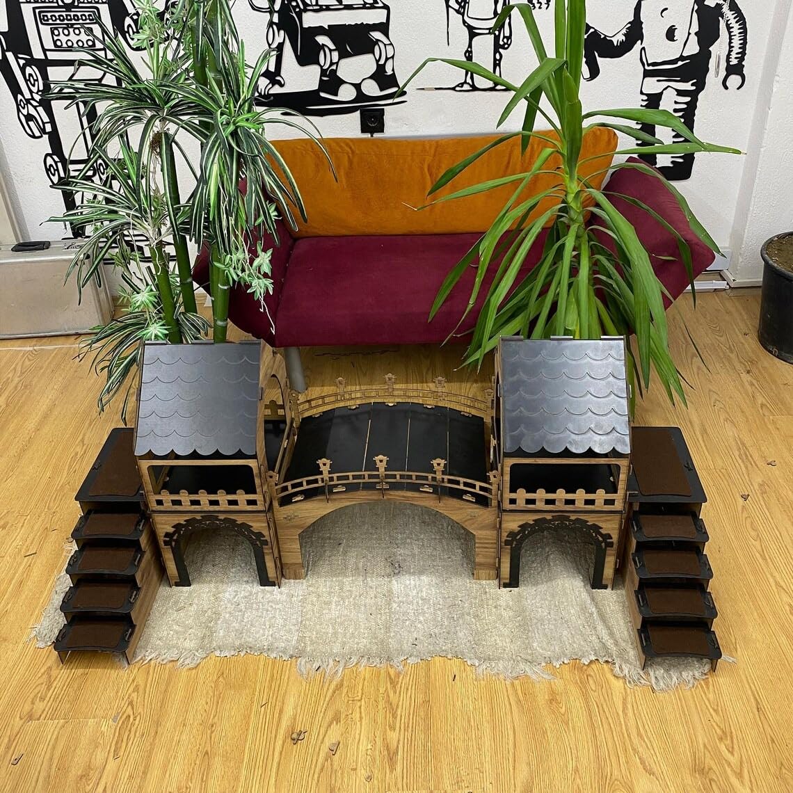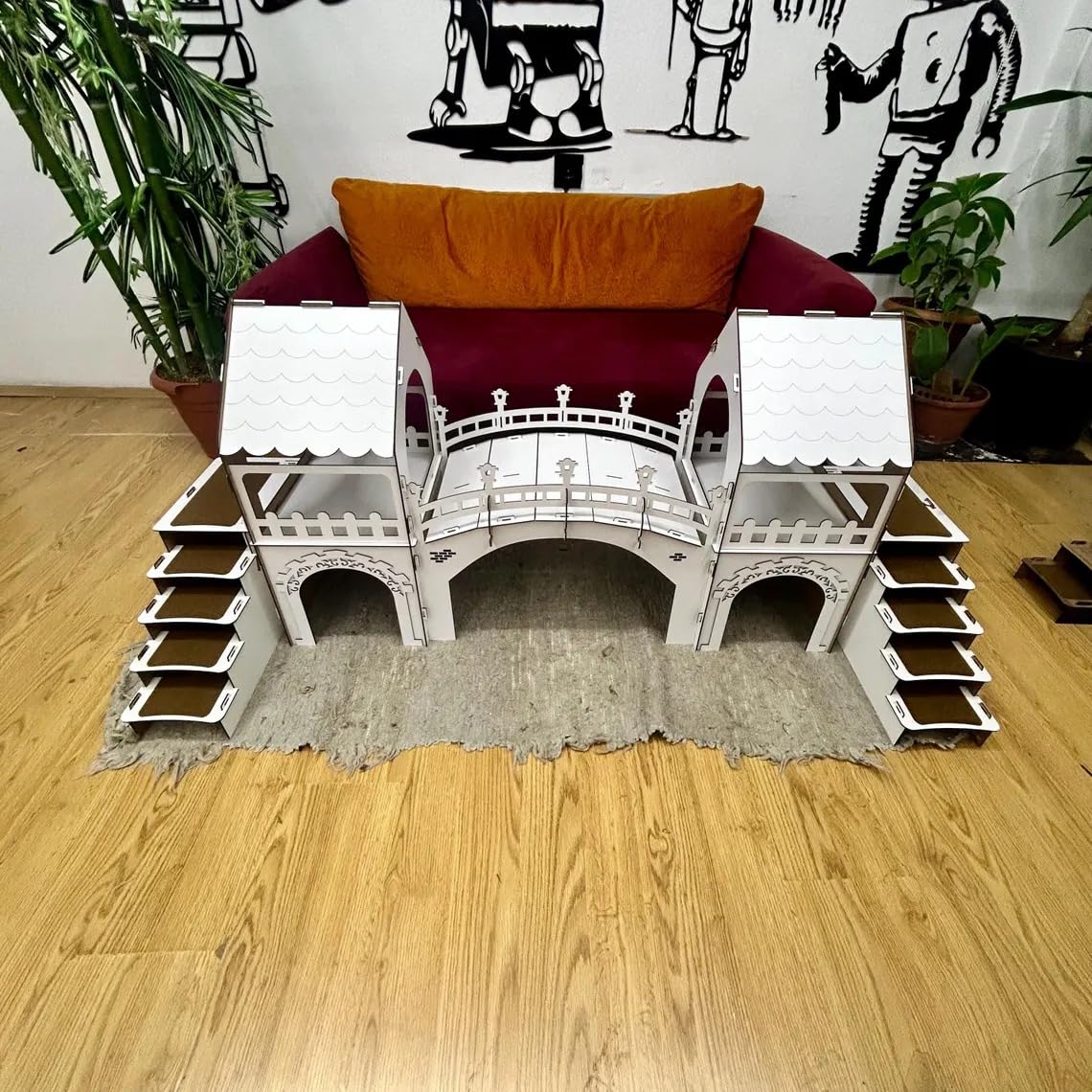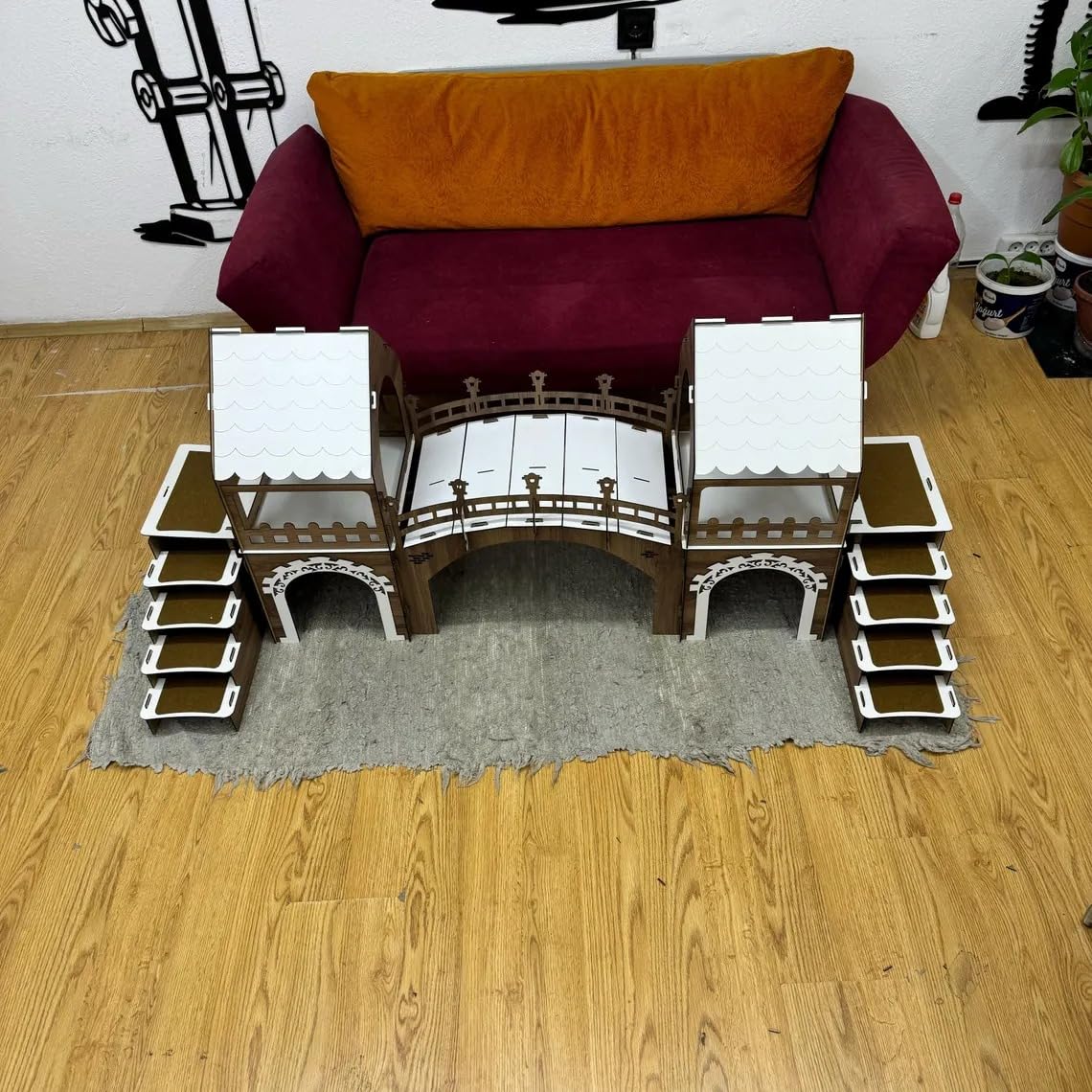 Ein traumhaftes Zuhause für Ihre Kaninchen – funktional, stabil und mit Liebe zum Detail gefertigt. Dieses einzigartige, zweistöckige Kaninchenschloss von PrimePetHouse bietet Ihren flauschigen Freunden ein wahres Königreich. Mit zwei separaten Turmeinheiten, vier geräumigen Zimmern, einer stilvollen, breiten Holzbrücke und rutschfesten Stufen fördert es Bewegung, Sicherheit und Komfort zugleich. Die Eingänge sind großzügig gestaltet und sorgen für optimale Luftzirkulation. Das gesamte Haus ist aus hochwertigem, antibakteriellem 3 mm Sperrholz gefertigt, was nicht nur Stabilität, sondern auch ein natürliches und gesundes Wohnklima bietet. ? Abmessungen: Gesamthöhe: 57 cm Gesamtbreite: 136 x 35 cm Untere Eckräume: 27 x 26 cm Obere Eckräume: 27 x 36 cm Brückenlänge: 53 cm | Brückenbreite: 31 cm Wandstärke: 3 mm ? Montage & Versand: Das Produkt wird demontiert geliefert. Die Montage ist dank einfacher Stecksysteme und beiliegender Anleitung kinderleicht. Sperrholz kann anfangs leicht nach „Holzbrand“ riechen – der Geruch verfliegt nach kurzer Zeit. ? Pflege: Einfach mit einem feuchten Tuch abwischen. Für Innenräume und wettergeschützte Außenbereiche geeignet. Direkte Sonneneinstrahlung oder Regen vermeiden. ? Lieferumfang: Zerlegtes Kaninchenhaus Verbindungselemente (Locks) Aufbauanleitung