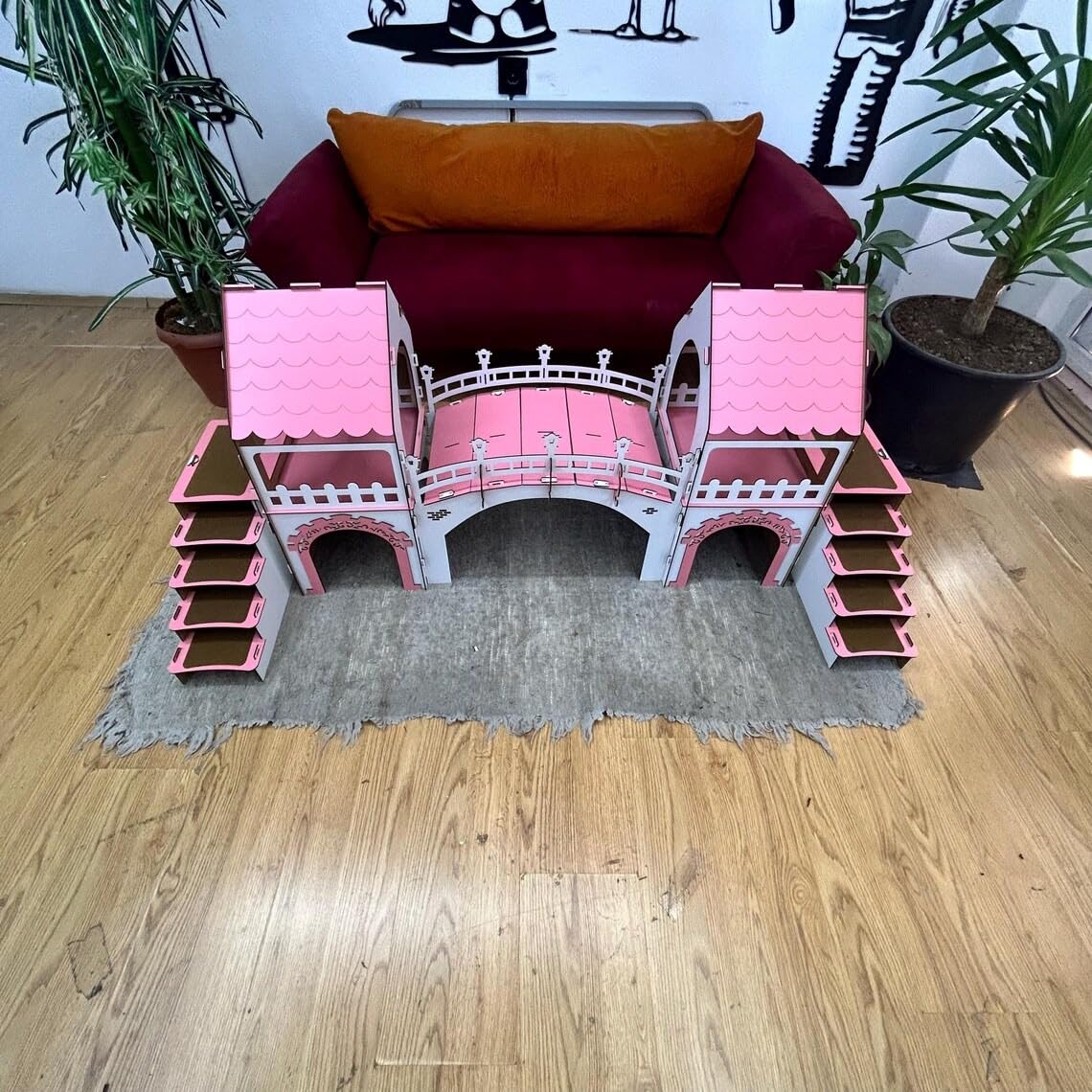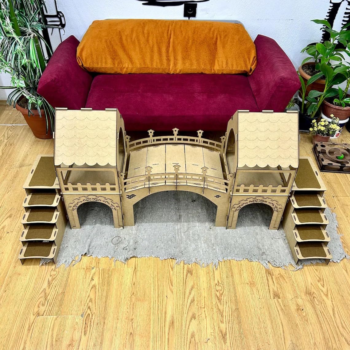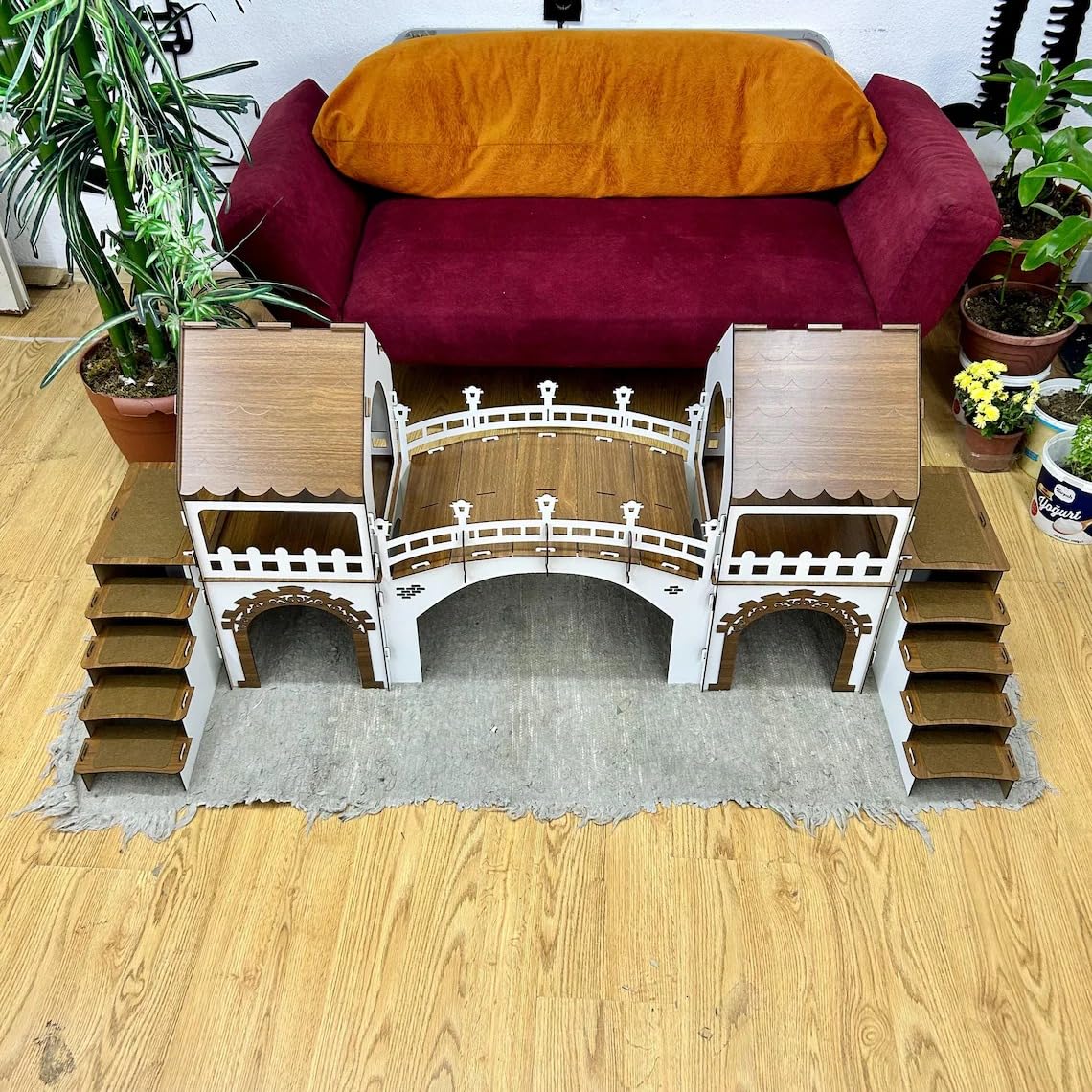 Ein traumhaftes Zuhause für Ihre Kaninchen – funktional, stabil und mit Liebe zum Detail gefertigt. Dieses einzigartige, zweistöckige Kaninchenschloss von PrimePetHouse bietet Ihren flauschigen Freunden ein wahres Königreich. Mit zwei separaten Turmeinheiten, vier geräumigen Zimmern, einer stilvollen, breiten Holzbrücke und rutschfesten Stufen fördert es Bewegung, Sicherheit und Komfort zugleich. Die Eingänge sind großzügig gestaltet und sorgen für optimale Luftzirkulation. Das gesamte Haus ist aus hochwertigem, antibakteriellem 3 mm Sperrholz gefertigt, was nicht nur Stabilität, sondern auch ein natürliches und gesundes Wohnklima bietet. ? Abmessungen: Gesamthöhe: 57 cm Gesamtbreite: 136 x 35 cm Untere Eckräume: 27 x 26 cm Obere Eckräume: 27 x 36 cm Brückenlänge: 53 cm | Brückenbreite: 31 cm Wandstärke: 3 mm ? Montage & Versand: Das Produkt wird demontiert geliefert. Die Montage ist dank einfacher Stecksysteme und beiliegender Anleitung kinderleicht. Sperrholz kann anfangs leicht nach „Holzbrand“ riechen – der Geruch verfliegt nach kurzer Zeit. ? Pflege: Einfach mit einem feuchten Tuch abwischen. Für Innenräume und wettergeschützte Außenbereiche geeignet. Direkte Sonneneinstrahlung oder Regen vermeiden. ? Lieferumfang: Zerlegtes Kaninchenhaus Verbindungselemente (Locks) Aufbauanleitung