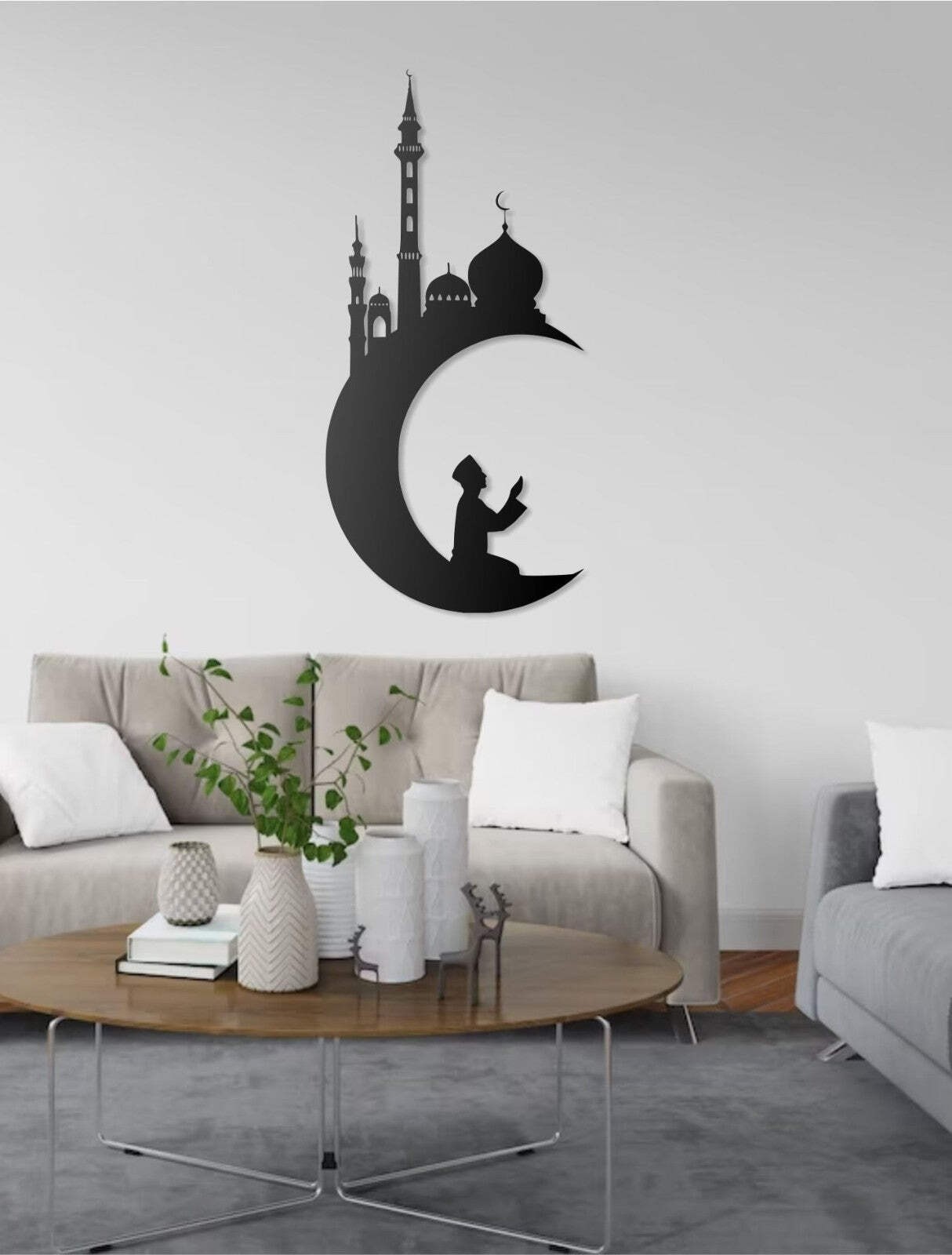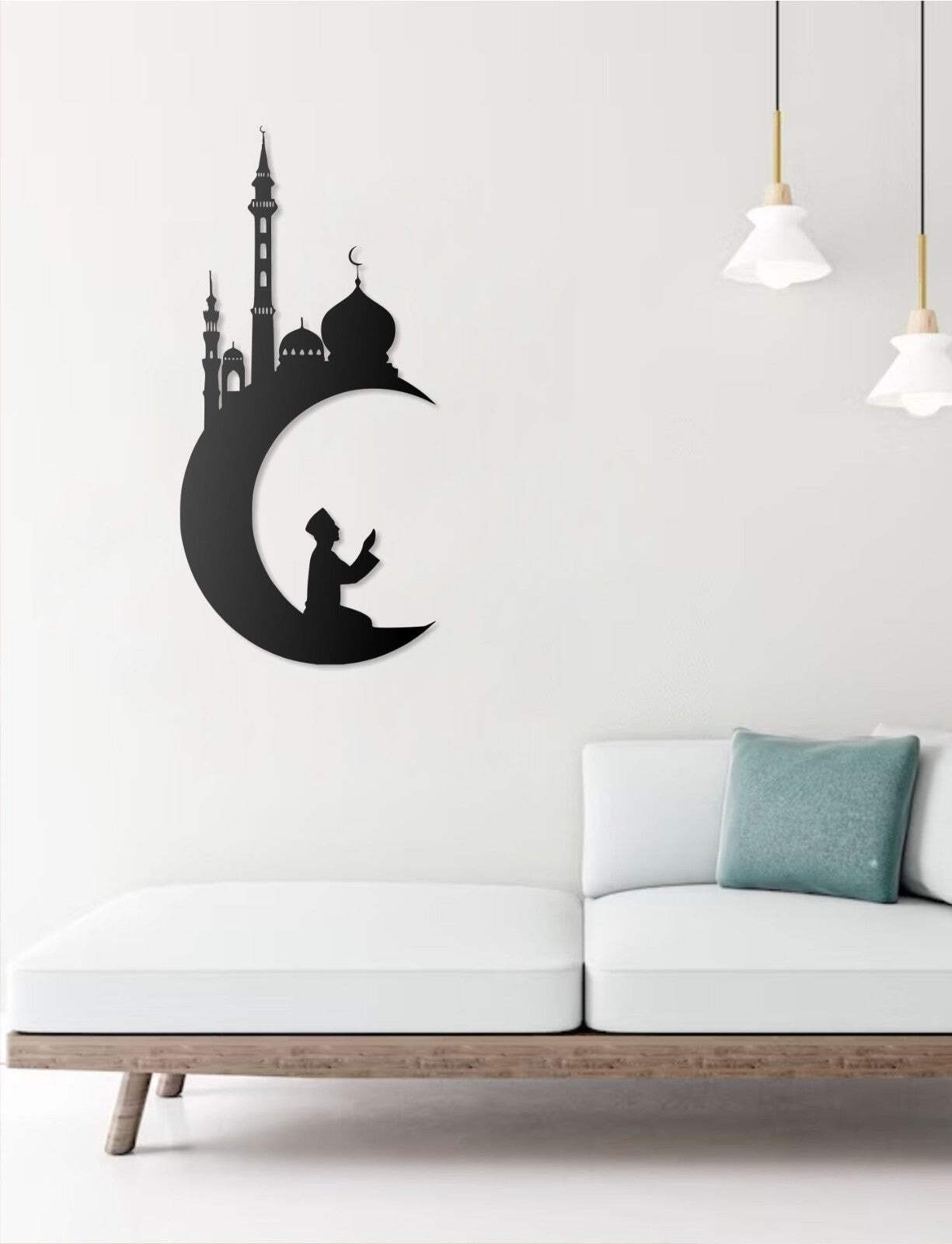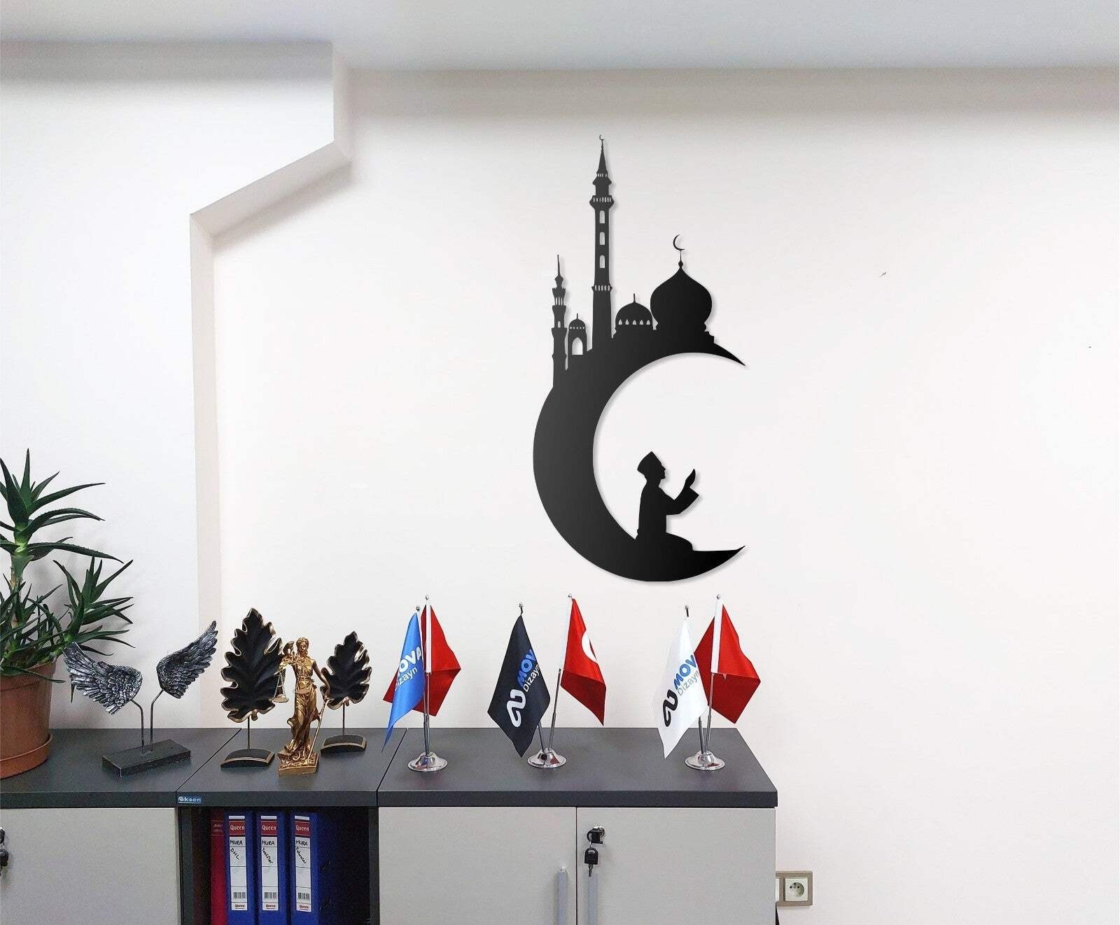 Ein einzigartiges Wandbild, das die Silhouette eines betenden Mannes vor einer Moschee darstellt. Dieses Kunstwerk vereint Spiritualität mit modernem Metalldesign und bringt eine ruhige, spirituelle Atmosphäre in Ihr Zuhause.