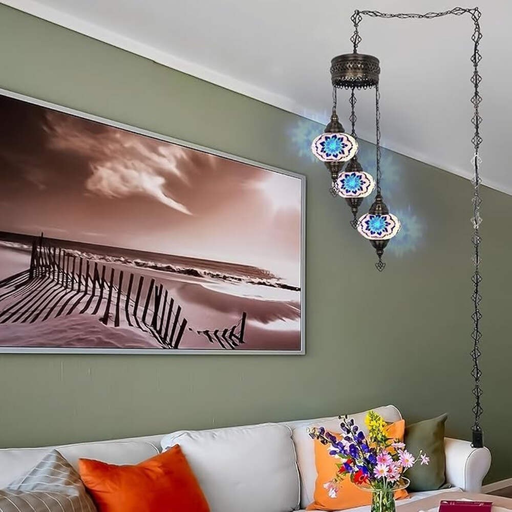 Vor allem wenn es darum geht, eine faszinierende Atmosphäre in Ihrem Zuhause, Hotel oder Restaurant zu schaffen, spielt die Beleuchtung eine entscheidende Rolle. Zweitens ist der türkische Kronleuchter aus Pyrexglas mit 11 Kugeln ein attraktives Kunstwerk, das die Schönheit von Pyrexglas mit dem Charme türkischer Handwerkskunst verbindet. Anschließend werden diese Pyrex-Gläser von erfahrenen türkischen Handwerkern sorgfältig von Hand zu Kronleuchtern verarbeitet, sodass jedes Stück ein Unikat und ein Meisterwerk ist. Die komplizierten Muster und filigranen Designs auf dem Glas sorgen für ein faszinierendes Lichtspiel und tauchen jeden Raum in einen warmen, einladenden Schein. Ganz gleich, ob Sie das Ambiente Ihres Wohnzimmers, Schlafzimmers, Essbereichs oder sogar eines gewerblichen Raums wie eines Hotels oder Restaurants aufwerten möchten, dieser Kronleuchter setzt garantiert ein Statement. Schließlich fügt sich sein zeitloser Charme und sein klassisches Design nahtlos in jeden Einrichtungsstil ein, sei er modern, traditionell oder eklektisch. ABMESSUNGENHöhe: 130 cmBreite: 94 cmHöhe ohne Kette: 100 cmKürzeste Aufhängehöhe: 100 cmDETAILS ZUR GLÜHBIRNETyp: E-12-Fassung für die USA – E-14-Fassung für Großbritannien und die EU.Anzahl: 11Maximale Wattzahl: 25 WGLÜHBIRNE NICHT ENTHALTENELEKTRISCHE ANGABENSpannung: 110 V für die USA – 220 V für Großbritannien und die EUStromversorgung: Mit Kabel von der DeckeVERSANDDETAILSDas Produkt ist handgefertigt und die Produktionszeit beträgt 7 Tage, der Versand ist kostenlos. Bitte kontaktieren Sie mich, wenn Sie Ihre Bestellung nicht innerhalb von 15 Tagen erhalten, ich werde mich darum kümmern und Ihnen helfen.PERSONALISIERENSie können unsere Produkte in Breite, Länge und Farbe nach Ihren Wünschen anpassen. Bitte kontaktieren Sie uns dazu. Am wichtigsten ist, dass wir ein individuelles 3D-Design erstellen können. Ebenso können Sie nach dem Entwurf das Bild und das Video davon sehen.MATERIALPyrexglasVerputztes MetallKetteKabel
