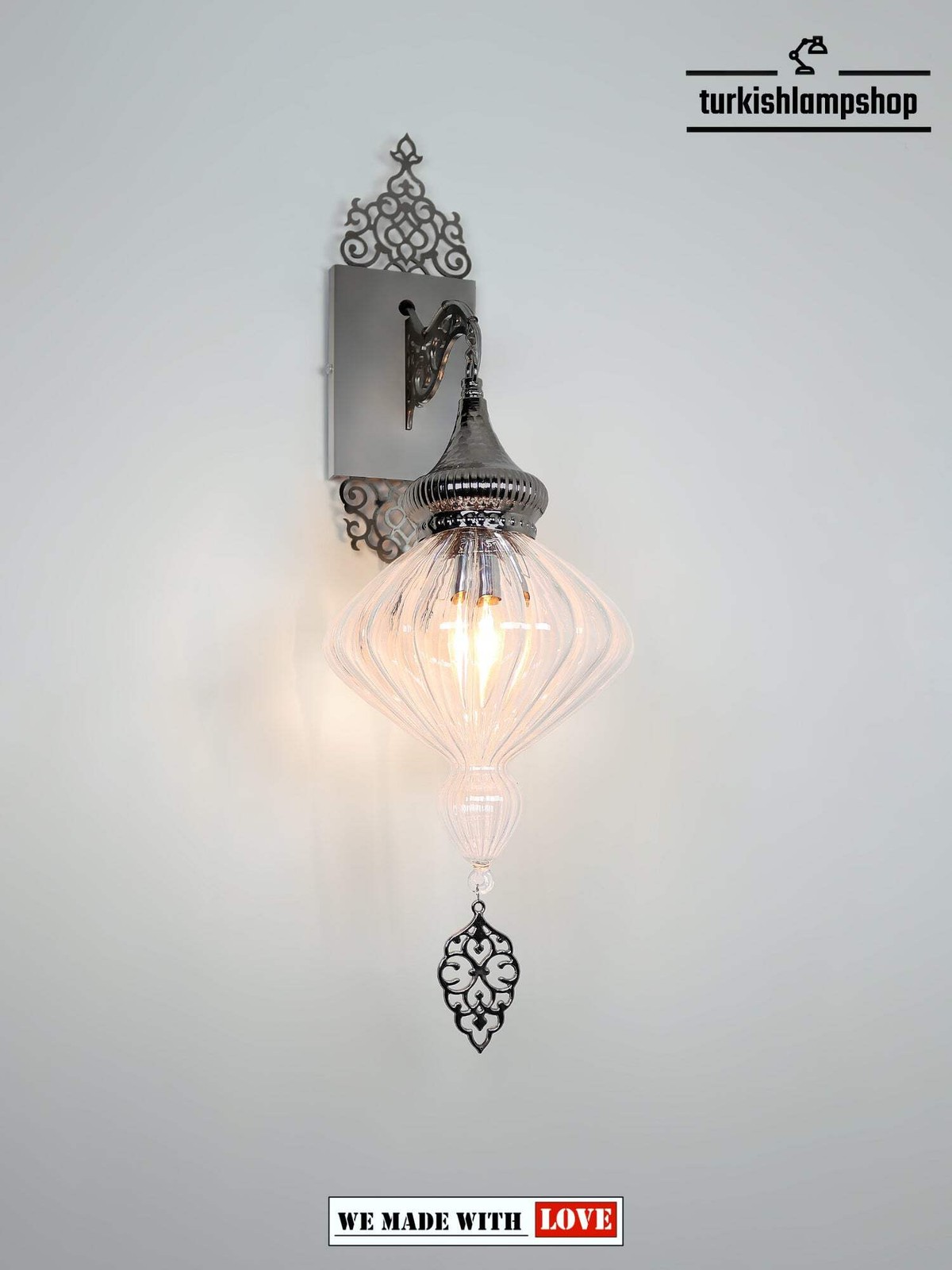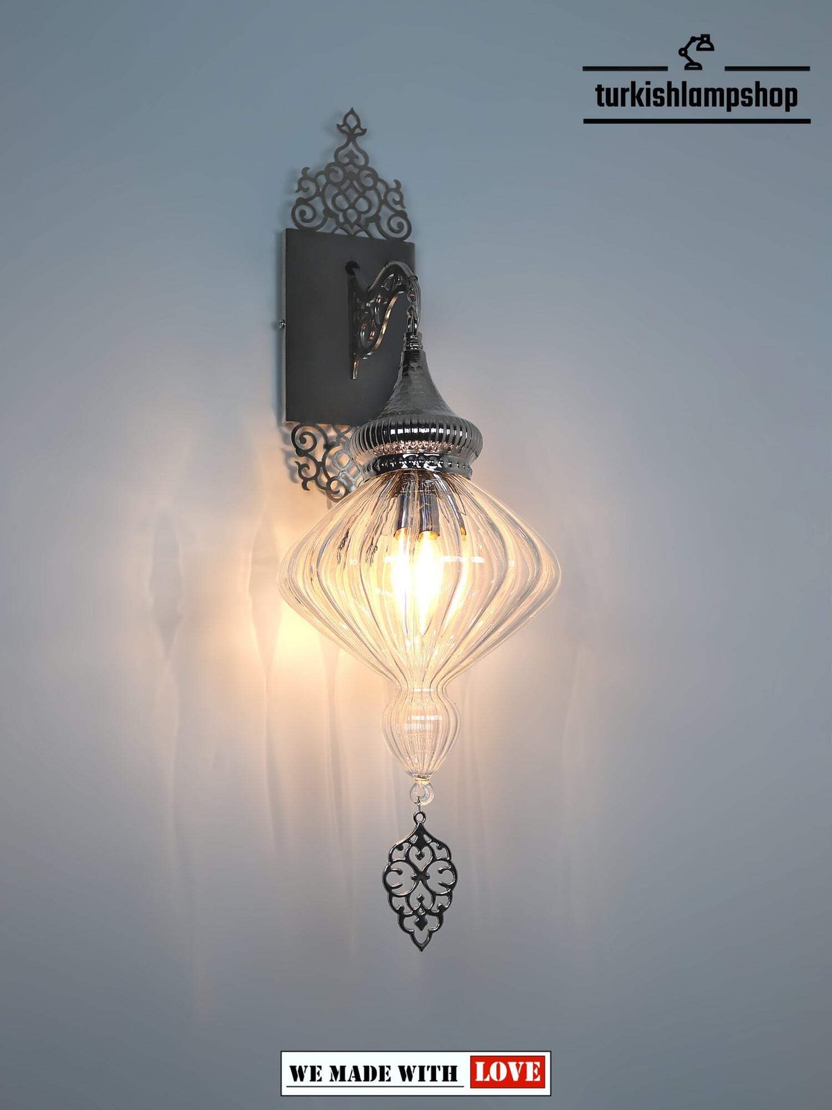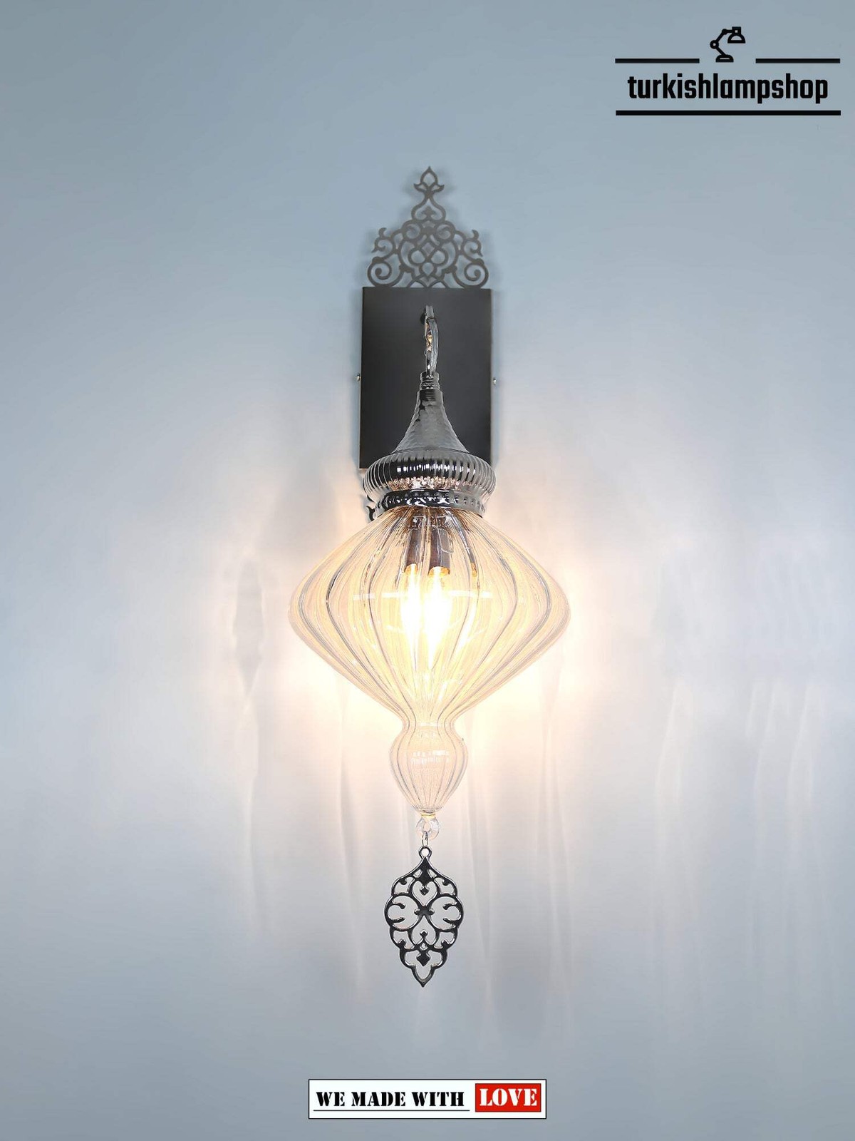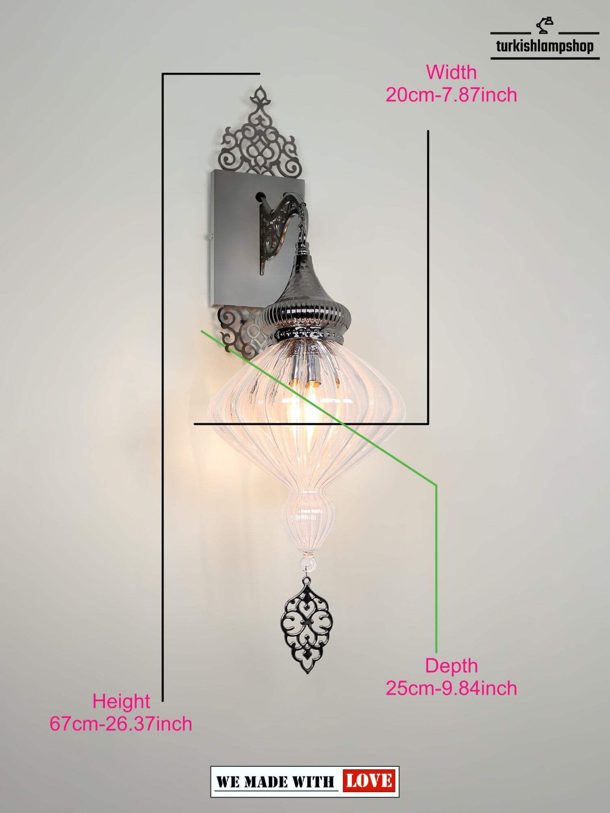 Above all create the perfect lighting with this Clear Pyrex Blown Glass Turkish Wall Sconce Lamp. Additionally, its contemporary design and delicate blown glass make it an ideal choice for any home. Therefore, this lamp will add a unique touch to your space while providing a pleasant atmosphere.Also this Clear Pyrex Blown Glass Turkish Wall Sconce Lamp is perfect for adding a modern and stylish look to your room, it has Turkish style glass exterior and wall mountable design. Additionally, this stunning lamp is perfect for brightening up your space.Additionally, our Clear Pyrex Glass Turkish Wall Lamp is an exquisite work of art, expertly crafted and handcrafted from the finest blown glass by Turkish glassmakers. Finally Plus the Polished, crystal clear pyrex makes it a beautiful addition to any decor and illuminates your room with unique style. Add elegance to your home with this stunning piece.DIMENSIONS Height : 67cm-26.37inc Width : 20cm-7.87inc Depth : 25cm-9.84incBULB DETAILS Type : E-12 socket for US – E-14 socket for UK and EU. Qty : 1 Maximum Walt : 40w BULB NOT INCLUDEDELECTRIC DETAILS Voltage : 110V for US – 220V for UK & EU Power source : With cable from ceilingSHIPMENT DETAILS The product is handmade and the production time is 10 days, shipping is free. Please contact me if you do not receive your order within 15 days, i’ll look into it and help.PERSONALIZEYou can customize our products in width, length and color as you wish, please contact us forthis. Most importantly, we can make a custom 3D design. In the same way, after the design, you can see the picture and video of the.METARIAL Pyrex Glass Plastering Metal Chain Cable