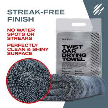 Mit seiner sehr saugfähigen Eigenschaft absorbiert das Nasiol Twist-Auto-Trockentuch Wasser tief und hilft, die Oberfläche in einem Arbeitsgang zu trocknen. Sie können es sicher verwenden, auch auf den empfindlichsten lackierten Oberflächen. Es hat paspelierte Kanten und eine langflorige Twist-Mikrofaser und zerkratzt die Oberfläche nicht und hinterlässt keinen Staub, Flecken oder Flecken auf der Oberfläche. Streifenfrei, fusselfrei, super saugfähig, wiederverwendbar, kratzfest, einfach und schnell trocknend, 60 x 90 cm, 600 g/m²