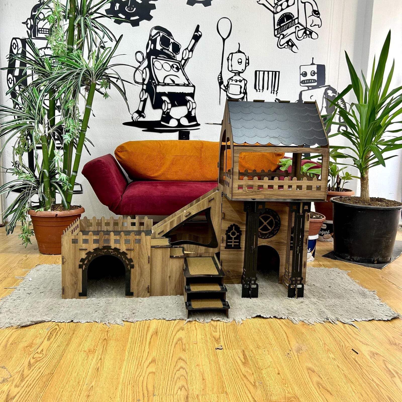 Verwöhnen Sie Ihre kleinen Fellfreunde mit dem luxuriösen Dach?Triplex Kaninchenhaus „Bunny Castle“! Dieses einzigartige 3?stöckige Hasenschloss kombiniert stilvolles Design mit durchdachter Funktionalität: Viel Platz & Abwechslung: Zwei getrennte Bodenräume mit großen Eingängen, überdachte Fenster für Licht und Lüftung, mittig angeordnete Treppe führt zur ersten Terrasse. Weiter führt eine Rampe auf die zweite Ebene und von dort aus auf die beeindruckend große Dachterrasse – perfekt zum Hoppeln und Entspannen. Sicherheit & Stabilität: Jede Ebene ist mit seitlichen Schutzgeländern versehen, das Dach wird von dekorativen Säulen gestützt. Trägt bis zu 10?kg pro Kaninchen – ideal auch für kräftigere Rassen. Wohlfühlfaktor: Unsere handgefertigten Welsoft?Kissen schmiegen sich perfekt an jede Ebene an. Sie bieten Wärme, verhindern Wärmeverlust und lassen sich problemlos in der Maschine waschen. Qualität aus Deutschland: Gefertigt aus hochwertigem, antibakteriellem Sperrholz mit einzigartiger Holzmaserung. Jedes Haus ist ein Unikat! Die 3?mm starken Wände sind dennoch leicht und tragbar. Pflegeleicht & langlebig: Innen und im geschützten Außenbereich nutzbar. Einfach mit einem feuchten Tuch abwischen. Verpackt, gereinigt und vormontiert verschickt – Sie setzen nur noch die Bauteile zusammen, Schloss für Schloss. Lieferumfang Zerlegtes Triplex?Kaninchenhaus aus Sperrholz Montageschlösser Detaillierte Montageanleitung Gönnen Sie Ihren Kaninchen das ultimative Zuhause – ein Hasenparadies zum Hoppeln, Loungen und Träumen!