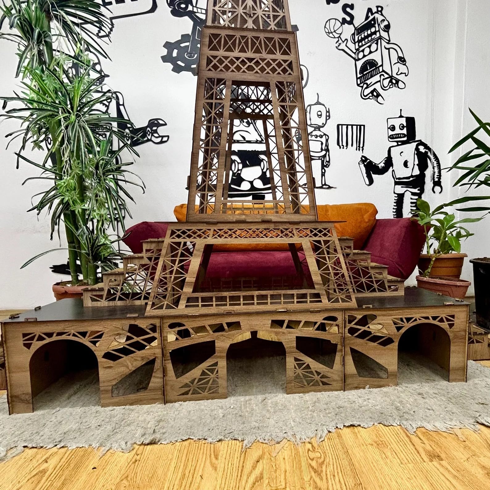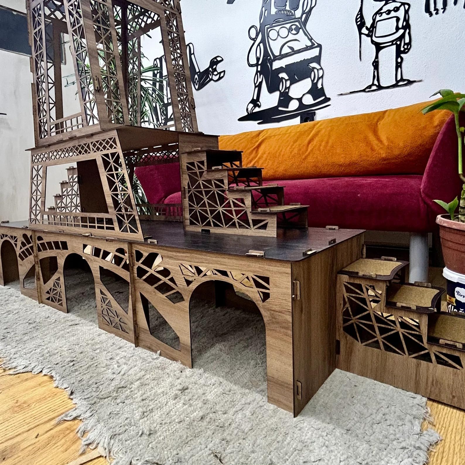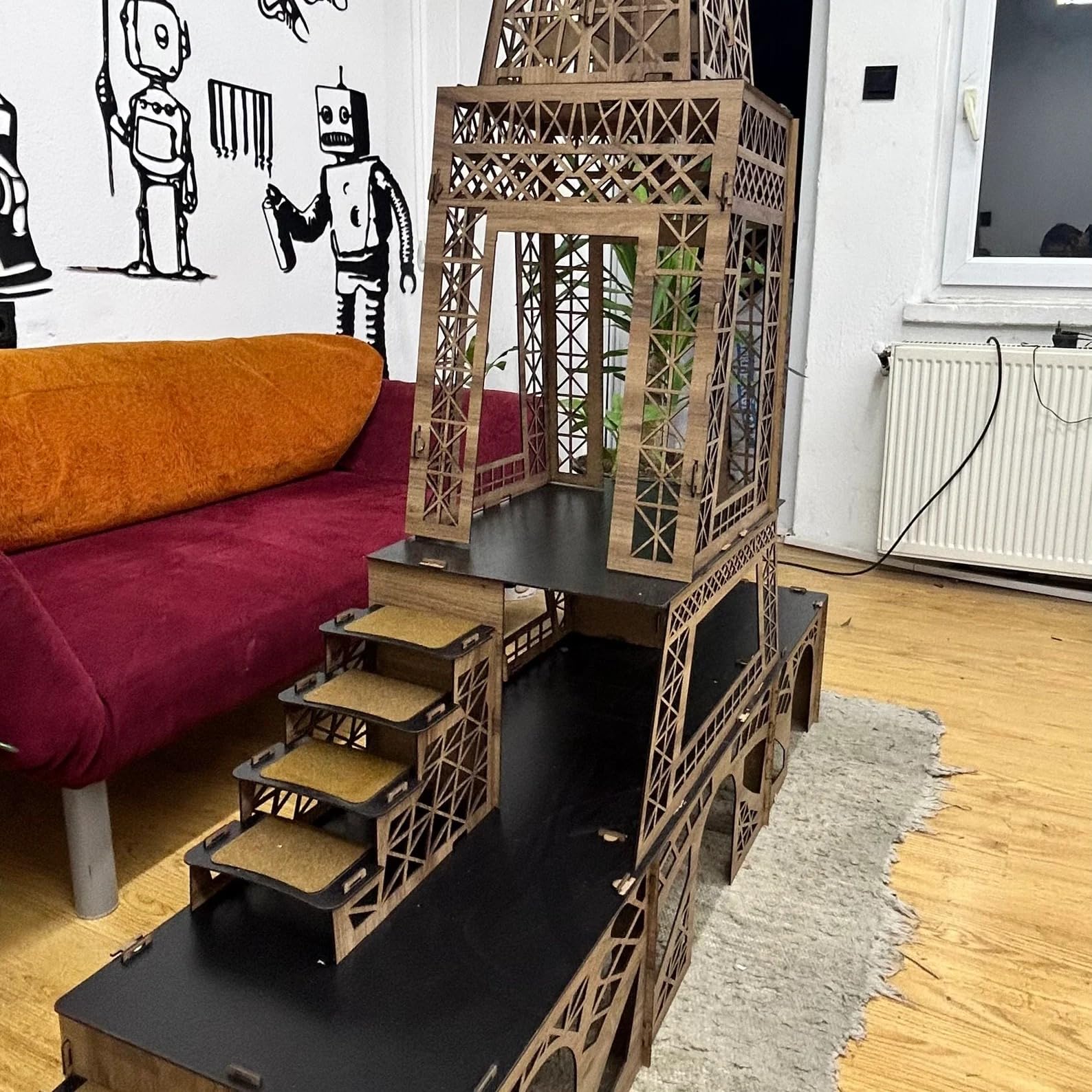 Ein Zuhause mit Stil, Raum und Herz – das Eiffelturm Kaninchenhaus Verleihen Sie Ihrem Kaninchen ein Stück Paris mit unserem exklusiven, handgefertigten Eiffelturm Hasenhaus. Inspiriert vom ikonischen Wahrzeichen Frankreichs wurde dieses dreistöckige Meisterwerk speziell für Kaninchen und andere Kleintiere entwickelt, um ihnen ein Zuhause voller Komfort, Sicherheit und Abenteuerlust zu bieten. ? Architektur trifft Funktionalität Mit seinen drei Ebenen, Rampen auf beiden Seiten und großzügigen Eingängen bietet dieses Haus ideale Voraussetzungen für Bewegung, Rückzug und Spiel. Das markante Design schafft nicht nur ein visuelles Highlight in Ihrem Zuhause, sondern auch einen Wohlfühlort für Ihre Tiere. ? Gesundheitlich unbedenklich & zertifiziert Das stabile 3?mm MDF ist glatt, splitterfrei und antibakteriell beschichtet – geprüft nach internationalen Gesundheitsstandards. Sie können sicher sein, dass Ihre Lieblinge in einer geschützten Umgebung leben. ? Praktisch & flexibel Dank seines zerlegbaren Stecksystems lässt sich das Haus schnell aufbauen oder verstauen. Ideal für wechselnde Standorte oder Umzüge – Ihre Kaninchen müssen auf ihren Lieblingsplatz nie verzichten. Schenken Sie Ihrem Kaninchen mehr als nur ein Haus – schenken Sie ihm ein Erlebnis. Das Eiffelturm Kaninchenhaus verbindet ästhetisches Design, durchdachte Funktionalität und geprüfte Sicherheit zu einem ganz besonderen Lebensraum für Ihre kleinen Gefährten.