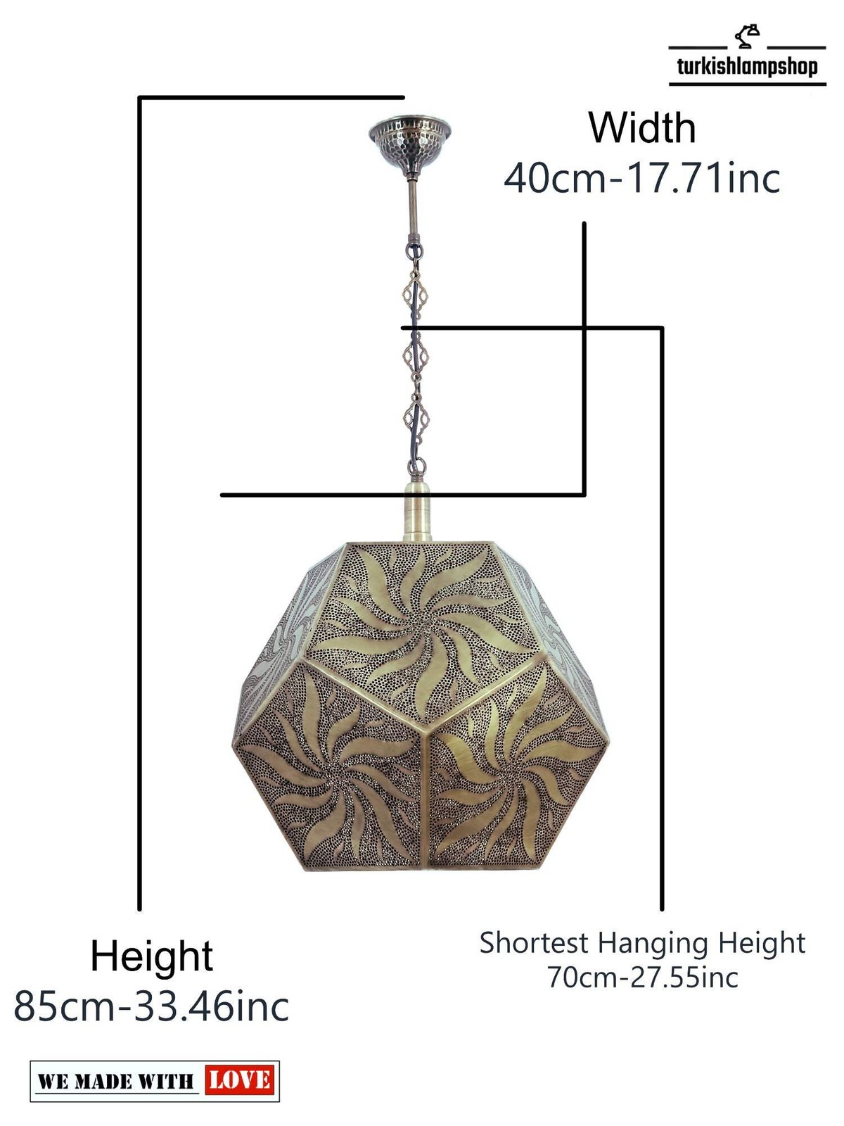 Firstly the hallway lamp moroccan lantern light pattern shadow adds an elegant touch to any hallway. Thus Featuring a intricate Moroccan lantern-style pattern, it casts a subtle, soft light that creates a beautiful, ambient atmosphere. Both visually pleasing and functional, it’s the perfect addition to your hallway.After that illuminate your home with a touch of exotic beauty. Especially our hallway lamp moroccan lantern light casts a warm, captivating shadow pattern that transforms any room into a magical, vibrant atmosphere. Thus make a statement with this unique lighting fixture and enjoy a timeless piece of art.Finally welcome guests to your home with this exotic hall entrance lamp. Its moroccan lantern light pattern shadow projects warm and cozy lighting for an inviting atmosphere. Shortly create a comfortable ambiance and add a touch of exotic appeal to your entryway.DIMENSIONSHeight : 85cm-33.46incWidth : 40cm-17.71incNot Chain Height : 55cm-21.65incShortest Hanging Height : 70cm-27.55incELECTRIC DETAILSVoltage : 110V for US – 220V for UK & EUPower source : With cable from ceilingBULB DETAILSType : E-26 socket for US – E-27 socket for UK and EU.Qty : 1Maximum Walt : 40wBULB NOT INCLUDEDSHIPMENT DETAILSThe product is handmade and the production time is 10 days, shipping is free. Please contact me if you do not receive your order within 15 days, i’ll look into it and help.PERSONALIZEYou can customize our products in width, length and color as you wish, please contact us forthis.Most importantly, we can make a custom 3D design. In the same way, after the design, you can see the picture and video of the.METARIAL Moroccan pattern sheet metal Plastering Metal Chain Cable
