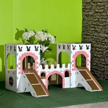 Das weiß-rosa Kaninchenschloss im mittelalterlichen Stil mit zwei Türmen, die durch eine geräumige Terrasse verbunden sind, bietet Ihren Kaninchen ein elegantes und komfortables Zuhause.