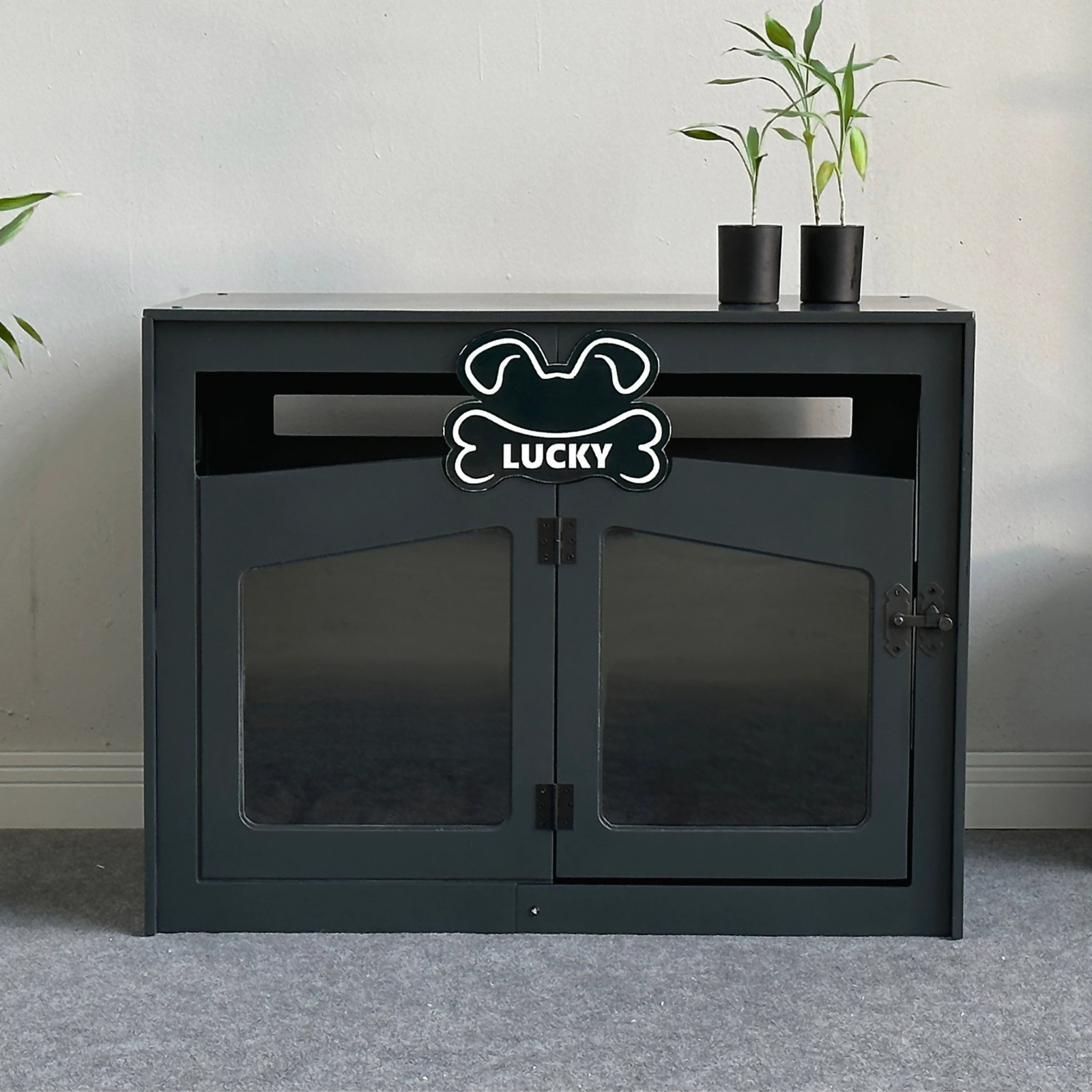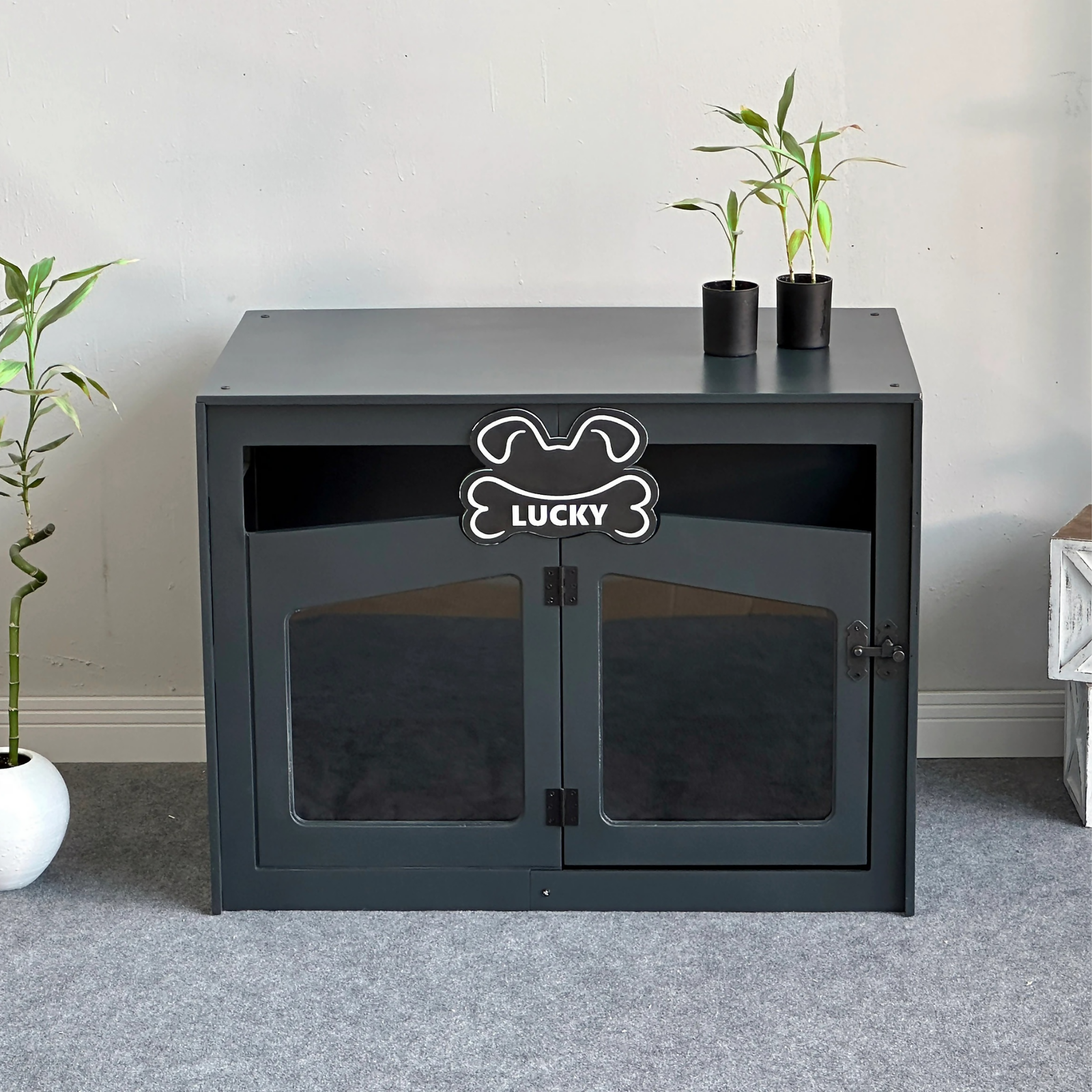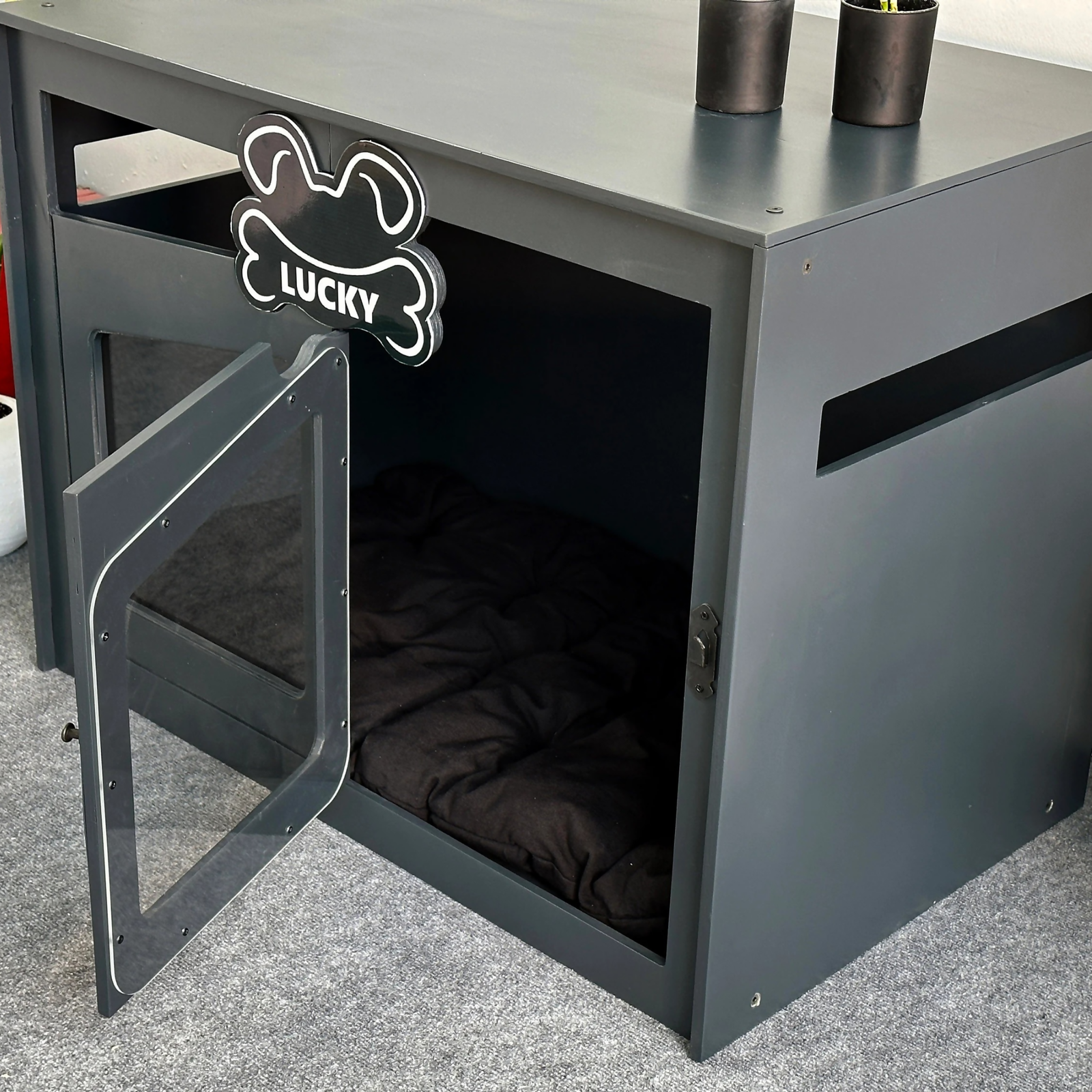 Hundehuette Pawloft Dunkelgrau aus Holz mit personalisiertem Namensschild und Ki
