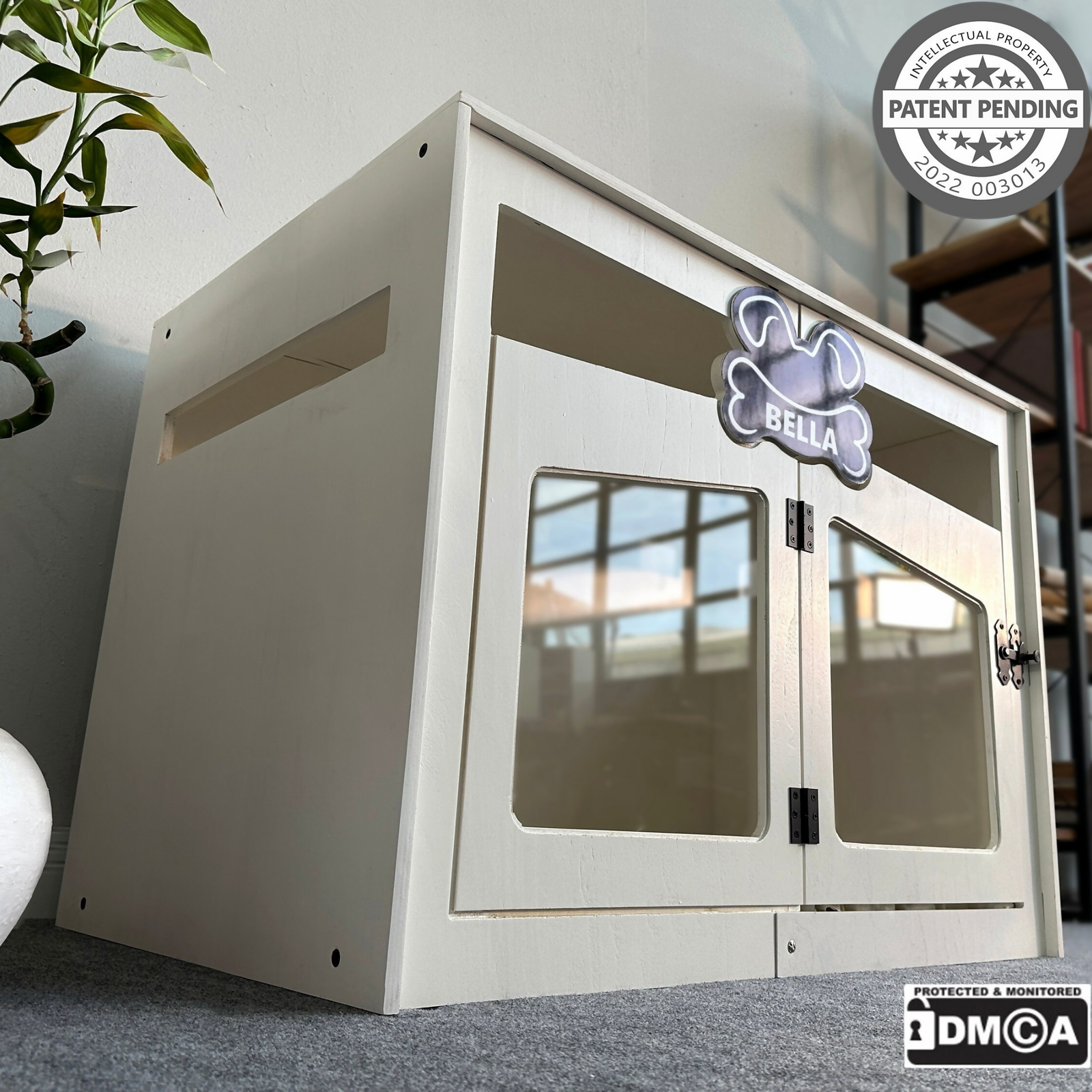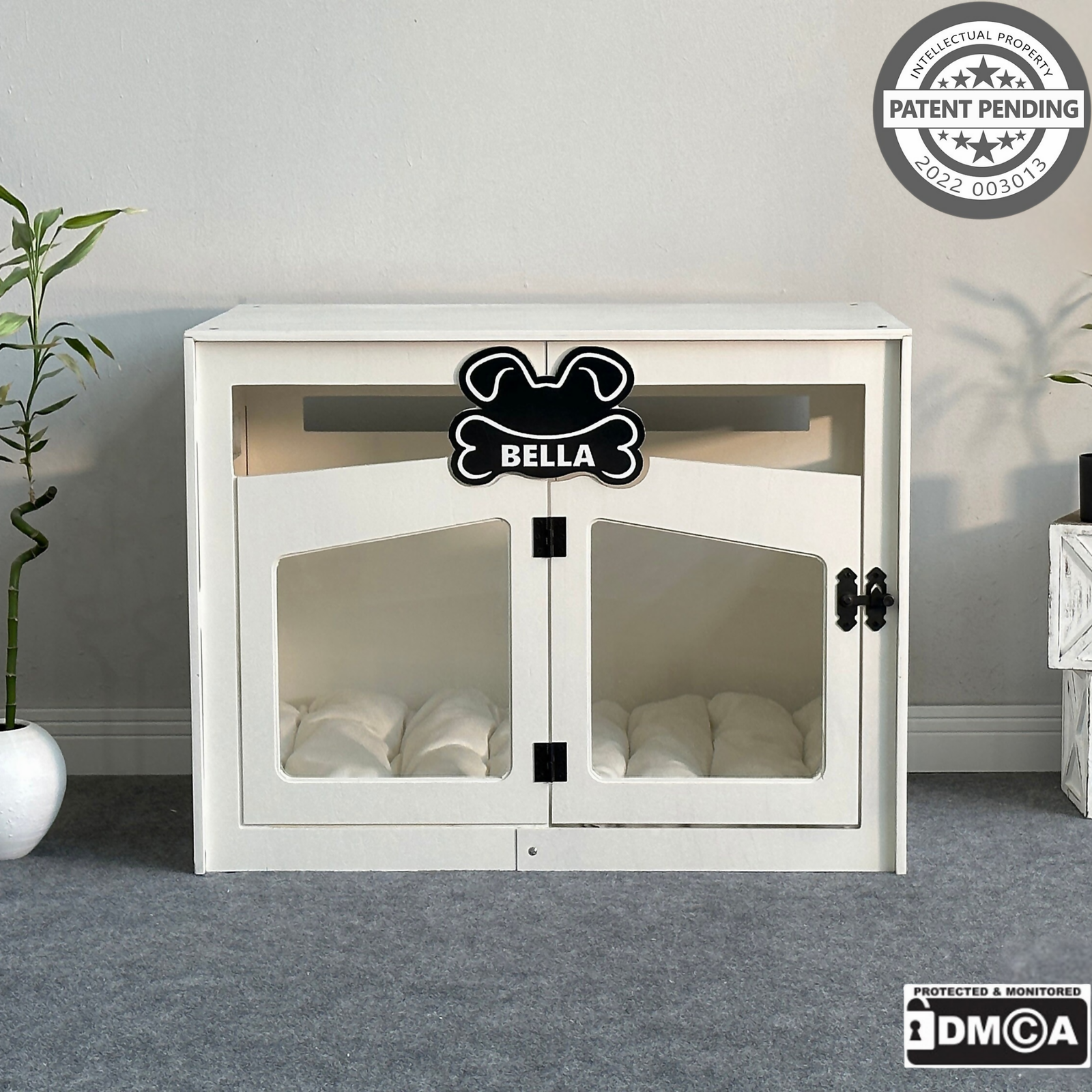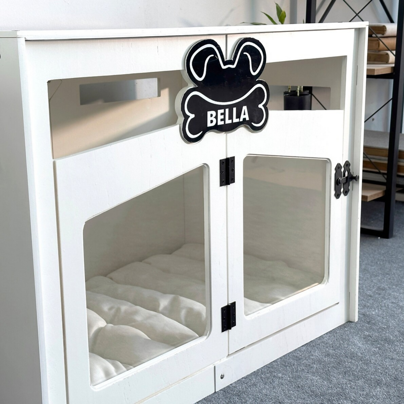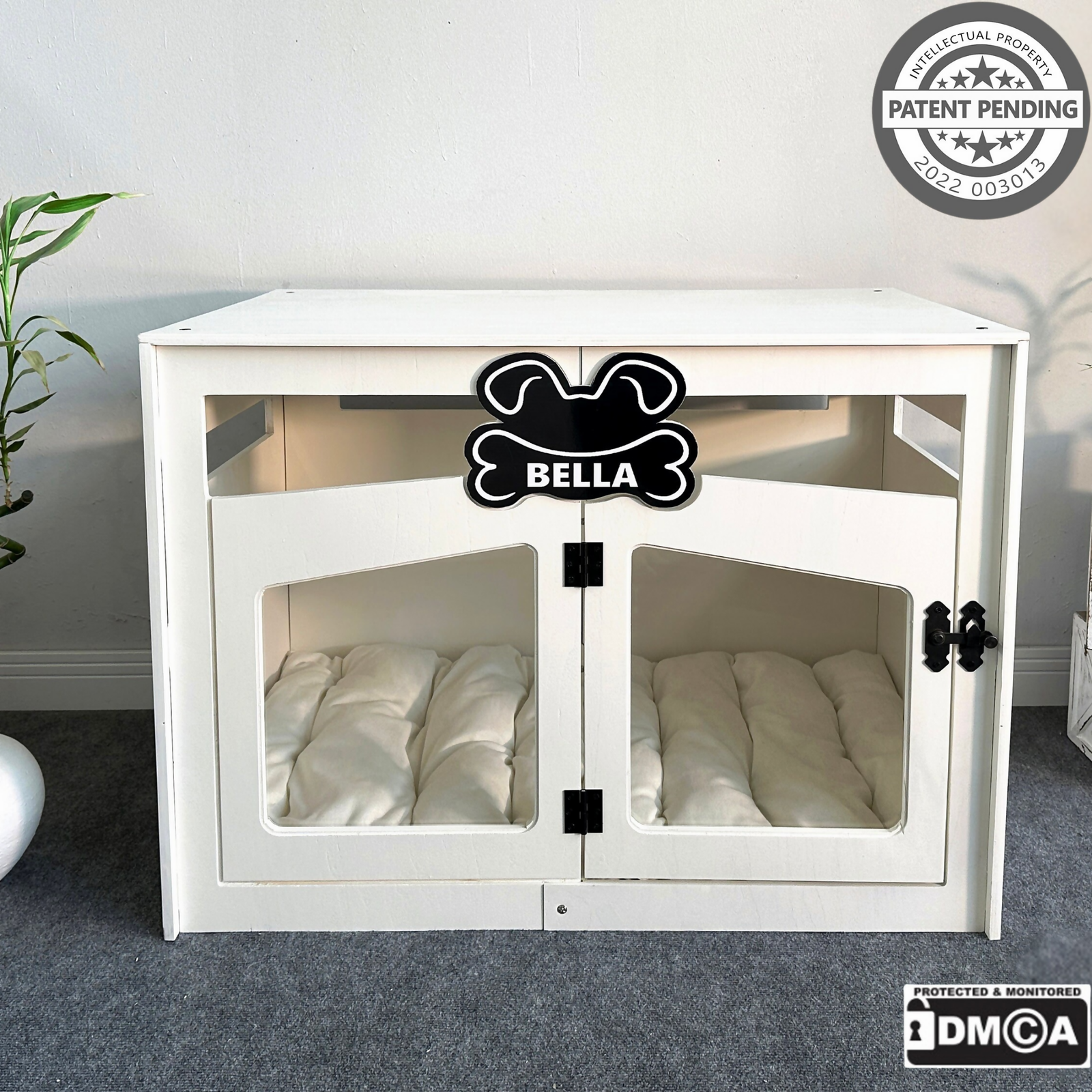 Hundehuette Pawloft Weiss aus Holz mit personalisiertem Namensschild und Kissen