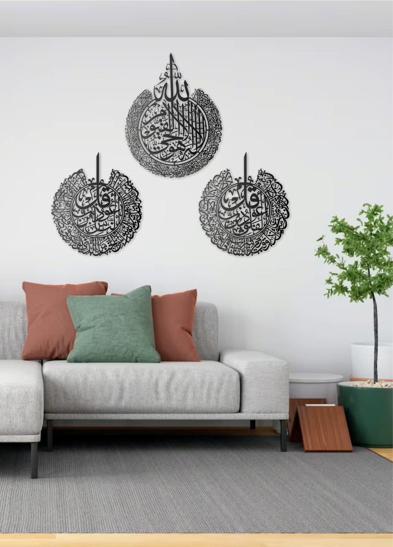 Islamische Wandkunst aus Metall – 3er Set „Ayatul Kursi, Al-Falaq & An-Nas“ – Arabische Kalligraphie – Moderne Muslimische Wanddekoration – Islamische Kunst für Zuhause, Büro & Gebetsraum (118×152 cm)