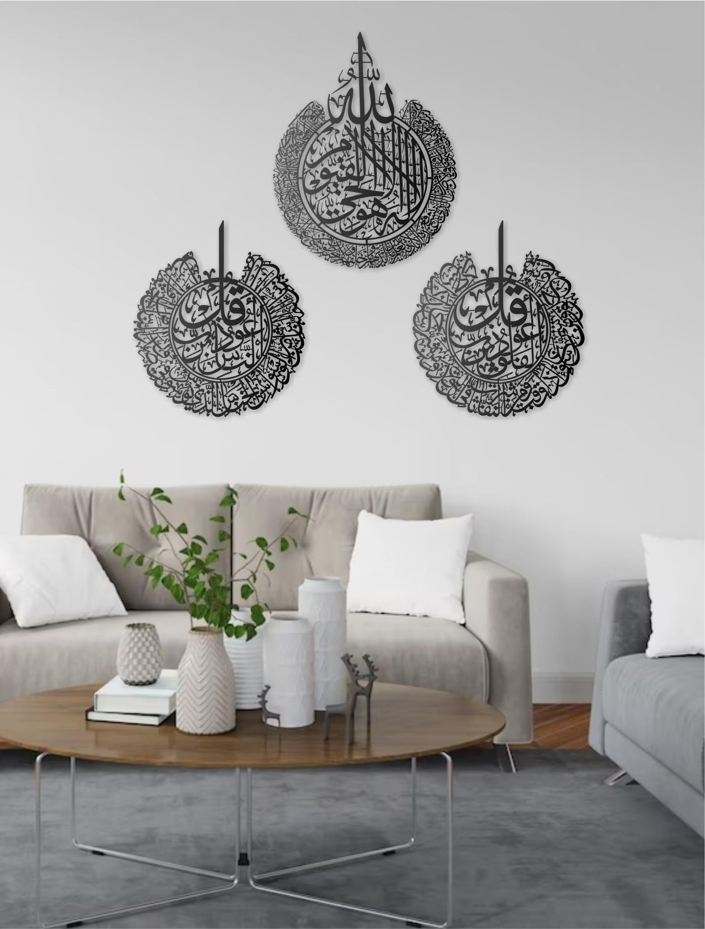 Islamische Wandkunst aus Metall – 3er Set „Ayatul Kursi, Al-Falaq & An-Nas“ – Arabische Kalligraphie – Moderne Muslimische Wanddekoration – Islamische Kunst für Zuhause, Büro & Gebetsraum (140×180 cm)