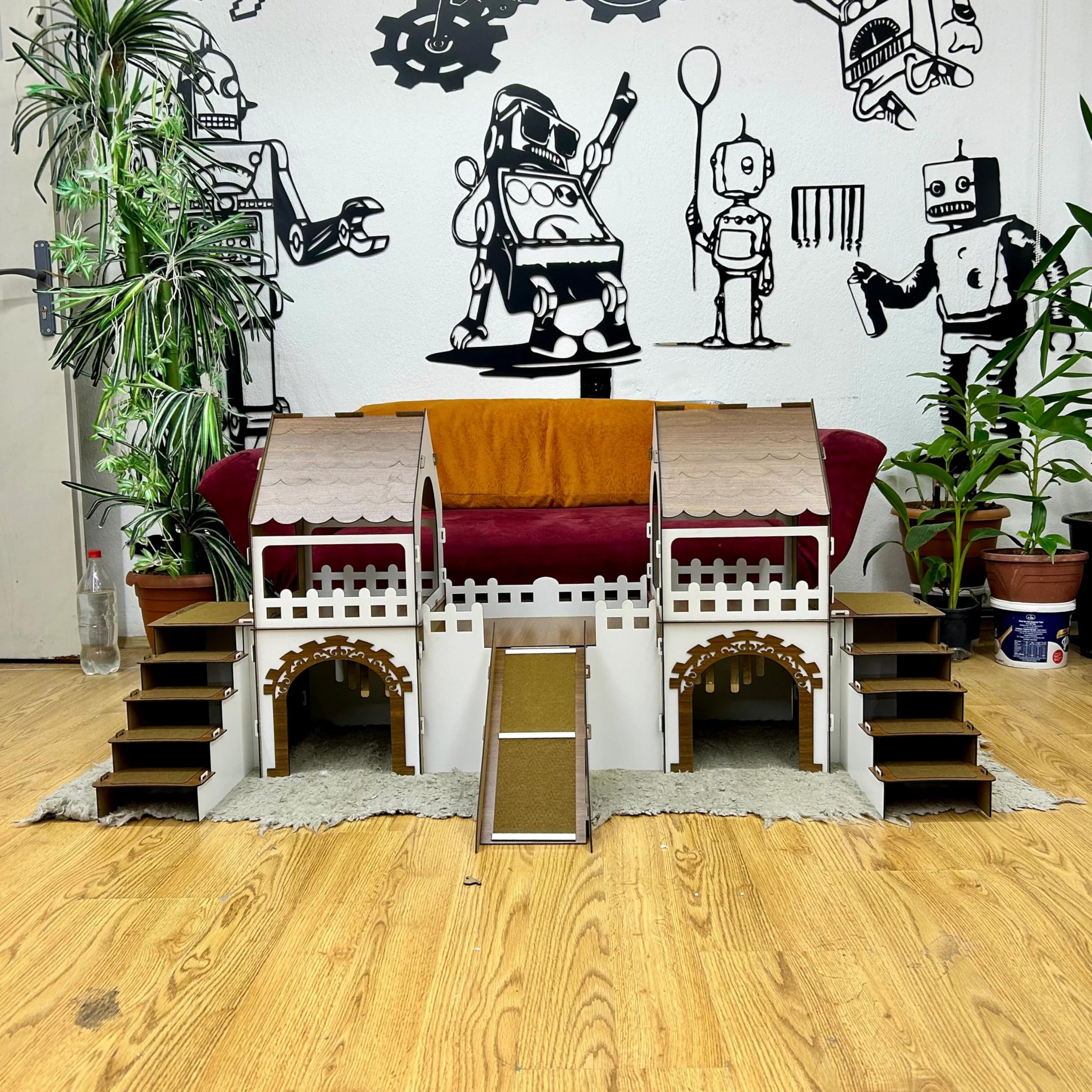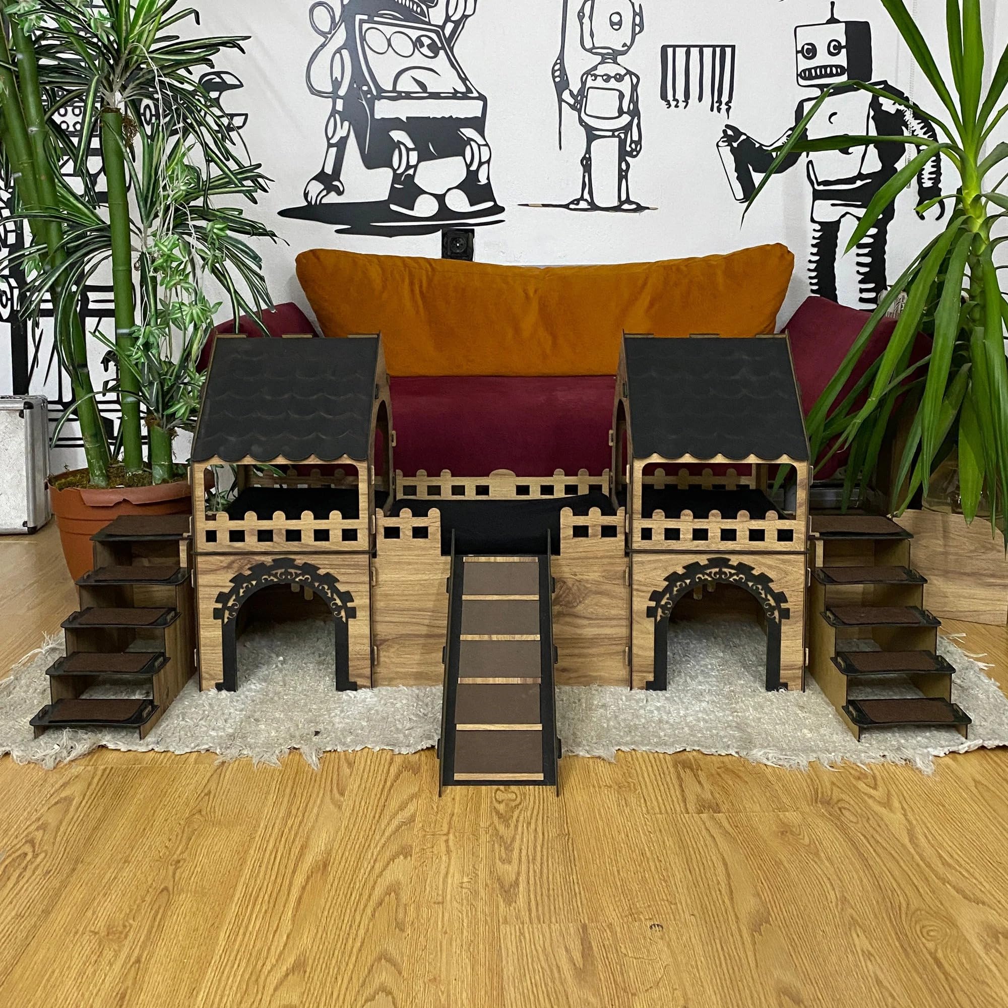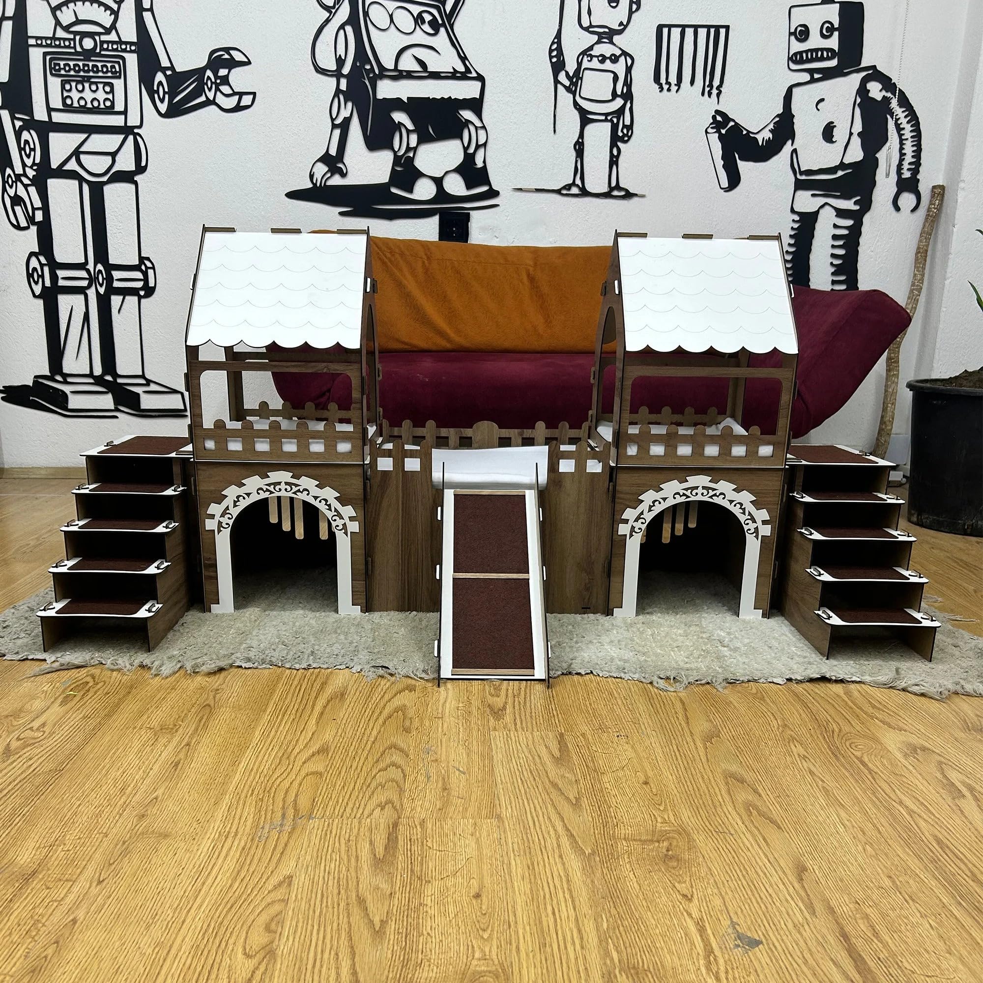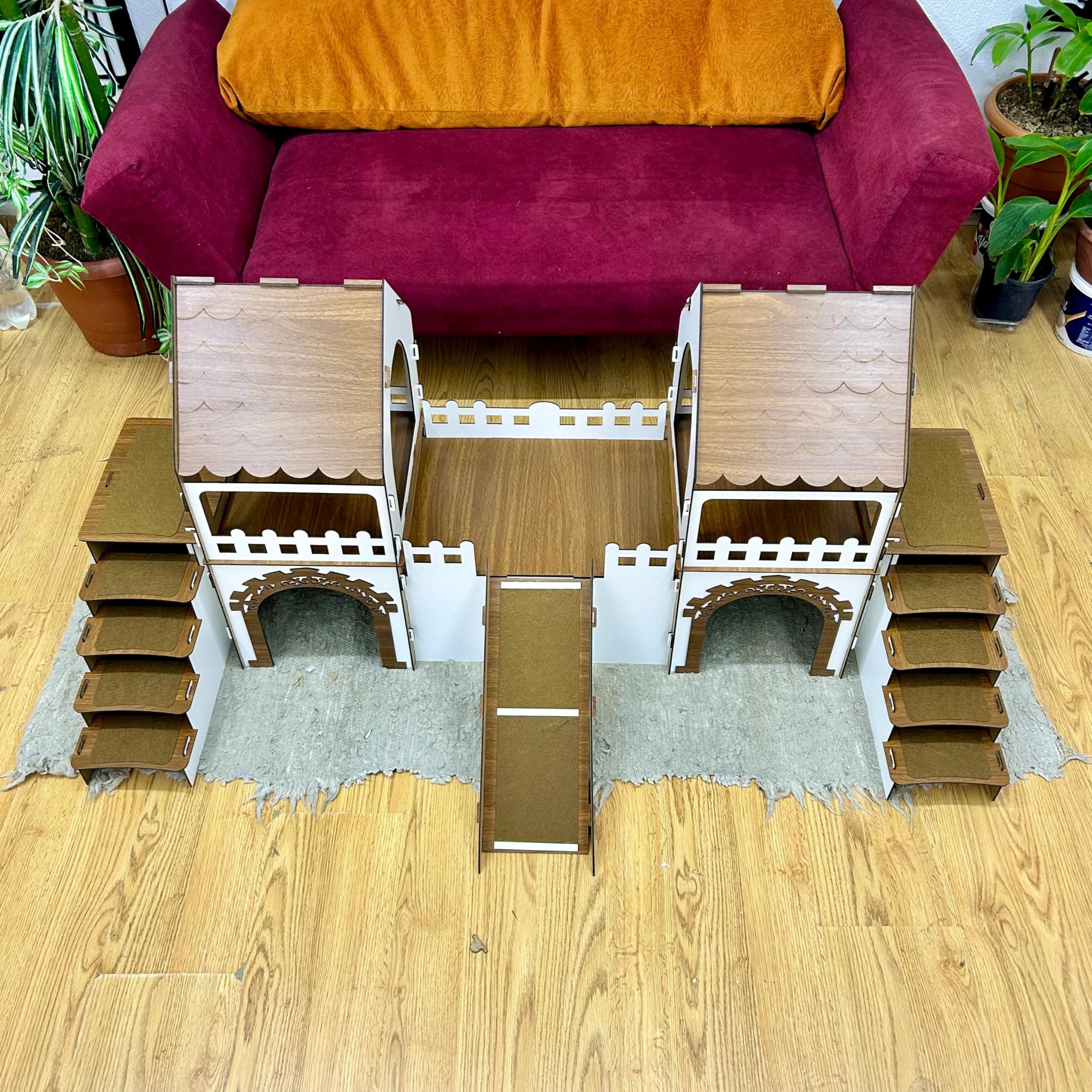 ? Ein Königreich für Ihre Kaninchen Verwandeln Sie den Alltag Ihrer Kaninchen in ein Abenteuer mit dieser detailverliebten, zweistöckigen Kaninchenburg mit Holzbrücke und Terrasse! Ob zum Spielen, Verstecken oder Dösen – dieses geräumige Haus bietet alles, was kleine Fellnasen brauchen. ? Durchdachtes Design auf 2 Ebenen Die Burg besteht aus zwei Seitentürmen und einem mittleren Bereich, die durch eine sichere, rutschfeste Rampe verbunden sind. Dank Treppen an beiden Seiten gelangen Ihre Tiere bequem in die obere Etage. Große Eingänge sorgen für einen leichten Zugang und gute Luftzirkulation. ?? Inklusive passendem Kuschelkissen Das mitgelieferte Kissen wurde speziell für die Burgmaß gefertigt. Aus antibakteriellem, weichem Welsoft-Stoff – maschinenwaschbar bei 30?°C und ohne Bügeln wieder einsatzbereit! ? Langlebig & natürlich schön Gefertigt aus hochwertigem, 3?mm starkem Sperrholz – zertifiziert, antibakteriell und umweltfreundlich. Die natürliche Maserung des Holzes macht jede Burg zu einem Unikat. ? Produktmaße: Höhe: 57?cm Gesamtbreite: 147?cm x 35?cm Mittelteil: 30?x?40?cm Rampenlänge: 40?cm, Rampenbreite: 16?cm ? Pflegeleicht & praktisch Das Haus lässt sich schnell montieren, ist leicht zu reinigen (einfach feucht abwischen) und für den Innenbereich ideal. Hinweis: Anfangs kann durch das Laserschneiden ein leichter Holzgeruch wahrnehmbar sein – dieser verflüchtigt sich innerhalb weniger Tage. Gönnen Sie Ihren Kaninchenein Zuhause, das mehr ist als nur ein Käfig – schenken Sie ihnen ein Schloss voller Abenteuer, Komfort und Stil