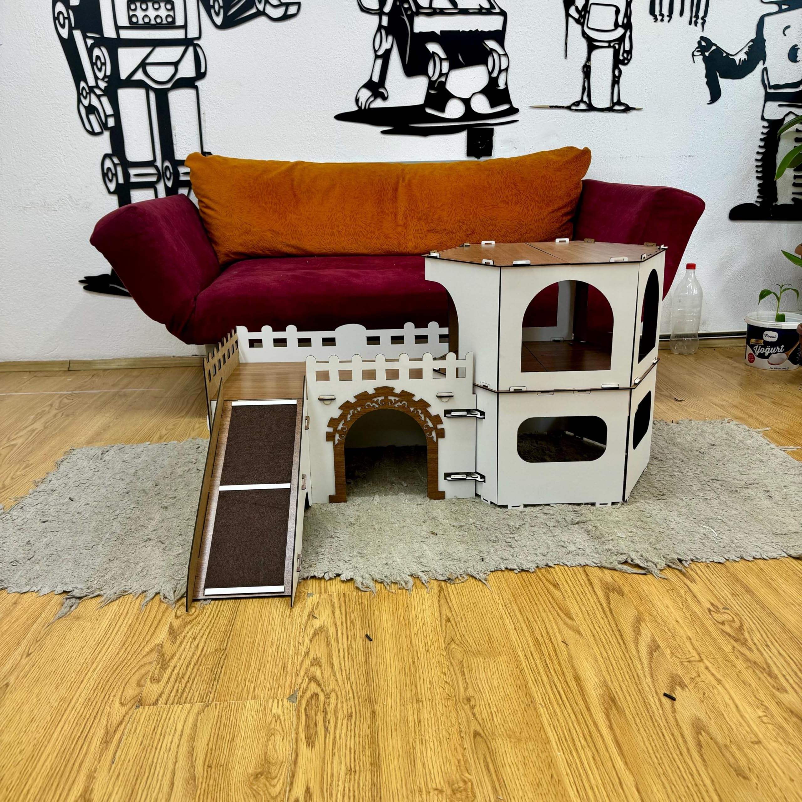 Das CASTEL Katzenhaus bietet auf zwei Etagen einen gemütlichen Rückzugsort und gleichzeitig einen spannenden Spielbereich für Ihre Katze. Das sechseckige Design sorgt für eine optimale Raumnutzung und fügt sich stilvoll in jede Wohnung ein. Gefertigt aus 3 mm starkem, zertifiziertem MDF, ist das Haus stabil, antibakteriell und sicher für Ihre Katze. Die beiden Rampen ermöglichen einen einfachen Zugang zur oberen Etage. Das Design ist zerlegbar, wodurch es besonders praktisch beim Transport oder Umstellen ist. Maße: Höhe: 53 cm Breite: 100 x 40 cm Geeignet für den Innenbereich. Reinigung mit einem feuchten Tuch. Montageanleitung liegt bei.