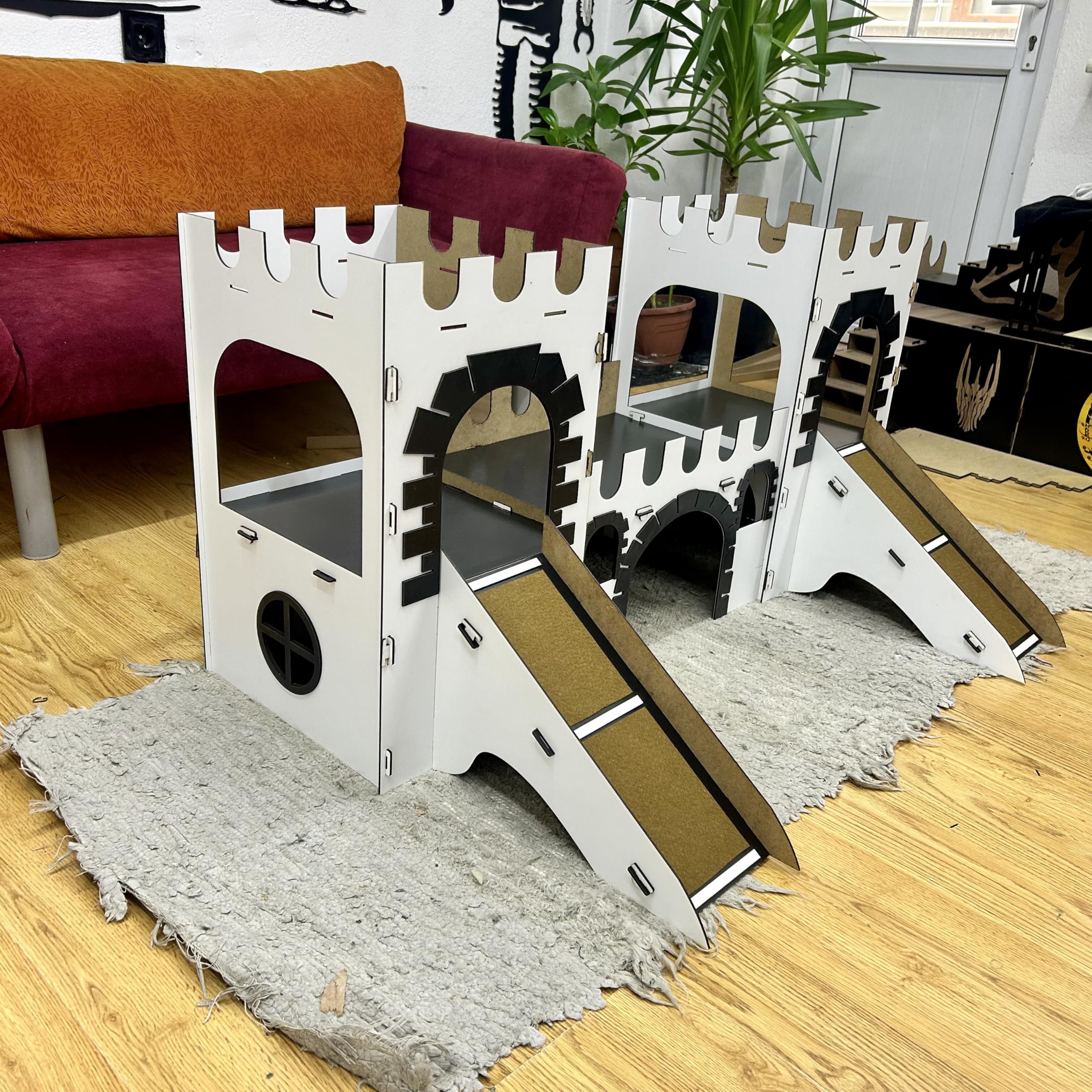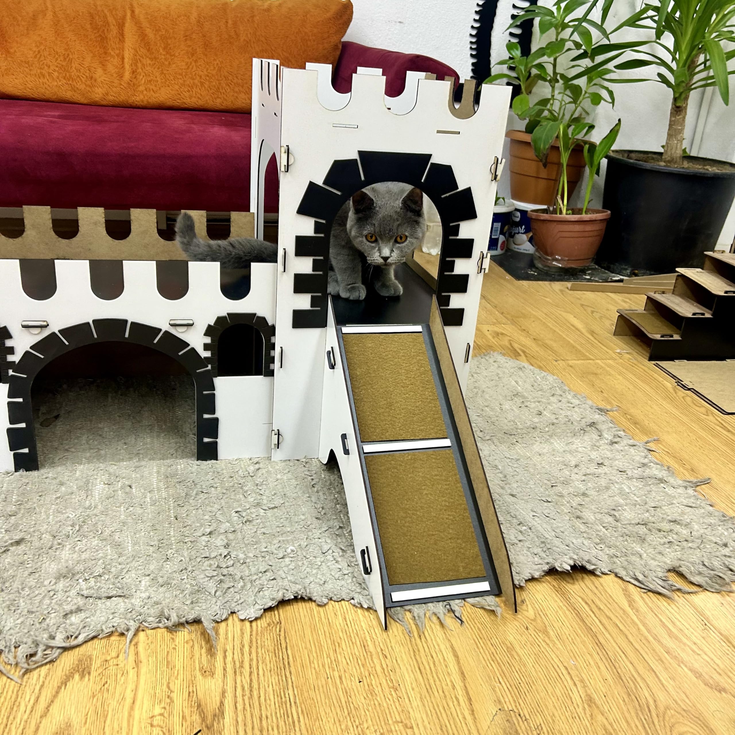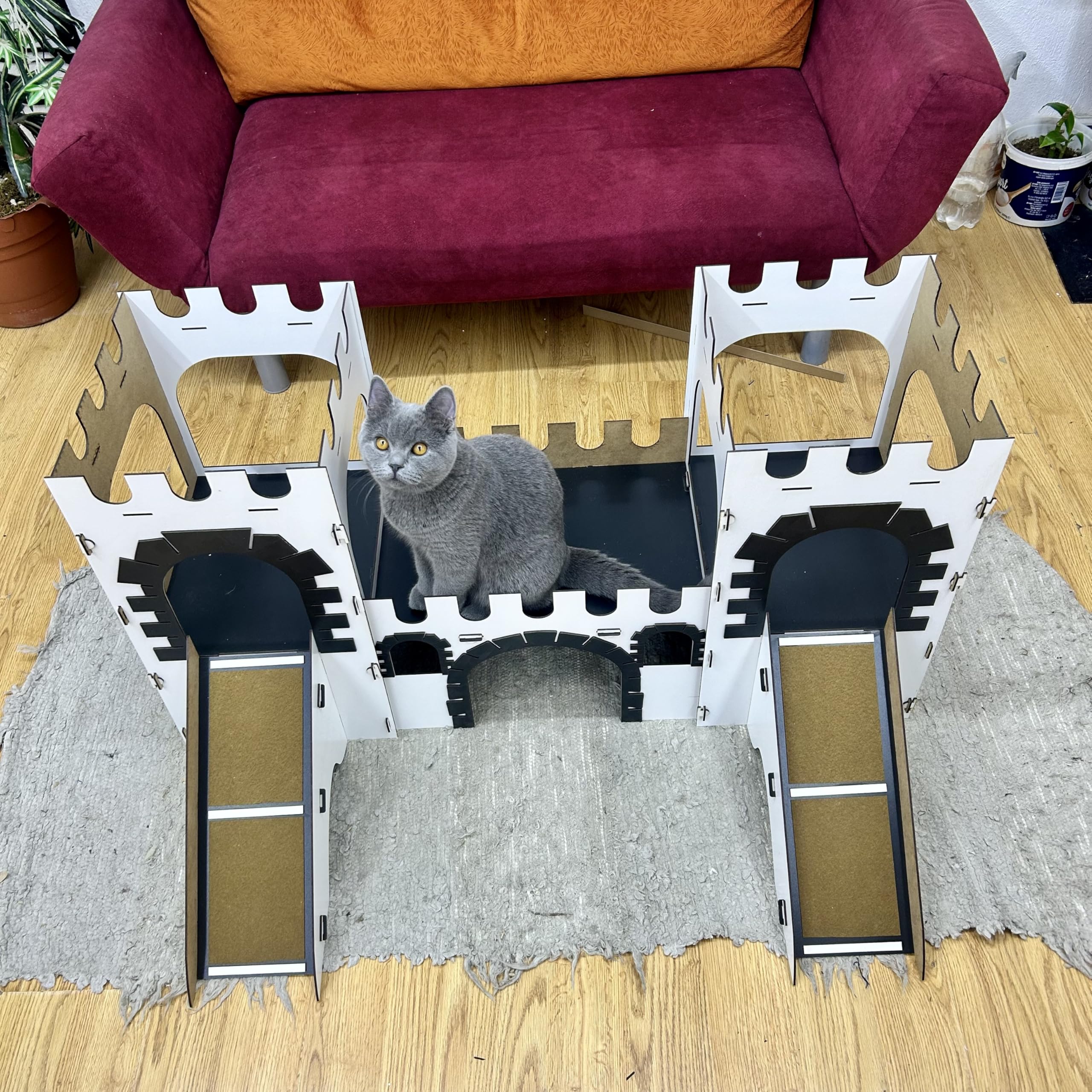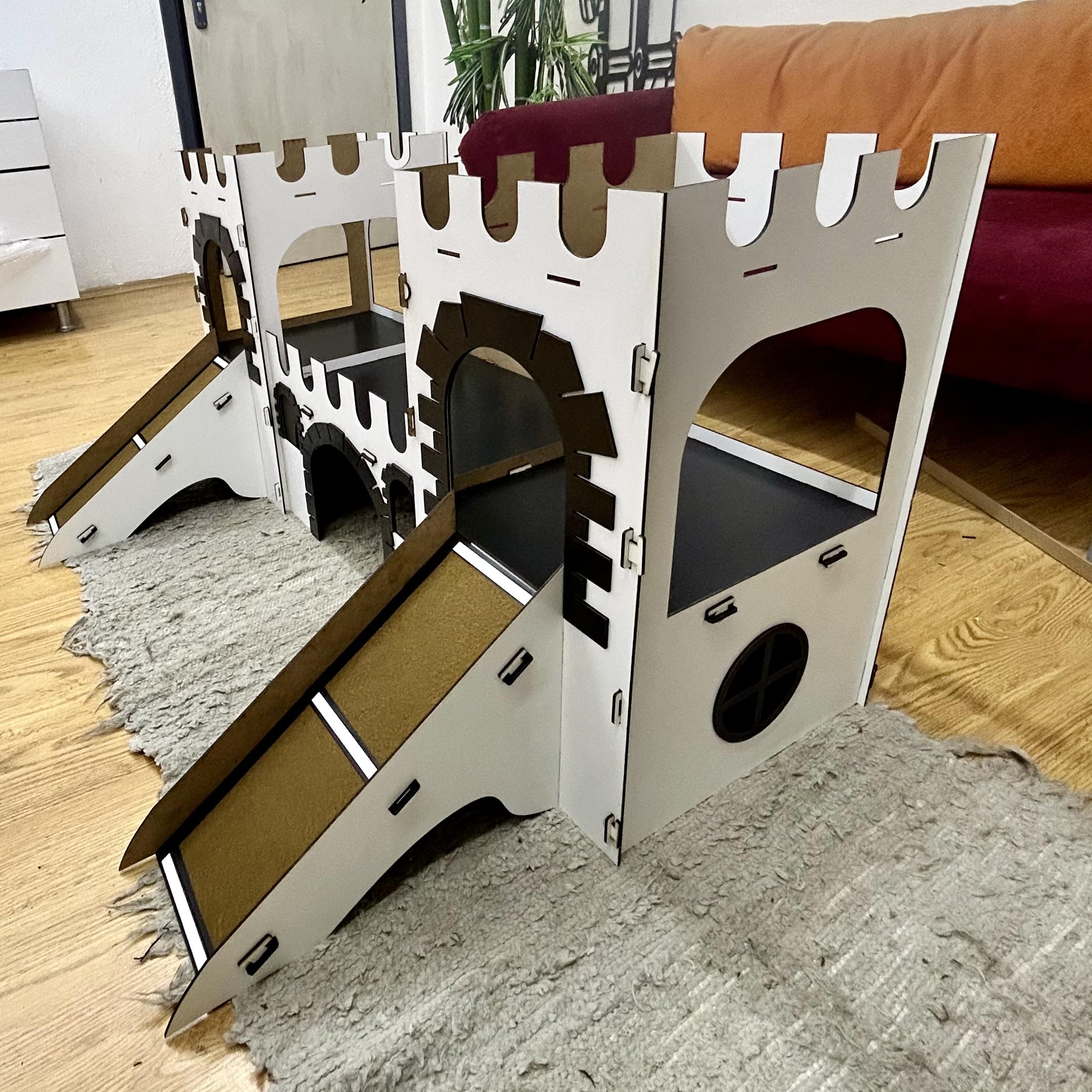 ??? 2-STÖCKIG MIT HOLZBRÜCKE, 4 ZIMMER, GEEIGNET FÜR KATZENFAMILIEN, KATZENHAUS IM ZWEITURENSTIL, EIN PARADIES FÜR KATZEN ??? ??? Bitte lesen Sie die vollständige Beschreibung!!! ??? ? Dieses Haus bietet Platz für bis zu 2 Katzen und versorgt sie mit reichlich Wohnraum und einem Spielplatz. Dieses große Katzenhaus mit 2 Etagen, Treppen und einer Terrasse – ein platzsparender, stilvoller, leichter und einfach zu transportierender Zufluchtsort – wird sowohl Ihnen als auch Ihren Katzenfreunden Freude bereiten. Es ist auch für Katzen mit einem Gewicht von bis zu etwa 10 kg geeignet. Das ist einfach perfekt! ? ?Merkmale des Erdgeschosses: Die Eingangstür ist recht breit und gewährleistet einen einfachen Zugang. Öffnungen auf beiden Seiten sorgen für viel Licht und frische Luft. Das Schloss hat Eingänge auf beiden Seiten und ist von innen mit der Mitte verbunden. ?? ?Merkmale der Brücke: Die Brücke ist recht breit und elegant und verfügt über stilvolle Schutzvorrichtungen, um Stürze von den Seiten zu verhindern. ?Merkmale des Obergeschosses: Treppen auf beiden Seiten und in der Mitte erleichtern den Katzen den Aufstieg. Die Treppen und die Rampe sind mit rutschfestem Filz überzogen. Dies ist ein wunderschön gestaltetes zweistöckiges Katzenhaus aus Holz, das aus 3 mm starken Sperrholzplatten gefertigt wurde. ?Maße des Katzenburg: Höhe: 57 cm / 22,4“ Gesamtbreite: 136 cm x 35 cm Breite des unteren Eckbereichs: 27 cm x 26 cm Breite des oberen Eckbereichs: 27 cm x 36 cm Brückenlänge: 53 cm / 20,9“ Brückenbreite: 31 cm / 12,2“ ?Material: Unser oberstes Ziel ist es, dass unsere Katzenfreunde ein gesundes und glückliches Leben führen. In diesem Zusammenhang fertigen wir Haustierburgen aus Sperrholz. Das gesamte Sperrholz ist zertifiziert, von höchster Qualität und antibakteriell. Die Einzigartigkeit von Holz liegt in der unverwechselbaren Maserung jedes einzelnen Stücks, wodurch jedes Produkt zu einem Unikat wird. Die Wandstärke beträgt 3 mm. (Hinweis: Zertifikate über die verwendeten Materialien können auf Anfrage zur Verfügung gestellt werden.) ? ?Zusätzliche Informationen zur Einrichtung: 1- Wir wischen das Produkt gründlich mit einem Seifentuch ab, verpacken es sicher und versenden es. Wenn das Produkt bei Ihnen eintrifft, können Sie es ohne Bedenken verwenden. 2- Achten Sie auf die richtige Platzierung der Kerben! 3- Schlösser sind im Lieferumfang enthalten! Kleine Teile auf einem kleinen Teller. Setzen Sie diese Teile am Ende der Installation in die Löcher ein. Es kann sein, dass sie anfangs nicht richtig sitzen, aber sie werden fest sitzen. Hinweis: Nach Abschluss der Installation denken Sie bitte daran, Fotos zu machen und uns Feedback zu geben. ?????? ?Pflege des Katzenkastells: Sie können es ganz einfach mit einem feuchten Tuch reinigen. Es ist für den Innen- und Außenbereich geeignet, aber achten Sie darauf, es nicht im Regen oder in direktem Sonnenlicht stehen zu lassen. Es wird zerlegt versandt. Die Installation ist unkompliziert, eine Montageanleitung liegt bei. Bei Fragen können Sie sich gerne an uns wenden. ? Hinweis: Da die Häuser lasergeschnitten sind, kann es anfangs zu einem Brandgeruch kommen. Um diesen Geruch zu minimieren, wischen wir es mit einem Seifentuch ab und lüften es. Da es jedoch verpackt ist und etwa eine Woche lang transportiert wird, kann es beim ersten Öffnen zu einem leichten Geruch kommen. Der Geruch verflüchtigt sich nach einigen Tagen nach der Installation. VIELEN DANK FÜR IHREN BESUCH IN UNSEREM SHOP, VIEL SPASS BEIM EINKAUFEN! ???