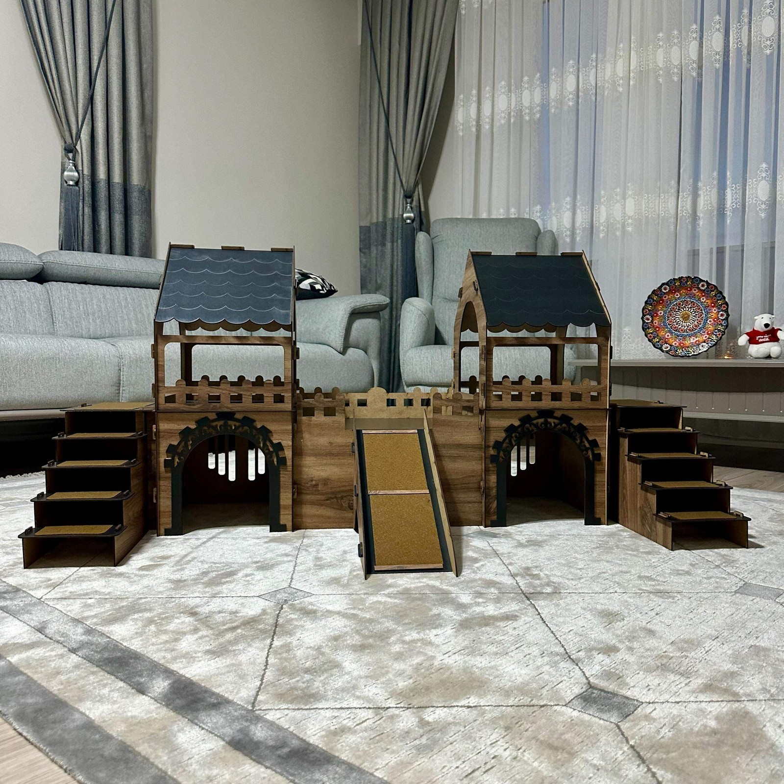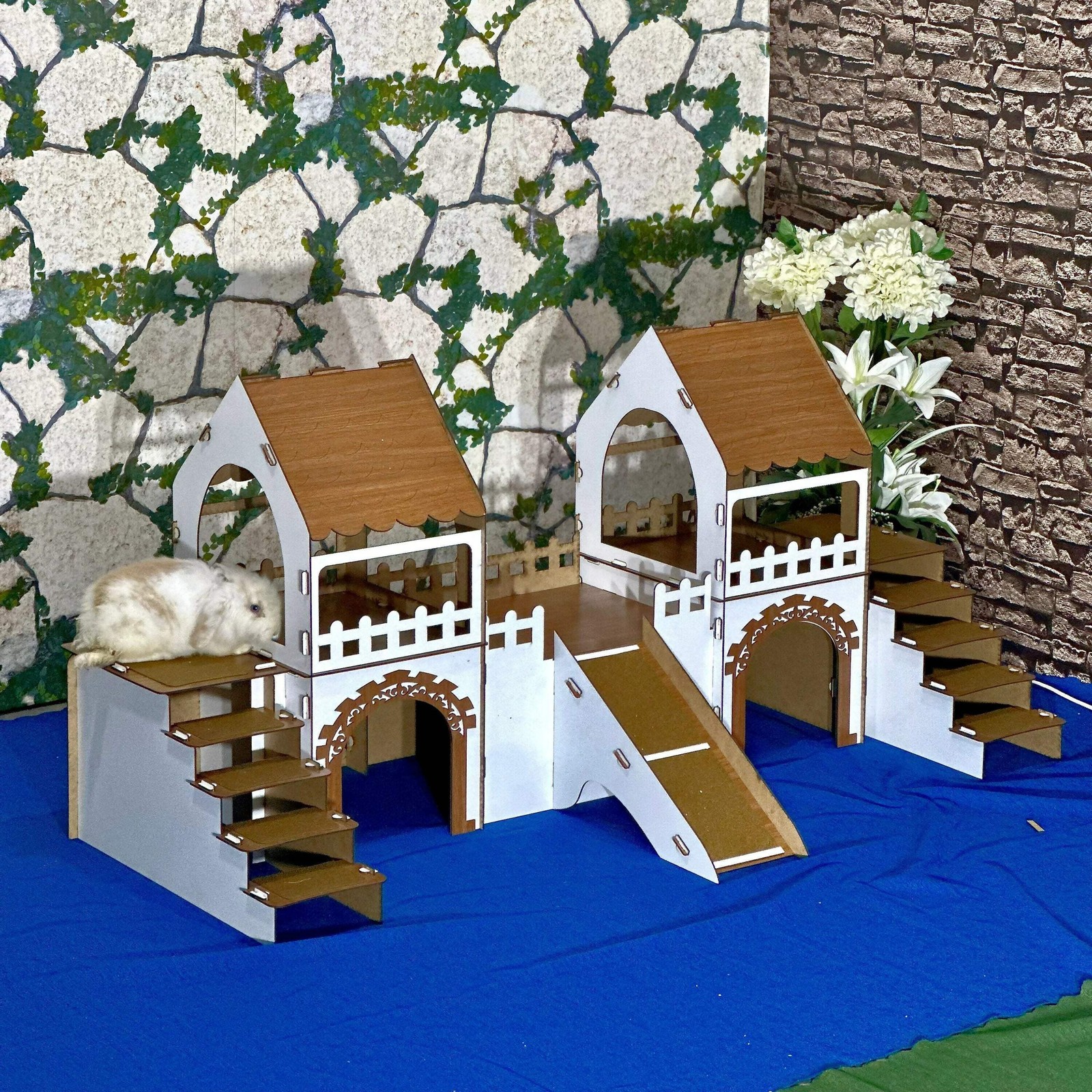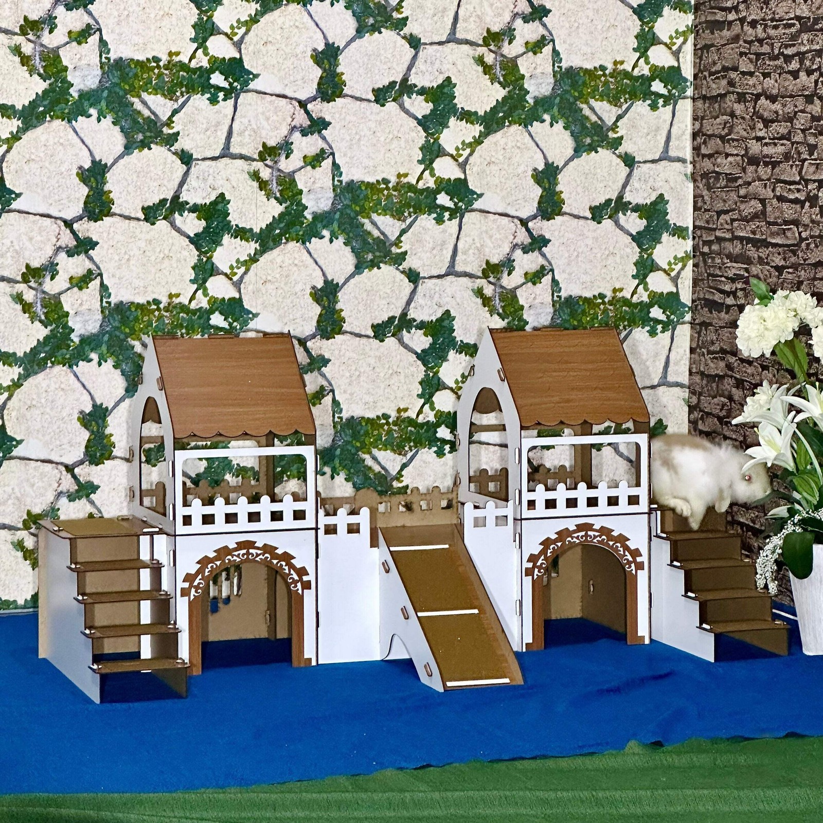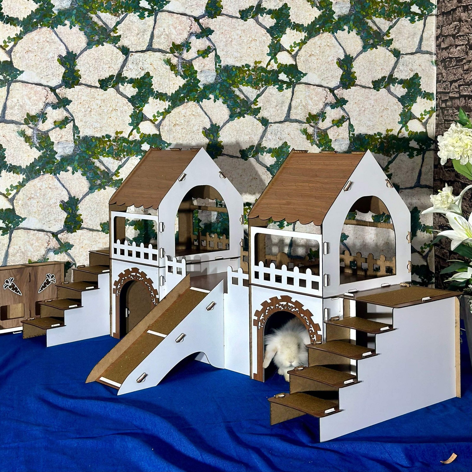 Hasenschloss mit Terrasse und zwei Türmen, Hasenpalast aus weißem Walnussholz: Eine luxuriöse Residenz mit drei Treppen und drei Zimmern 🐇🐰🏠🏰❣️
