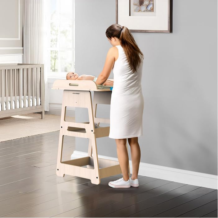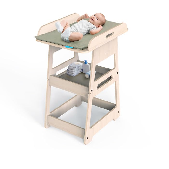 Mamatoyz – 19CFLAT – Wickelauflage für Neugeborene, wasserdichte Matratze inklusive, Wickelunterlage umwandelbar in Tisch und Kinderstuhl, Ablageflächen für Zubehör, Birkenholz