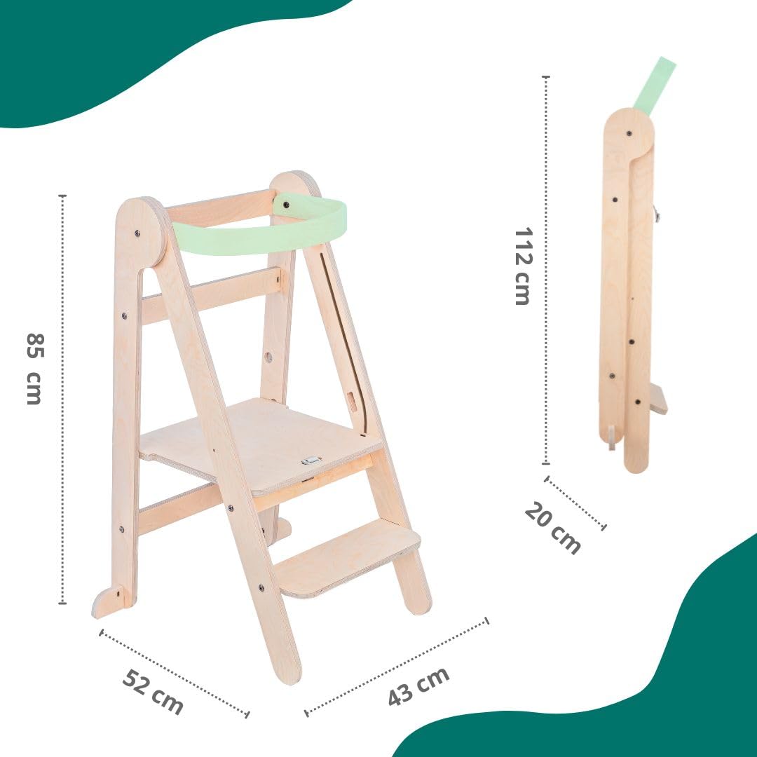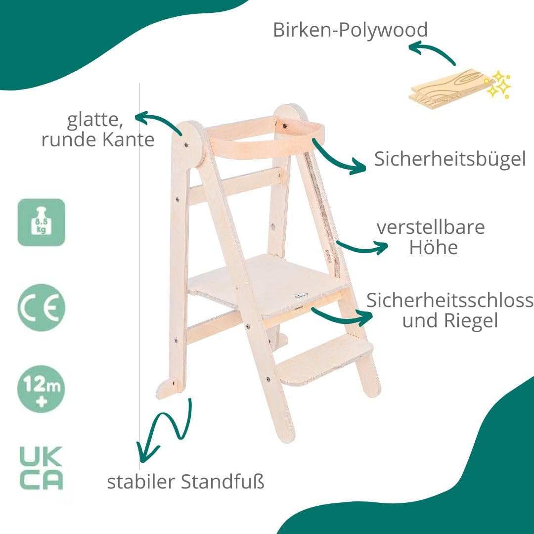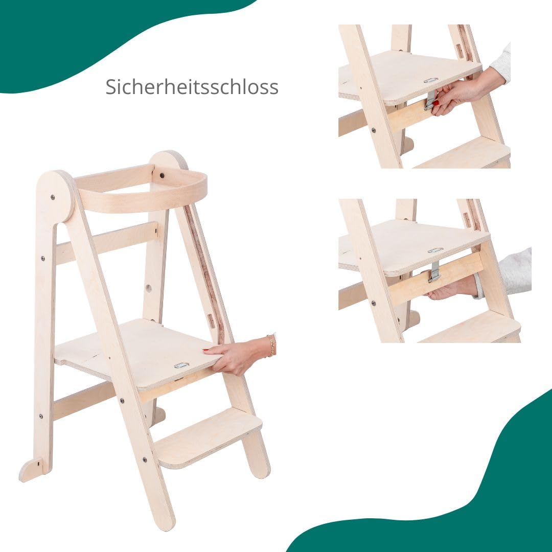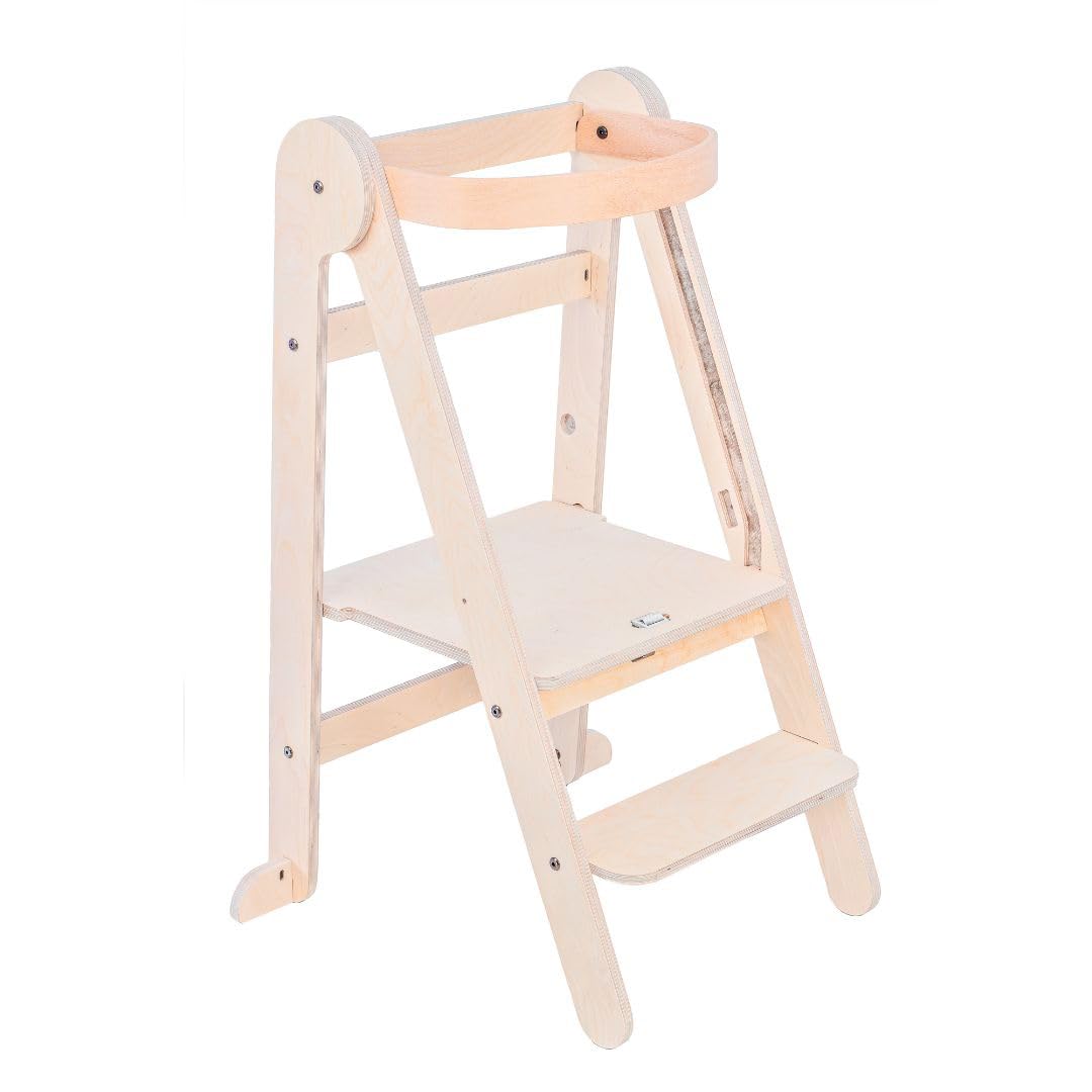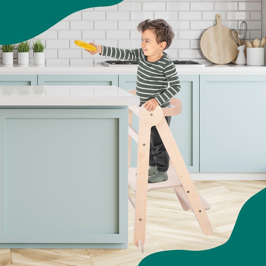 Mamatoyz Torre Montessoriana di Apprendimento Pieghevole Multiuso Learning Tower in Legno Naturale di Betulla Con 3 Altezze Regolabili