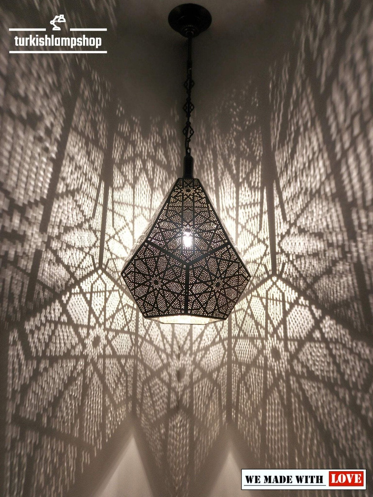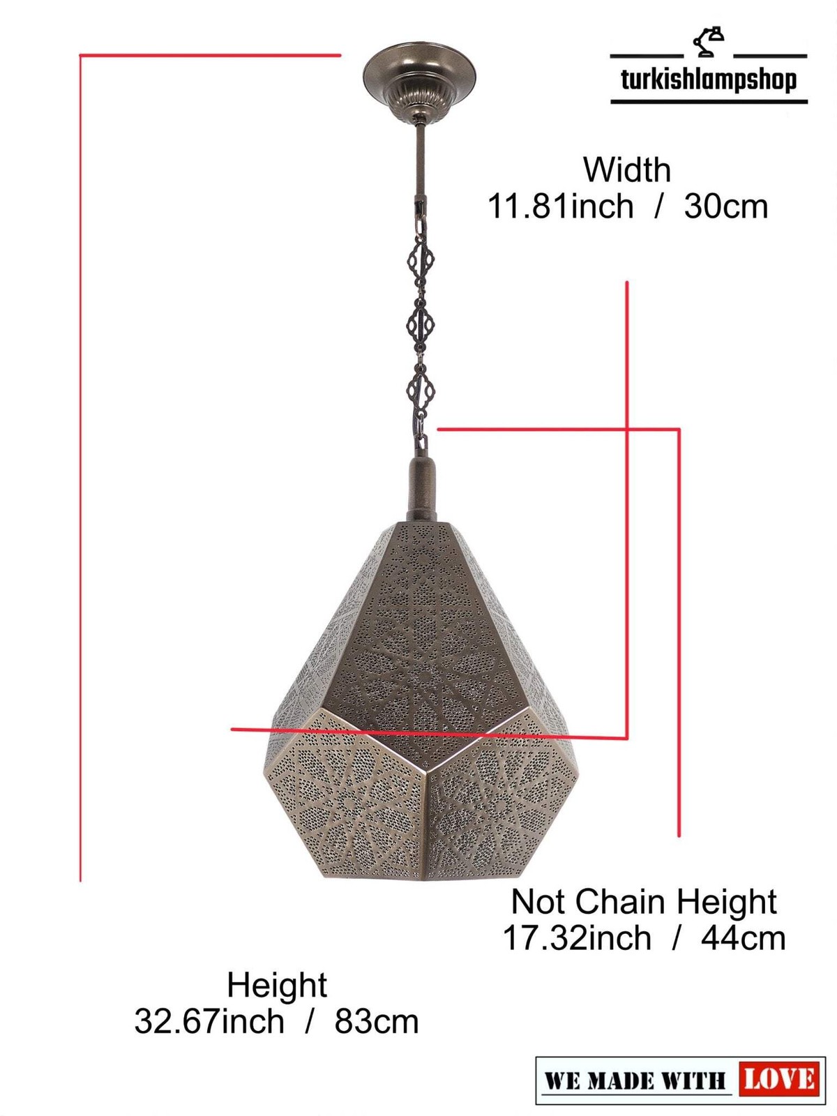 Firstly the hallway lamp moroccan lantern light pattern shadow adds an elegant touch to any hallway. Thus Featuring a intricate Moroccan lantern-style pattern, it casts a subtle, soft light that creates a beautiful, ambient atmosphere. Both visually pleasing and functional, it’s the perfect addition to your hallway.After that illuminate your home with a touch of exotic beauty. Especially our hallway lamp moroccan lantern light casts a warm, captivating shadow pattern that transforms any room into a magical, vibrant atmosphere. Thus make a statement with this unique lighting fixture and enjoy a timeless piece of art.Finally welcome guests to your home with this exotic hall entrance lamp. Its moroccan lantern light pattern shadow projects warm and cozy lighting for an inviting atmosphere. Shortly create a comfortable ambiance and add a touch of exotic appeal to your entryway.DIMENSIONSHeight : 85cm-33.46incWidth : 40cm-17.71incNot Chain Height : 55cm-21.65incShortest Hanging Height : 70cm-27.55incELECTRIC DETAILSVoltage : 110V for US – 220V for UK & EUPower source : With cable from ceilingBULB DETAILSType : E-26 socket for US – E-27 socket for UK and EU.Qty : 1Maximum Walt : 40wBULB NOT INCLUDEDSHIPMENT DETAILSThe product is handmade and the production time is 10 days, shipping is free. Please contact me if you do not receive your order within 15 days, i’ll look into it and help.PERSONALIZEYou can customize our products in width, length and color as you wish, please contact us forthis.Most importantly, we can make a custom 3D design. In the same way, after the design, you can see the picture and video of the.METARIAL Moroccan pattern sheet metal Plastering Metal Chain Cable