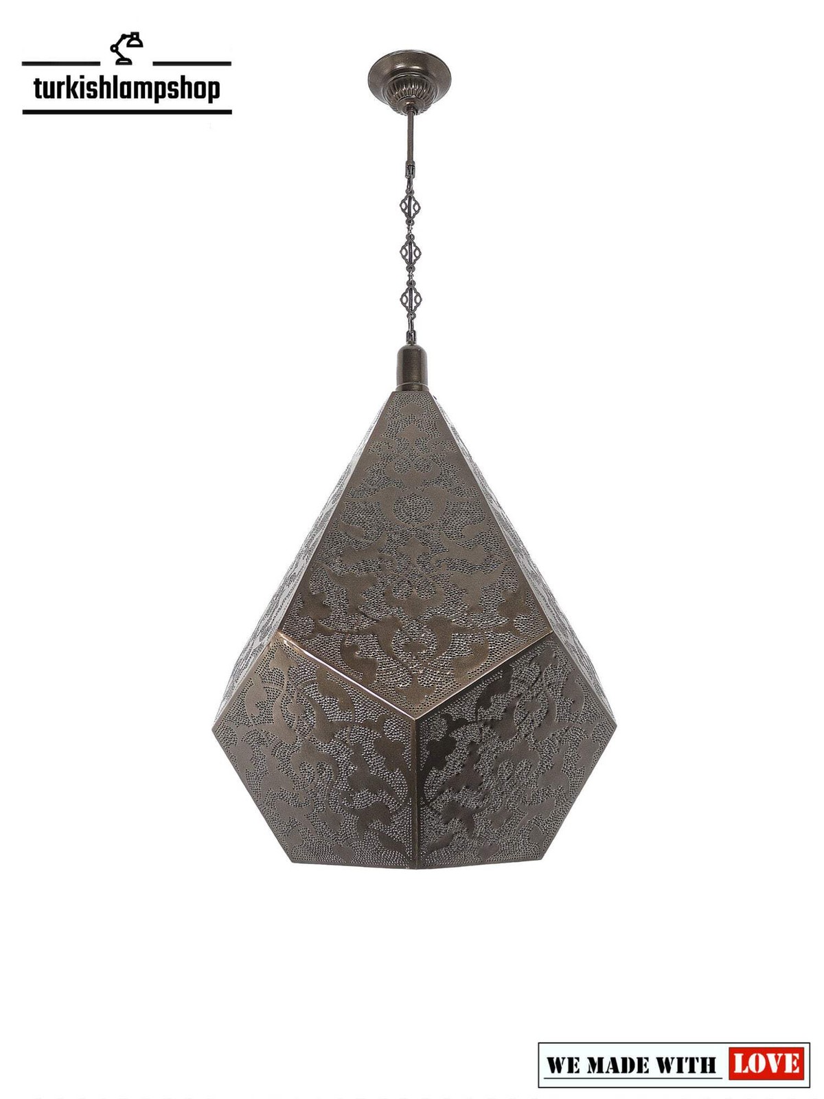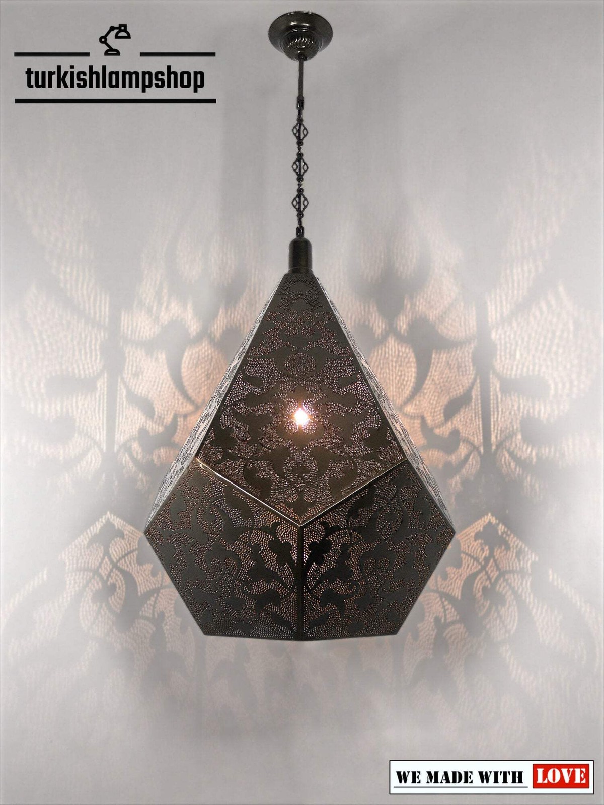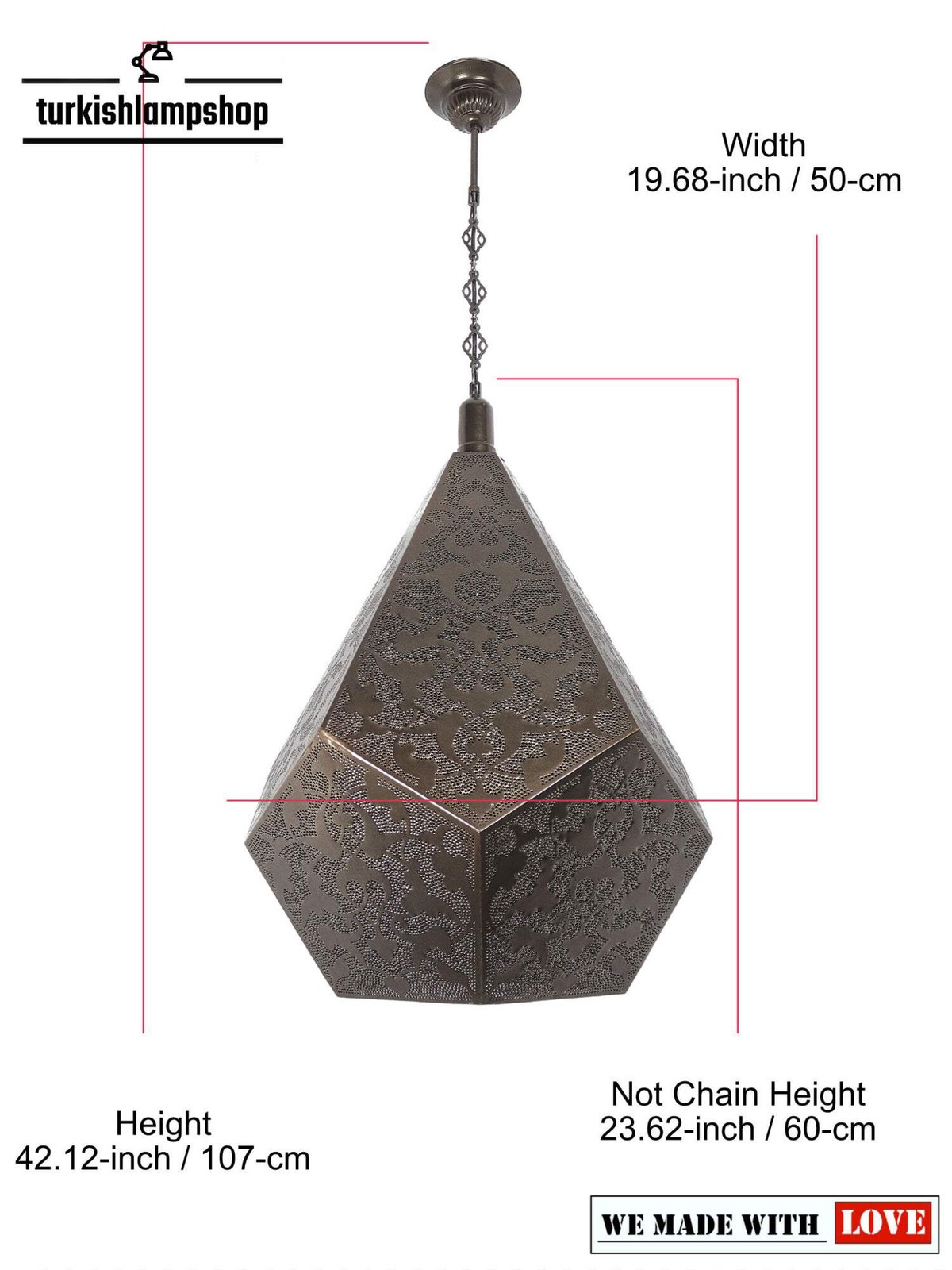 Erstens: Durch die Integration eines marokkanischen Hängelampenschirms in Ihr Zuhause verleihen Sie ihm einen Hauch von Zauber und Exklusivität. Zweitens: Die aufwendigen Designs, die Vielseitigkeit und die außergewöhnliche Handwerkskunst dieser Lampenschirme sind ein Beweis für die altehrwürdige marokkanische Tradition. Marokkanische Hängelampenschirme sind jedoch zu einem unverzichtbaren Element der zeitgenössischen Innenarchitektur geworden. Vor allem ihre Fähigkeit, jedem Raum die Wärme und den Charme der marokkanischen Kultur zu verleihen, ist unvergleichlich. Ganz gleich, ob Sie ein Statement-Stück oder eine dezente Ergänzung zu Ihrer bestehenden Einrichtung suchen, diese Lampenschirme bieten Ihnen eine Vielzahl von Möglichkeiten.Ob Sie nun eine romantische Atmosphäre in Ihrem Schlafzimmer oder ein elegantes Ambiente in Ihrem Wohnzimmer schaffen möchten, es gibt für jeden Geschmack und Stil das passende marokkanische Lampenschirmdesign. Darüber hinaus sind sie in verschiedenen Größen erhältlich, sodass sie sich sowohl für große, offene Räume als auch für kleinere, gemütlichere Bereiche Ihres Zuhauses eignen.ABMESSUNGENHöhe: 70 cm – 29,13 ZollBreite: 30 cm – 11,81 ZollHöhe ohne Kette: 35 cm – 13,77 ZollKürzeste Aufhängehöhe: 45 cm – 17,71 ZollANGABEN ZUR GLÜHBIRNETyp: E-26-Fassung für die USA – E-27-Fassung für Großbritannien und die EU.Anzahl: 1Maximale Wattzahl: 40 WGLÜHBIRNE NICHT ENTHALTENELEKTRISCHE ANGABENSpannung: 110 V für die USA – 220 V für Großbritannien und die EUStromversorgung: Mit Kabel von der DeckeVERSANDDETAILSDas Produkt ist handgefertigt und die Produktionszeit beträgt 7 Tage, der Versand ist kostenlos. Bitte kontaktieren Sie mich, wenn Sie Ihre Bestellung nicht innerhalb von 15 Tagen erhalten haben, ich werde mich darum kümmern und Ihnen helfen.PERSONALISIERENSie können unsere Produkte in Breite, Länge und Farbe nach Ihren Wünschen anpassen, bitte kontaktieren Sie uns dazu.Am wichtigsten ist, dass wir ein individuelles 3D-Design erstellen können. Ebenso können Sie nach der Gestaltung ein Bild und ein Video davon sehen.MATERIALHandgefertigtes LochmusterVerputztes MetallKetteKabel