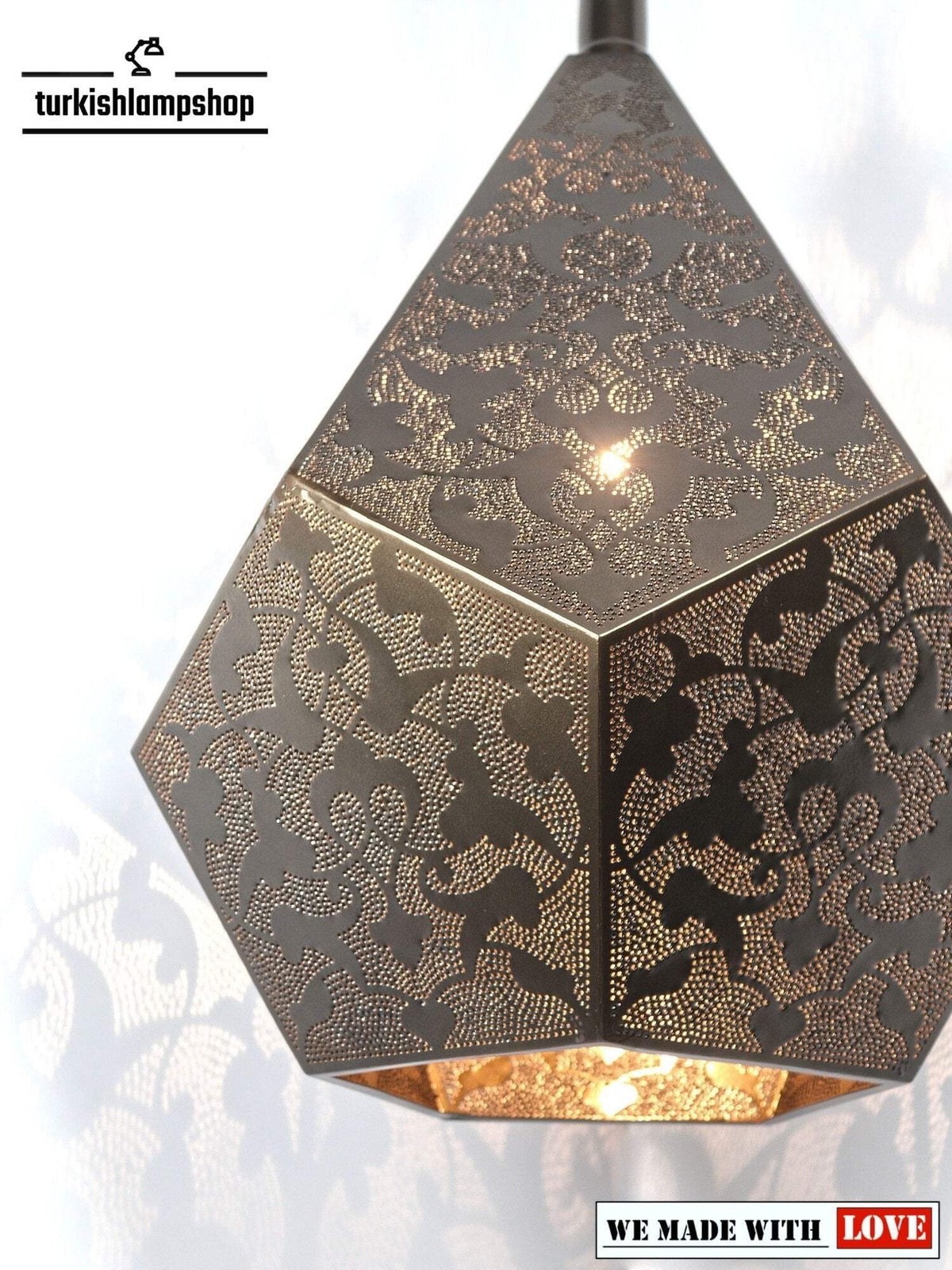 Erhellen Sie zunächst Ihr Zuhause oder Ihre Veranstaltung mit dieser dekorativen Hängelampe, einer einzigartigen marokkanischen Laterne, und genießen Sie einen schönen und sanften Schatteneffekt, der sich perfekt für die Schaffung einer geheimnisvollen Atmosphäre eignet. Sind Sie bereit für das Abenteuer? Hängen Sie diese Laterne auf und entdecken Sie neue Möglichkeiten! Diese exquisite marokkanische Laternen-Hängelampe verleiht jedem Raum einen Hauch von Eleganz und Luxus. Sie ist aus filigranem Drahtgeflecht und gemustertem Glas gefertigt und besticht durch ihr einzigartiges Design, das einen faszinierenden Schatteneffekt erzeugt. Verleihen Sie Ihrem Zuhause beispielsweise mit der marokkanischen Laternen-Dekorations-Hängelampe mit Schatteneffekt ein luxuriöses Ambiente! Mit ihrer roségoldenen Oberfläche, den aufwendigen Designs und dem wunderschönen Schatteneffekt hebt diese Hängelampe Ihre Einrichtung von anderen ab und verleiht Ihrem Raum eine ganz neue Dimension. Beeindrucken Sie Ihre Gäste mit einer Lampe, die so einzigartig und exquisit ist wie Sie selbst! ABMESSUNGENHöhe: 107 cm – 42,12 ZollBreite: 60 cm – 23,62 ZollHöhe ohne Kette: 45 cmKürzeste Aufhängehöhe: 80 cm DETAILS ZUR GLÜHBIRNETyp: E-26-Fassung für die USA – E-27-Fassung für Großbritannien und die EU.Anzahl: 1Maximale Wattzahl: 40 W GLÜHBIRNE NICHT IM LIEFERUMFANG ENTHALTEN ELEKTRISCHE ANGABENSpannung: 110 V für die USA – 220 V für Großbritannien und EUStromquelle: Mit Kabel von der Decke VERSANDDETAILSDas Produkt ist handgefertigt und die Produktionszeit beträgt 10 Tage, der Versand ist kostenlos. Bitte kontaktieren Sie mich, wenn Sie Ihre Bestellung nicht innerhalb von 15 Tagen erhalten haben, ich werde mich darum kümmern und Ihnen helfen. PERSONALISIERENSie können unsere Produkte in Breite, Länge und Farbe nach Ihren Wünschen anpassen. Bitte kontaktieren Sie uns dazu.Vor allem können wir ein individuelles 3D-Design erstellen. Ebenso können Sie nach dem Entwurf das Bild und das Video davon sehen. MATERIALHandgefertigtes LochblechVerputztes MetallKetteKabel