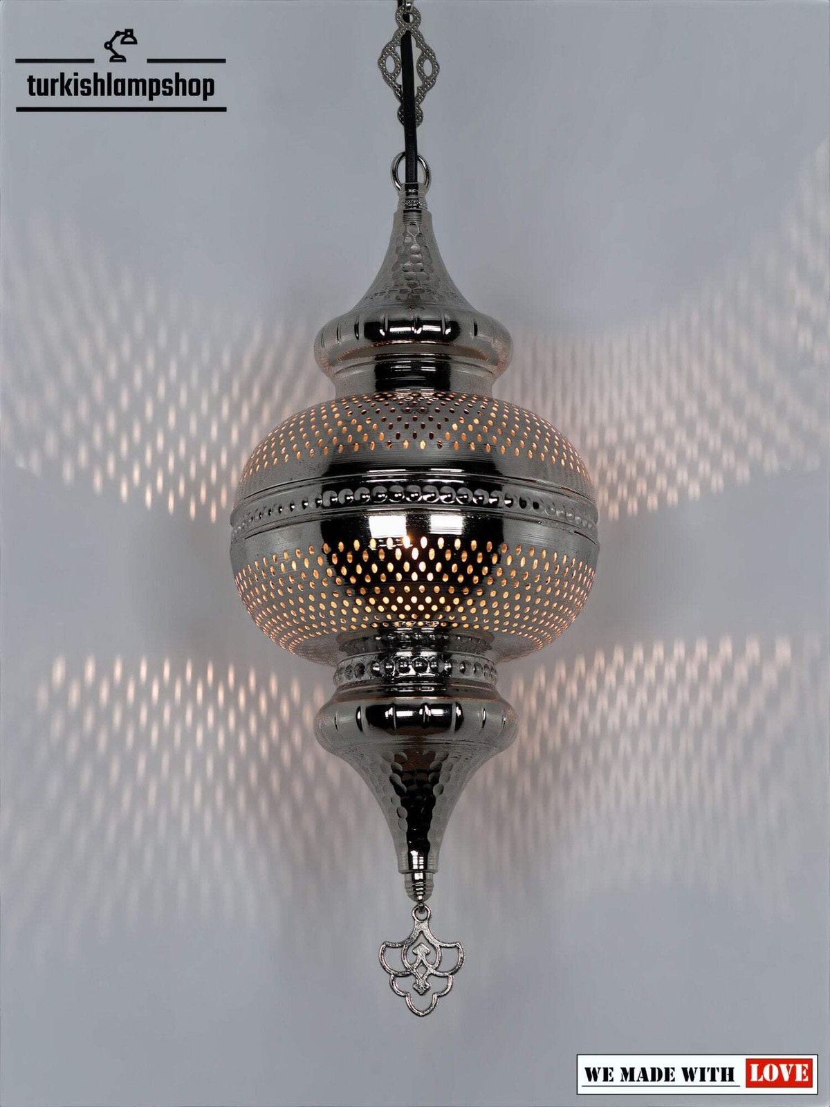 Zunächst einmal verleiht unsere marokkanische Hängelampe Ihrem Wohnraum einen Hauch von Stil und Wärme. Ihre aufwendigen Ausschnitte sorgen für eine wunderschöne Beleuchtung, wenn sie eingeschaltet ist, und schaffen so eine gemütliche Atmosphäre. Damit ist sie die ideale Lampe für gute Stimmung und süße Träume. Beleuchten Sie Ihren Wohnraum mit dieser exquisiten marokkanischen Hängelampe! Ihr aufwendiges Design verleiht Ihrem Zuhause einen Hauch von exotischer Schönheit, während ihre leuchtenden Farben Ihrem Wohnzimmer Lebendigkeit und Wärme verleihen. Lassen Sie sich besonders vom sanften, romantischen Schein dieser prächtigen Lampe inspirieren! Schließlich ist diese marokkanische Hängelampe eine großartige Ergänzung für jedes Wohnzimmer. Genießen Sie ein sanftes, schönes Licht, genau dann, wenn Sie es brauchen – perfekt für gemütliche Abende zu Hause. Beleuchten Sie Ihre Lieblingsmomente! ABMESSUNGENHöhe: 75 cm – 29,52 ZollBreite: 17 cm – 6,7 ZollHöhe ohne Kette: 60 cm – 23,62 ZollKürzeste Aufhängehöhe: 60 cm – 23,62 Zoll ANGABEN ZUR GLÜHBIRNETyp: E-12-Fassung für die USA – E-14-Fassung für Großbritannien und die EU.Anzahl: 1Maximale Wattzahl: 25 WGLÜHBIRNE NICHT ENTHALTEN ELEKTRISCHE ANGABENSpannung: 110 V für die USA – 220 V für Großbritannien und die EUStromversorgung: Mit Kabel von der Decke VERSANDDETAILSDas Produkt ist handgefertigt und die Produktionszeit beträgt 10 Tage, der Versand ist kostenlos. Bitte kontaktieren Sie mich, wenn Sie Ihre Bestellung nicht innerhalb von 15 Tagen erhalten, ich werde mich darum kümmern und Ihnen helfen. PERSONALISIERENSie können unsere Produkte in Breite, Länge und Farbe nach Ihren Wünschen anpassen, bitte kontaktieren Sie uns dazu.Vor allem können wir ein individuelles 3D-Design erstellen. Ebenso können Sie nach der Gestaltung ein Bild und ein Video davon sehen. MATERIALMetall mit Lochmuster Verputztes MetallKetteKabel