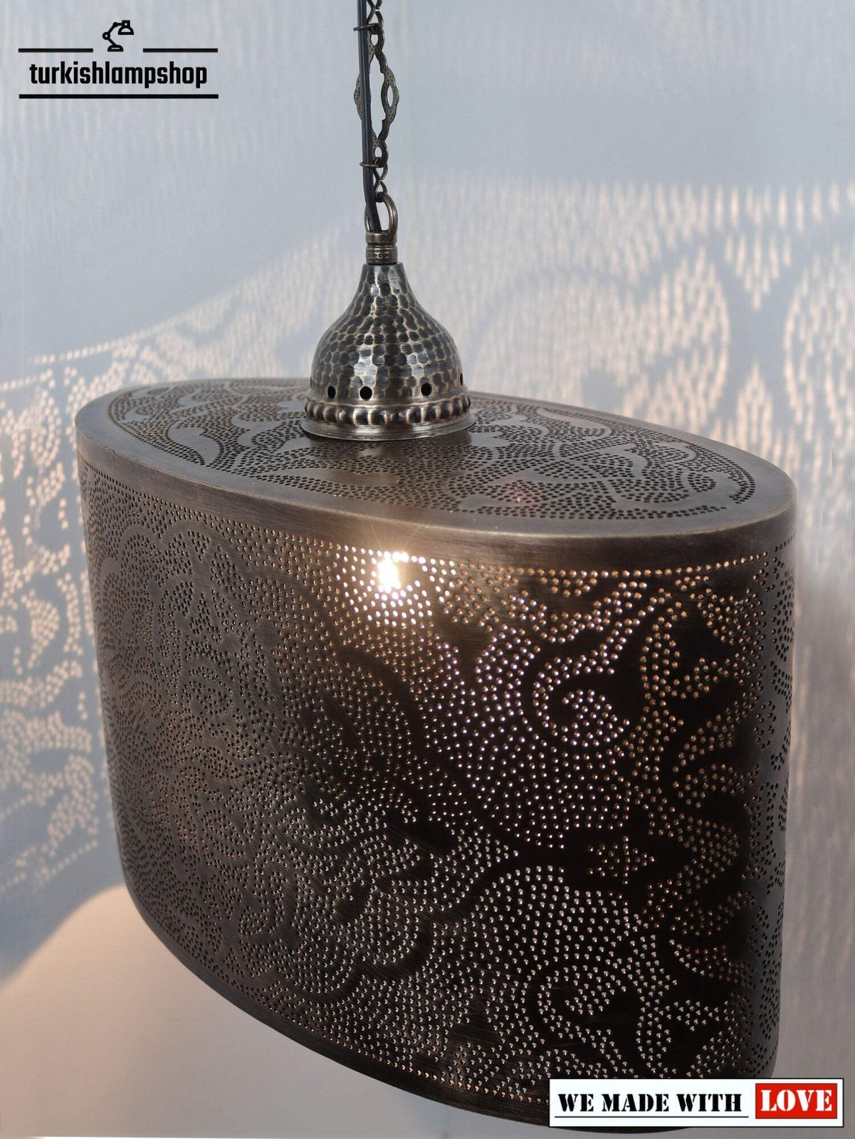 Zunächst werden wir die Schönheit und Vielseitigkeit marokkanischer Hängelampenschirme erkunden und zeigen, wie sie Ihr Wohnzimmer in eine bezaubernde Oase verwandeln können. Das einzigartige Design marokkanischer Hängelampenschirme lässt das Licht durch die Muster filtern, wirft wunderschöne Schatten und schafft eine warme und einladende Atmosphäre in Ihrem Wohnzimmer.Darüber hinaus sorgt der marokkanische Hängelampenschirm dafür, dass das Licht schöne Schatten wirft und eine warme und einladende Atmosphäre in Ihrem Raum schafft. Ein besonderer Vorteil marokkanischer Hängelampenschirme ist, dass sie an Ihre individuellen Bedürfnisse angepasst werden können.Schließlich ergänzen sie die vorhandene Einrichtung Ihres Raumes und schaffen ein einheitliches Gesamtbild. Wählen Sie auch die Größe, Form und Farbe des Lampenschirms. Ganz gleich, ob Sie einen klassischen, bohemischen oder zeitgenössischen Look anstreben, diese Pendelleuchte setzt zweifellos ein Statement und verbreitet gleichzeitig ein warmes und einladendes Licht.ABMESSUNGENHöhe: 75 cm – 29,52 ZollBreite: 40 cm – 15,73 ZollHöhe ohne Kette: 36 cm – 17,34 ZollKürzeste Aufhängehöhe: 50 cmDETAILS ZUR GLÜHBIRNETyp: E-26-Fassung für die USA – E-27-Fassung für Großbritannien und die EU.Anzahl: 1Maximale Wattzahl: 40 WGLÜHBIRNE NICHT ENTHALTENELEKTRISCHE ANGABENSpannung: 110 V für die USA – 220 V für Großbritannien und EUStromquelle: Mit Kabel von der DeckeVERSANDDETAILSDas Produkt ist handgefertigt und die Produktionszeit beträgt 10 Tage, der Versand ist kostenlos. Bitte kontaktieren Sie mich, wenn Sie Ihre Bestellung nicht innerhalb von 15 Tagen erhalten haben, ich werde mich darum kümmern und Ihnen helfen.PERSONALISIERENSie können unsere Produkte in Breite, Länge und Farbe nach Ihren Wünschen anpassen. Bitte kontaktieren Sie uns dazu.Vor allem können wir ein individuelles 3D-Design erstellen. Ebenso können Sie nach dem Entwurf das Bild und das Video davon sehen.MATERIALMarokkanisches MusterblechVerputztes MetallKetteKabel