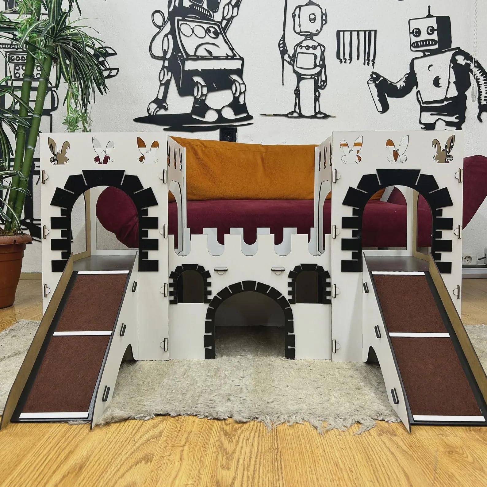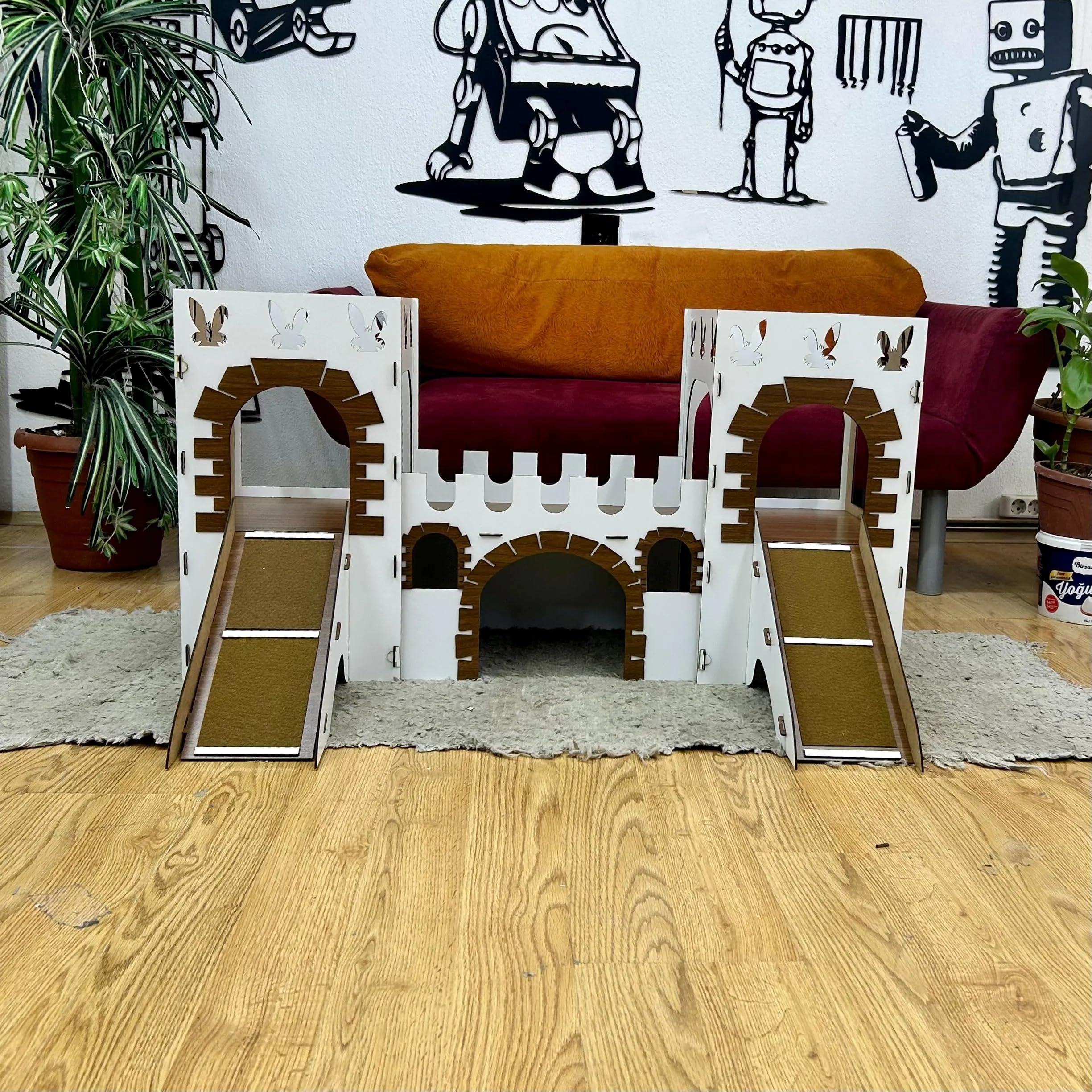 Modernes Kaninchenschloss mit Terrasse & Holzbrücke – 2-stöckiges großes Hasenhaus aus Sperrholz – Handgefertigte Kaninchenburg für bis zu 4 Kaninchen