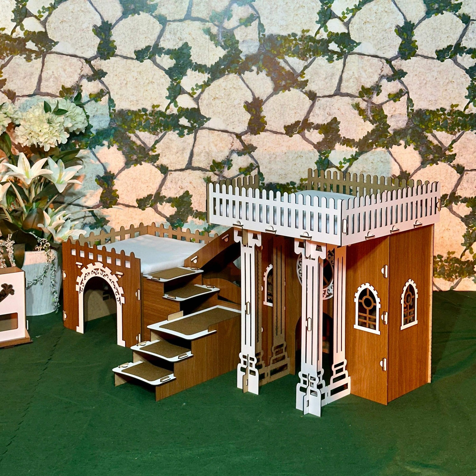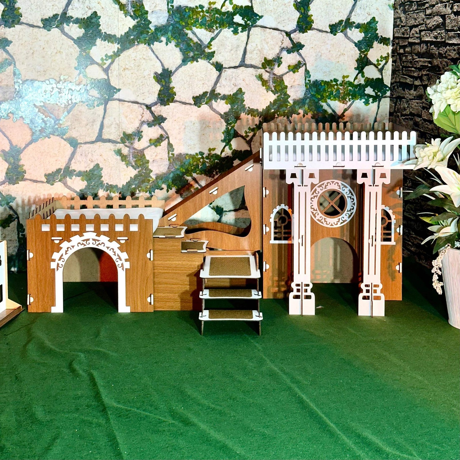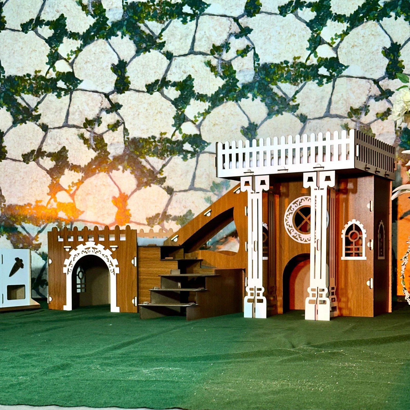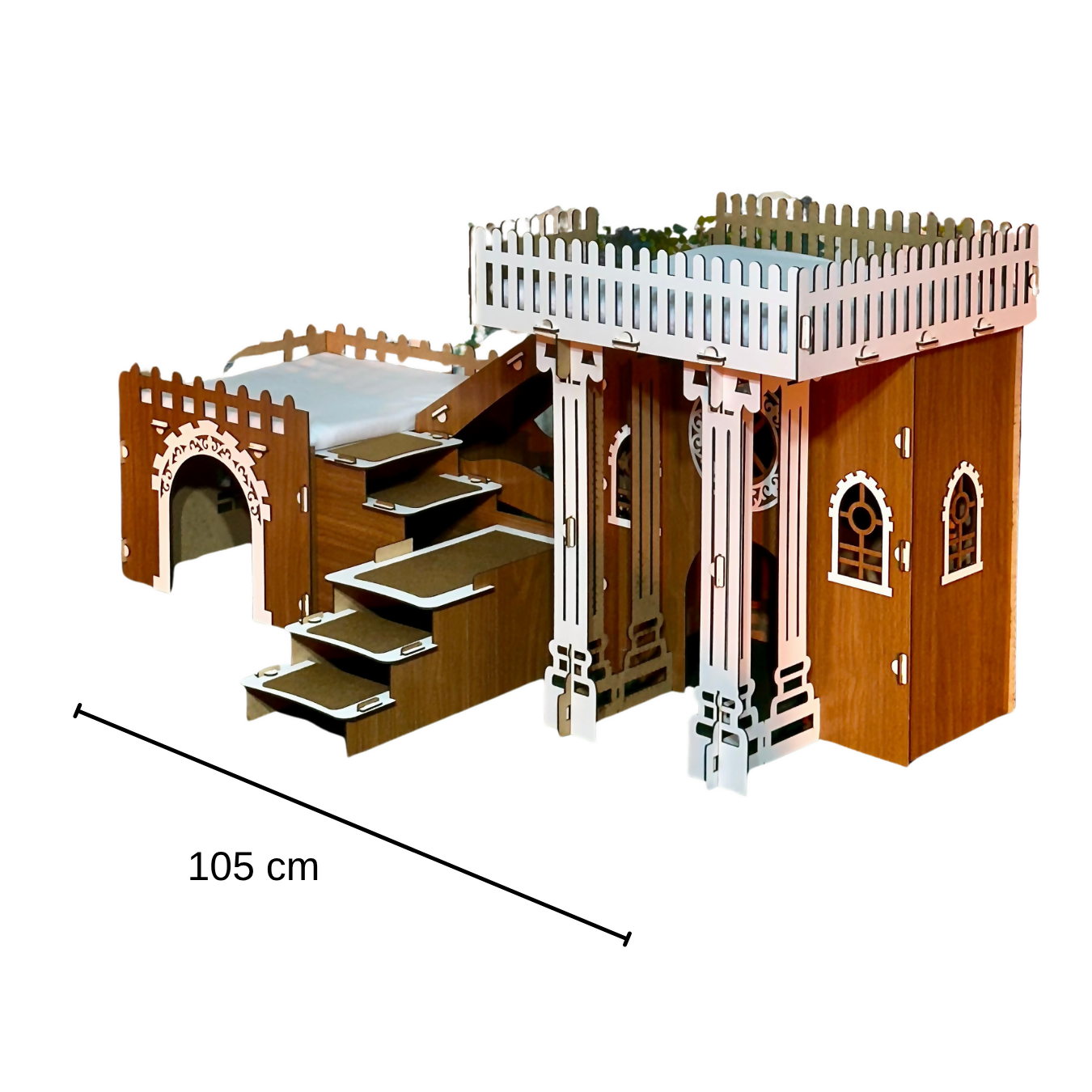 Ein Schloss, drei Türme, unendlicher Spielspaß Verwandeln Sie das Zuhause Ihrer Kaninchen in ein echtes Abenteuerland: Die PrimePetHouse?TOWERS Kaninchenburg vereint spektakuläre Optik mit funktionalem Design. Drei durch stabile Holzbrücken verbundene Türme bilden ein sechseckiges Reich voller Verstecke, Laufwege und Ruheplätze. Durchdachtes 2?Etagen?Layout Erdgeschoss: Geräumiger Unterschlupf – perfekt zum Dösen oder als Rückzugsort bei Stress. Obergeschoss: Aussichtsplattform mit Fallschutz?Geländern; fördert natürliche Neugier und Bewegung. Hochwertiges Material für dauerhafte Freude 3?mm MDF ist robust, nagersicher und sorgt für glatte Kanten ohne Splitter. Antibakterielle Beschichtung erleichtert die Reinigung: einfach feucht abwischen. Schnell auf? und abgebaut Dank passgenauer Steckverbindungen steht die Burg in Minuten – ganz ohne Schrauben oder Werkzeug. Ideal für Umzüge oder ein saisonales Umstellen des Geheges. Perfekte Größe für jede Wohnung Mit 55?cm Höhe und 32?×?32?cm Grundfläche pro Turm bietet das Haus viel Platz zum Toben, nimmt aber nur wenig Stellfläche ein. Die 55?×?32?cm Brücke verbindet die Türme sicher und ist ein optisches Highlight. Lieferumfang Zerlegte MDF?Bauteile Steck?/Verbindungselemente Schritt?für?Schritt?Anleitung (DE/EN) Machen Sie aus jeder Ecke Ihrer Wohnung ein kleines Königreich – mit der TOWERS Kaninchenburg von PrimePetHouse. Ihre Fellnasen werden es lieben!