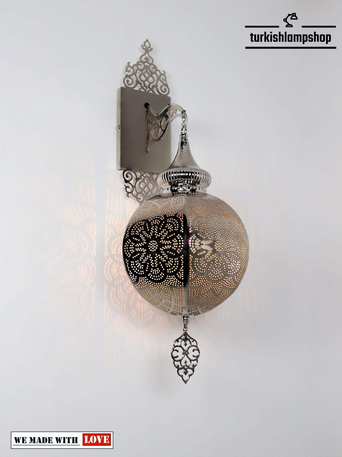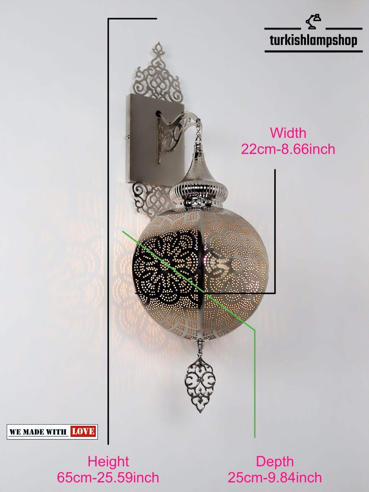 Firstly it comes to creating a warm and inviting atmosphere in your home or office lighting plays a crucial role. Thus one stunning option to consider is Moroccan style wall lights, also known as Turkish lamp sconce. So these exquisite fixtures not only provide functional lighting but also add a touch of elegance and charm to any space. Secondly Turkish lamp, come in a wide range of sizes, shapes and designs and whether you opt for a small sconce for a cozy corner or a larger fixture to make a statement Moroccan style wall lights. Thus it allows you to choose the perfect one for your space to suit your needs we make. Thus the intricate patterns on the lampshades create a captivating play of light and shadow, casting a warm and inviting glow in any room. Finally his soft and diffused lighting adds a cozy and relaxing ambiance moreover, making Moroccan style wall lights perfect for bedrooms, living rooms, or even outdoor spaces. DIMENSIONSHeight : 65CM-25.59incWidth : 22cm-8.66incDepth : 25cm-9.84incBULB DETAILSType : E-12 socket for US – E-14 socket for UK and EU.Qty : 1Maximum Walt : 40wBULB NOT INCLUDEDELECTRIC DETAILSVoltage : 110V for US – 220V for UK & EUPower source : With cable from ceilingSHIPMENT DETAILSThe product is handmade and the production time is 10 days, shipping is free. Please contact me if you do not receive your order within 15 days, i’ll look into it and help.PERSONALIZEYou can customize our products in width, length and color as you wish, please contact us forthis.Most importantly, we can make a custom 3D design. In the same way, after the design, you can see the picture and video of the. METARIAL Hole pattren sheet metal Plastering Metal Chain Cable