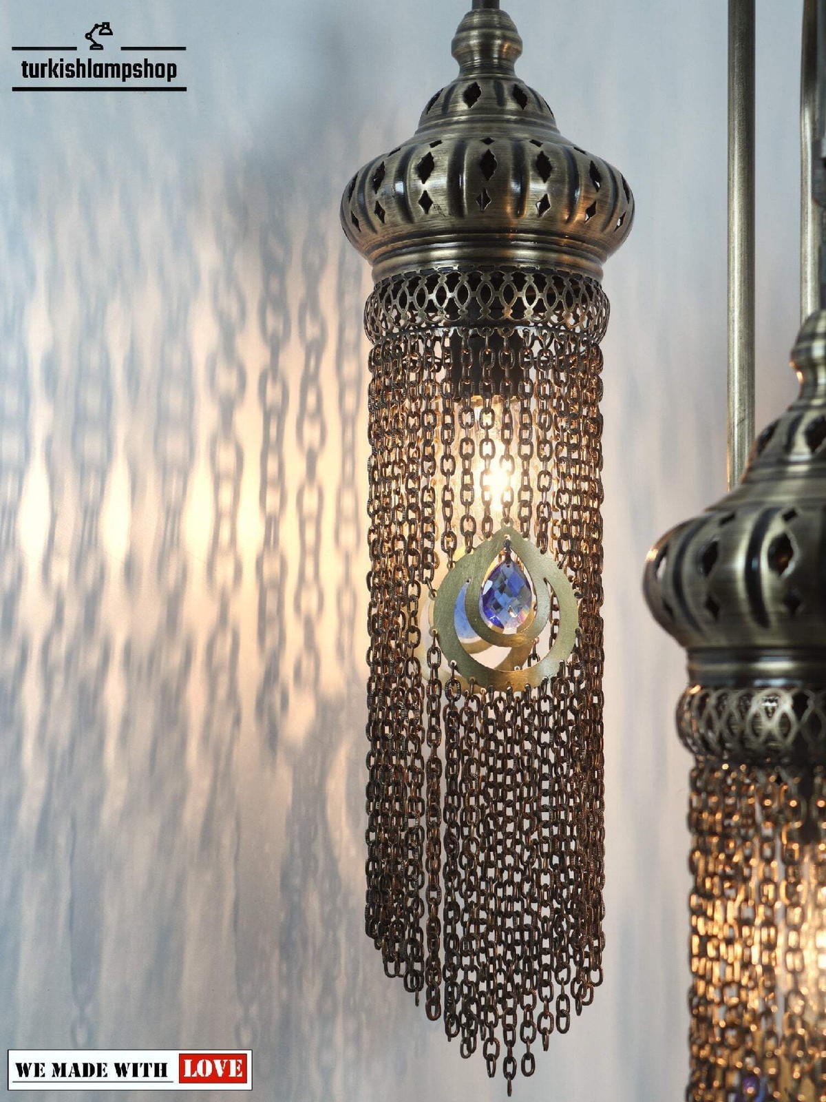 Vor allem wenn es darum geht, eine faszinierende Atmosphäre in Ihrem Zuhause, Hotel oder Restaurant zu schaffen, spielt die Beleuchtung eine entscheidende Rolle. Zweitens ist der türkische Kronleuchter aus Pyrexglas mit 11 Kugeln ein attraktives Kunstwerk, das die Schönheit von Pyrexglas mit dem Charme türkischer Handwerkskunst verbindet. Anschließend werden diese Pyrex-Gläser von erfahrenen türkischen Handwerkern sorgfältig von Hand zu Kronleuchtern verarbeitet, sodass jedes Stück ein Unikat und ein Meisterwerk ist. Die komplizierten Muster und filigranen Designs auf dem Glas sorgen für ein faszinierendes Lichtspiel und tauchen jeden Raum in einen warmen, einladenden Schein. Ganz gleich, ob Sie das Ambiente Ihres Wohnzimmers, Schlafzimmers, Essbereichs oder sogar eines gewerblichen Raums wie eines Hotels oder Restaurants aufwerten möchten, dieser Kronleuchter setzt garantiert ein Statement. Schließlich fügt sich sein zeitloser Charme und sein klassisches Design nahtlos in jeden Einrichtungsstil ein, sei er modern, traditionell oder eklektisch. ABMESSUNGENHöhe: 130 cmBreite: 94 cmHöhe ohne Kette: 100 cmKürzeste Aufhängehöhe: 100 cmDETAILS ZUR GLÜHBIRNETyp: E-12-Fassung für die USA – E-14-Fassung für Großbritannien und die EU.Anzahl: 11Maximale Wattzahl: 25 WGLÜHBIRNE NICHT ENTHALTENELEKTRISCHE ANGABENSpannung: 110 V für die USA – 220 V für Großbritannien und die EUStromversorgung: Mit Kabel von der DeckeVERSANDDETAILSDas Produkt ist handgefertigt und die Produktionszeit beträgt 7 Tage, der Versand ist kostenlos. Bitte kontaktieren Sie mich, wenn Sie Ihre Bestellung nicht innerhalb von 15 Tagen erhalten, ich werde mich darum kümmern und Ihnen helfen.PERSONALISIERENSie können unsere Produkte in Breite, Länge und Farbe nach Ihren Wünschen anpassen. Bitte kontaktieren Sie uns dazu. Am wichtigsten ist, dass wir ein individuelles 3D-Design erstellen können. Ebenso können Sie nach dem Entwurf das Bild und das Video davon sehen.MATERIALPyrexglasVerputztes MetallKetteKabel
