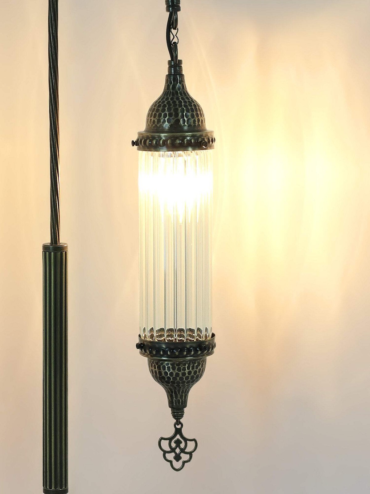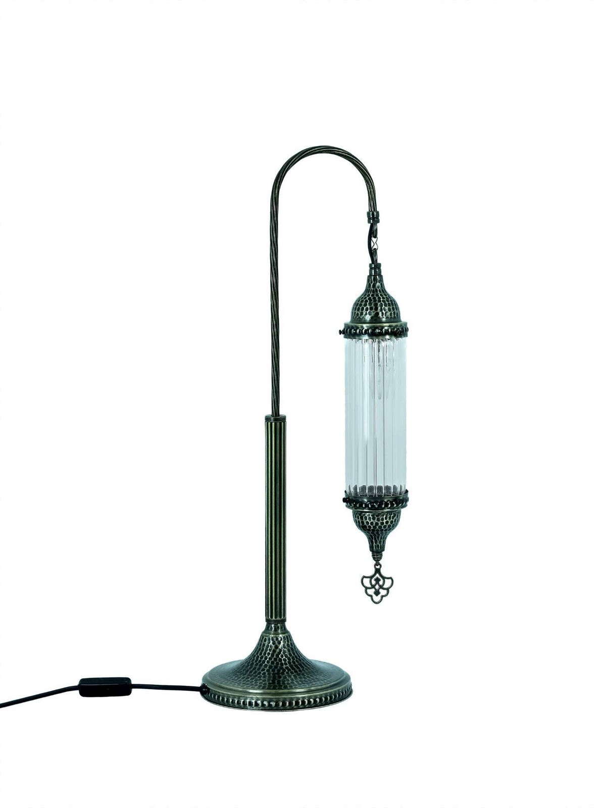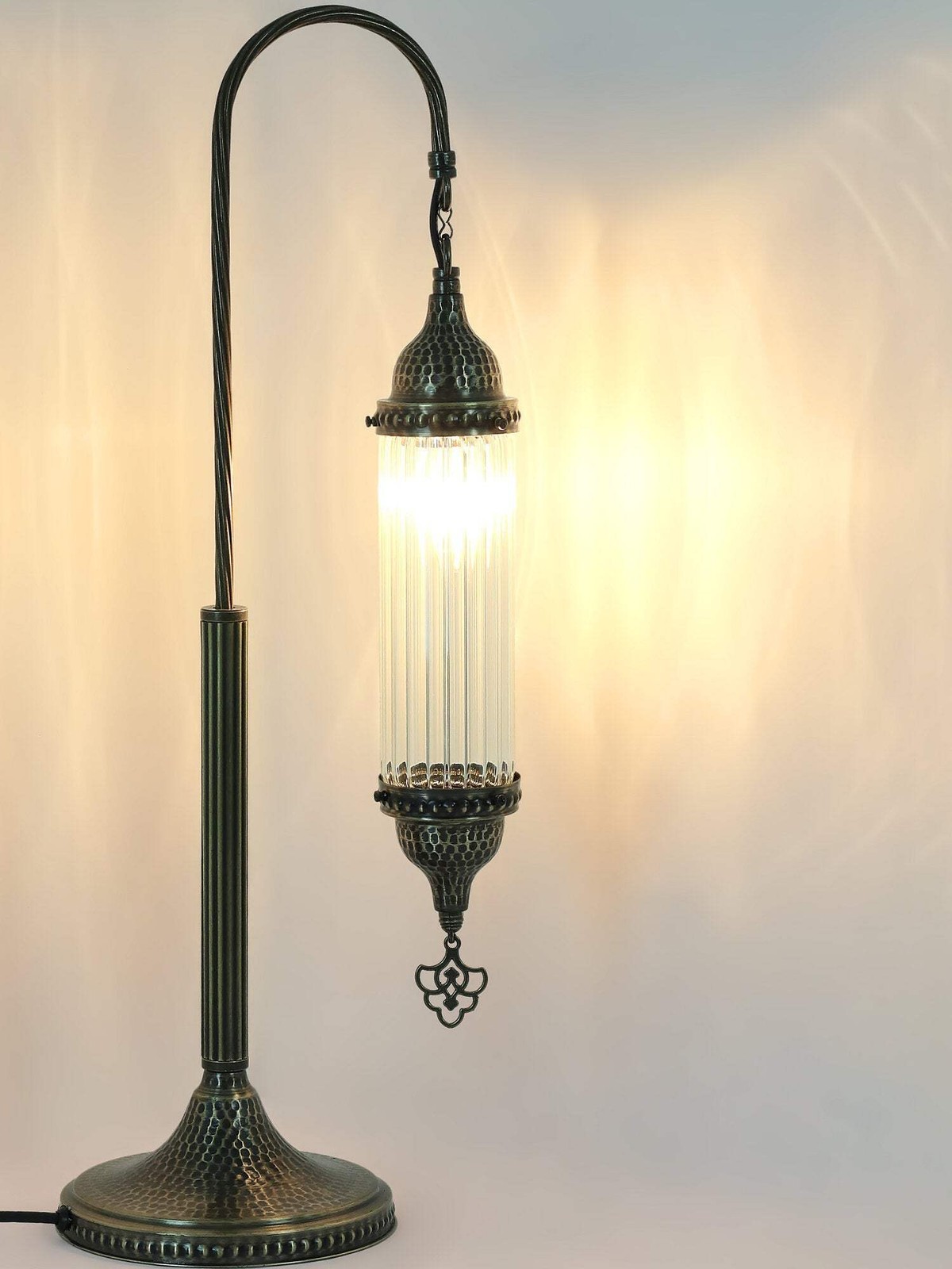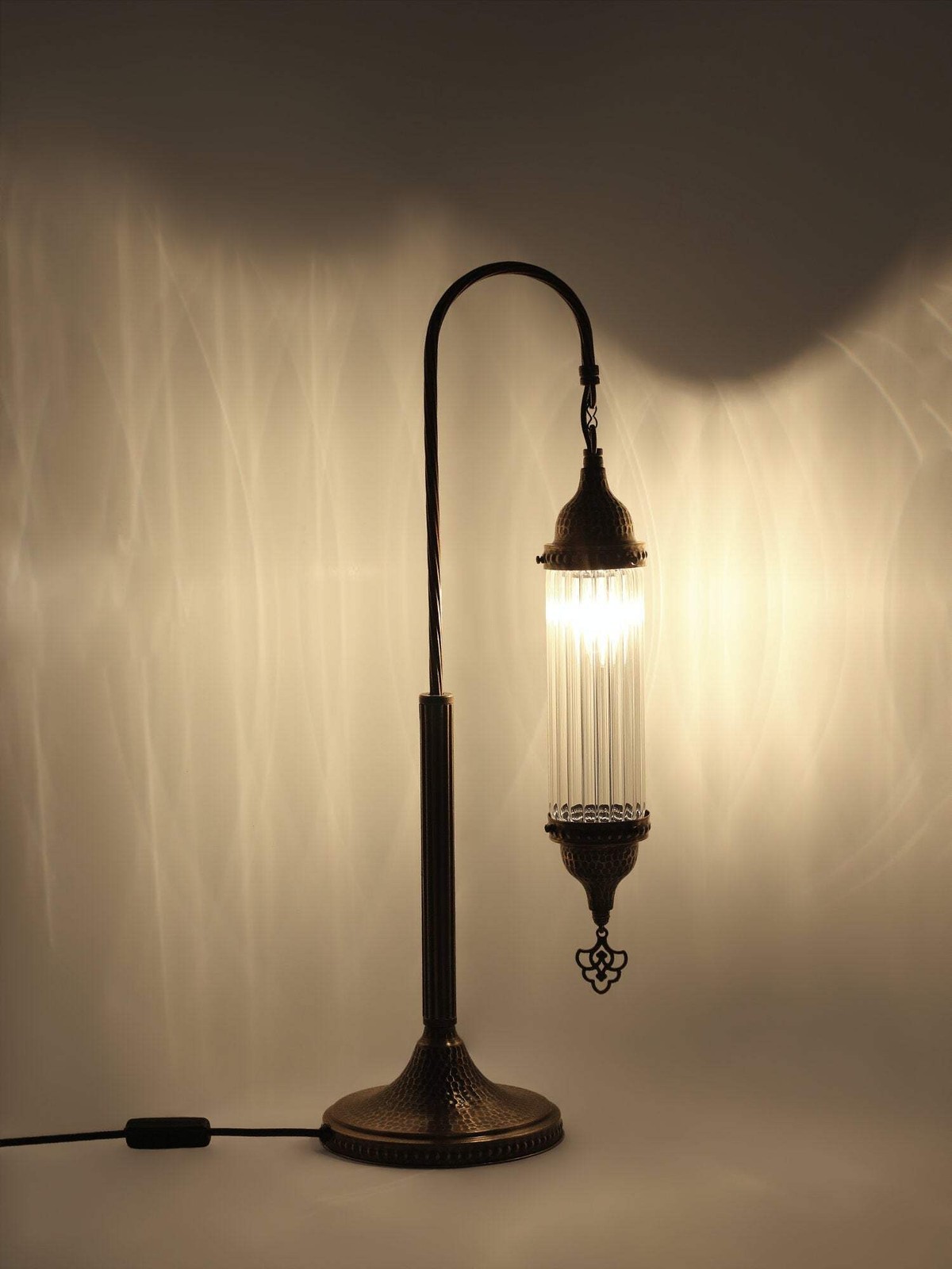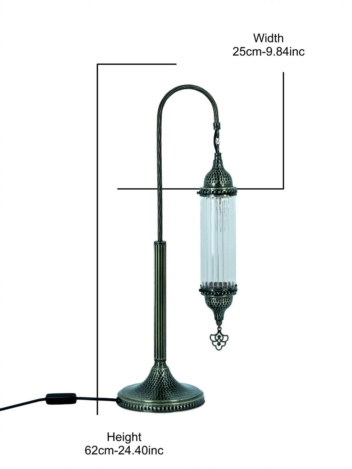 DIMENSIONSHeight : 62cm-24.40 incWidth : 25cm-9.84incBULB DETAILSType : E-12 Socket for US andE-14 Socket for UK & EUQty : 1Maximum Walt : 25wBULB NOT INCLUDEDELECTRIC DETAILSVoltage : 110V for US – 220V for UK & EUPower source : Plug CableShipped with compatible plug for America,Britain,Europa and AustraliaSHIPMENT DETAILSThe product is handmade and the production time is 7days, shipping is free. Please contact me if you do not receive your order within 15 days, i’ll look into it and help.PERSONALIZEYou can customize our products in width, length andcolor as you wish, please contact us forthis.Most important , we can make acustom 3D design. In the same way, after the design, you can see the picture and video of the.METARIAL Mosaic Glass Plastering Metal Chain Cable Above all, the pyrex glass bedside lamp with Turkish swan neck cylinder design has gained popularity in the market. Secondly, its unique design has caught the attention of interior designers and homeowners. The lamp was praised for its exceptional craftsmanship, details and complementing the overall aesthetic of any bedroom.A bedside lamp not only provides functional lighting for reading but also adds a touch of style. If you’re also looking for an elegant option, the pyrex glass bedside lamp with the Turkish swan neck cylinder design is the perfect choice. This designer lamp in particular adds elegance to any bedroom decor.It creates a relaxing atmosphere for reading or relaxing before going to bed. Whether you prefer a reading light or a subtle glow, this lamp offers the versatility to suit your preferences. It also comes with a convenient on/off switch located on the cable for easy access. Finally, this user-friendly feature allows you to enjoy and operate the lamp smoothly.