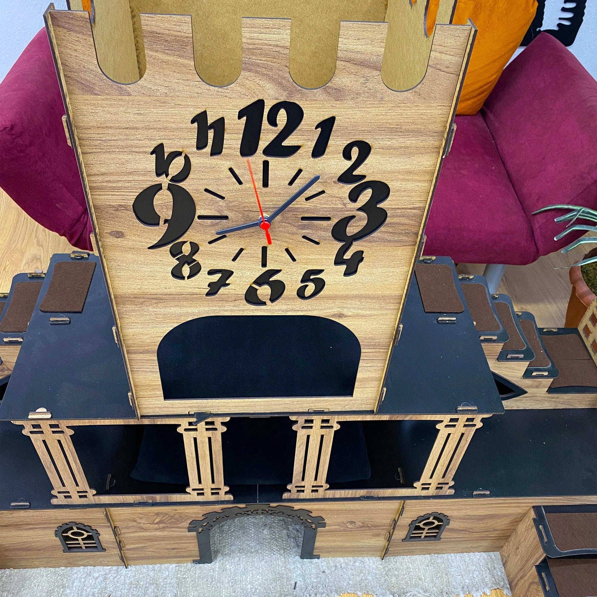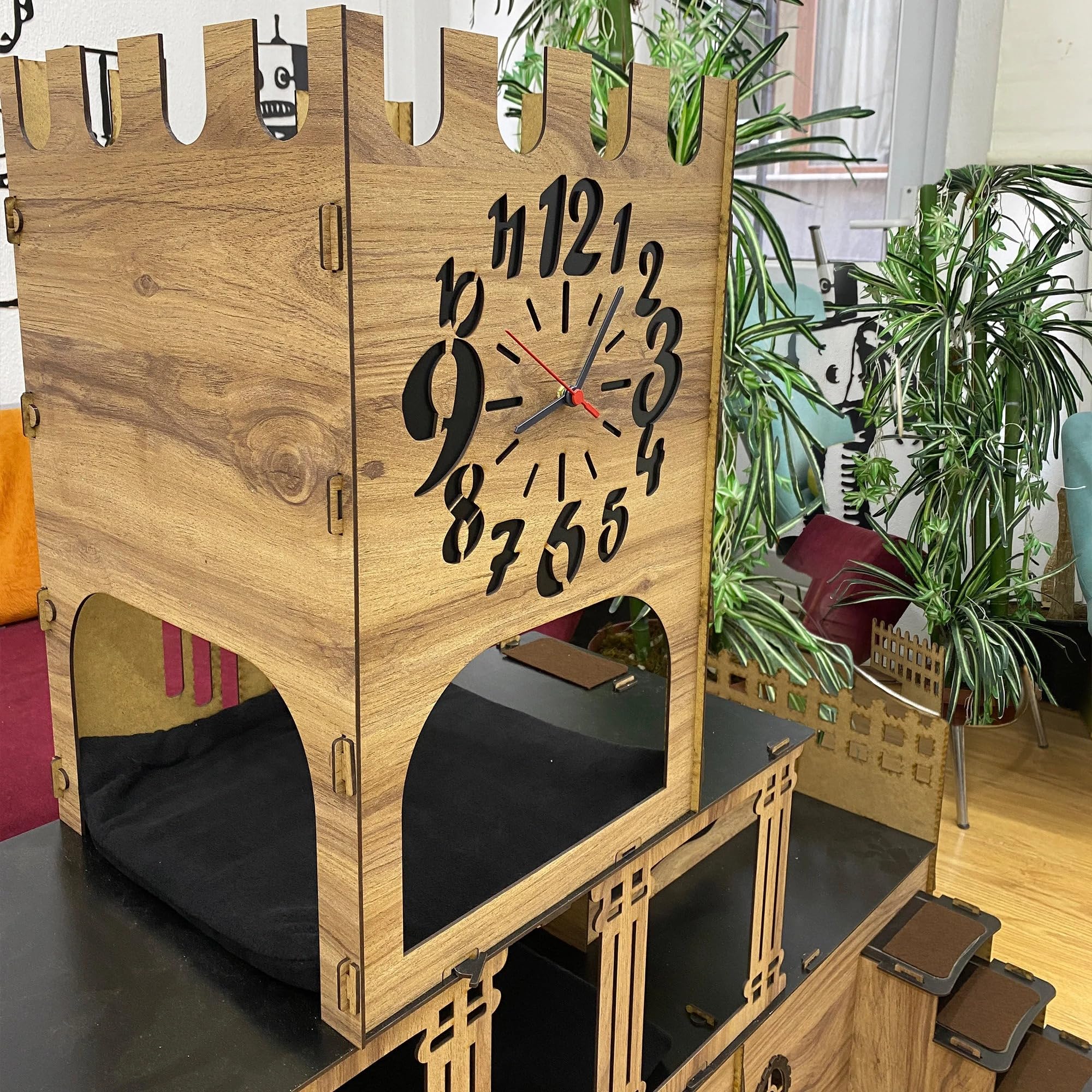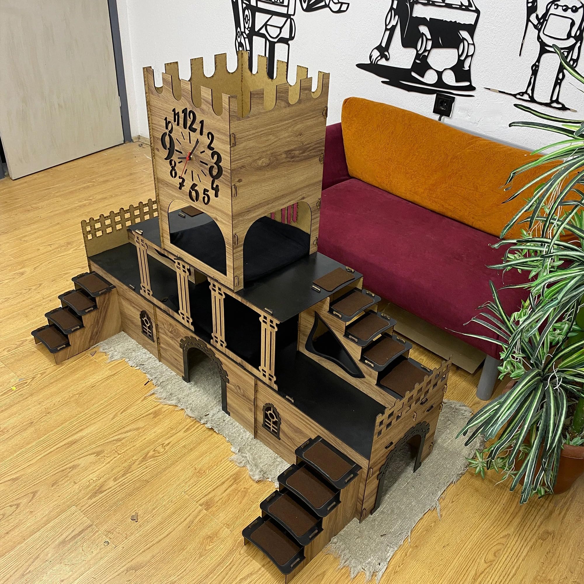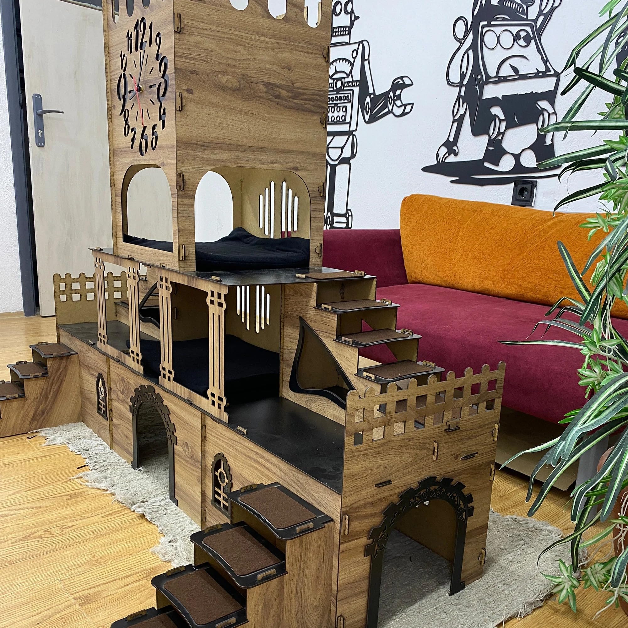 Riesengroße Kaninchenburg mit Glockenturm – 3-stöckiges Kaninchenhaus mit Holzbrücke & Terrasse – Großes Spielhaus für bis zu 4 Kaninchen – Handgefertigt aus 3 mm Sperrholz (Eiche-Schwarz, N)