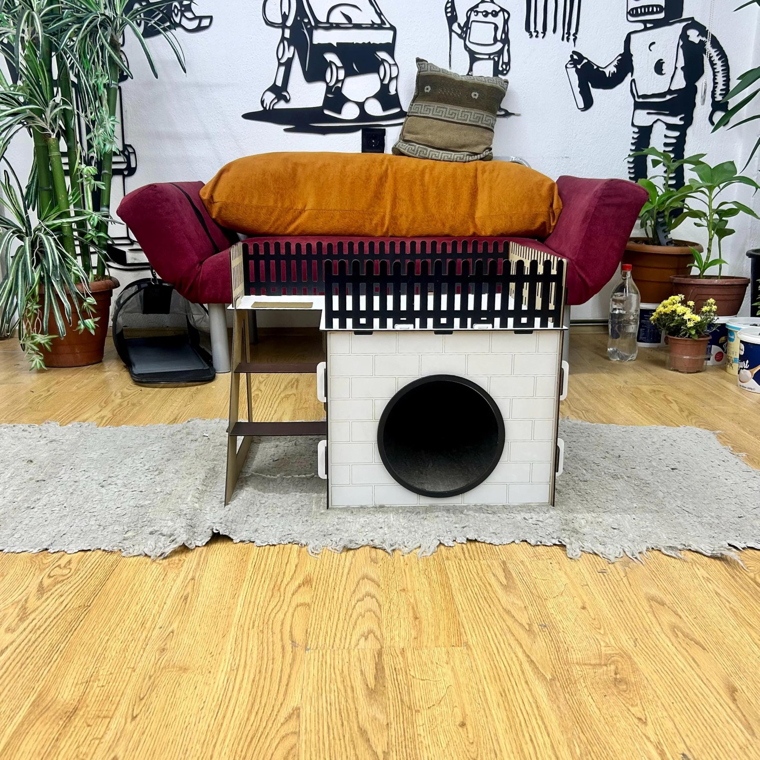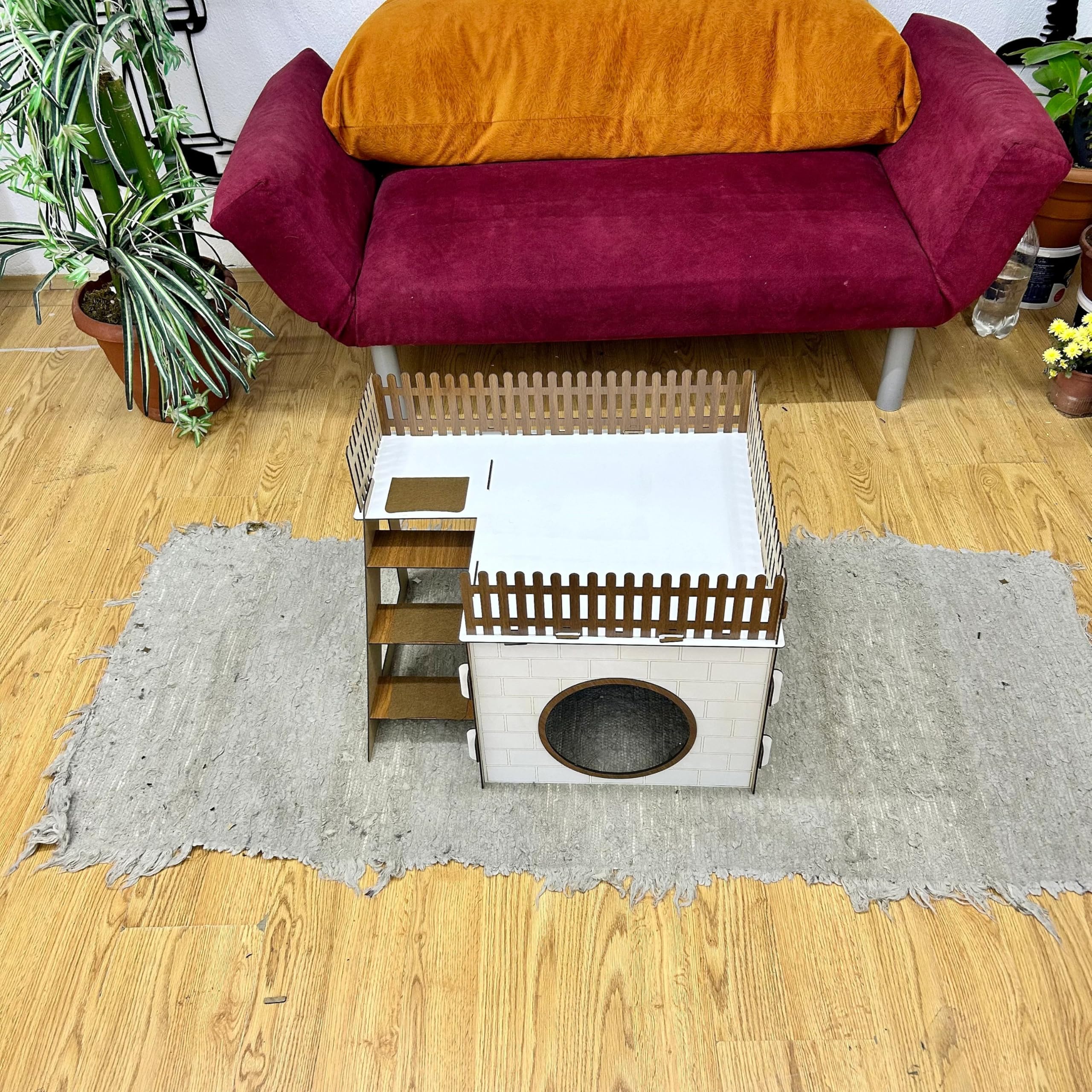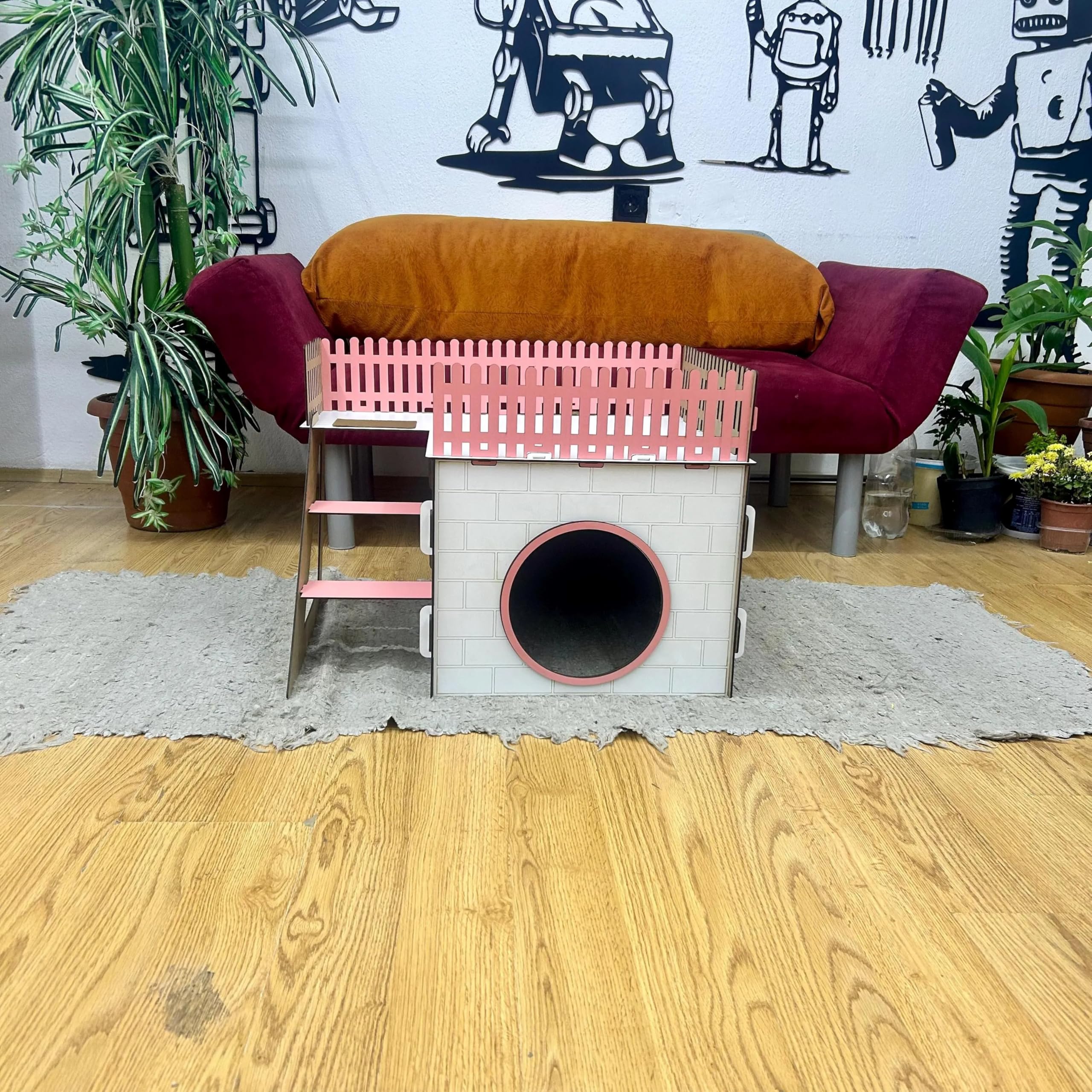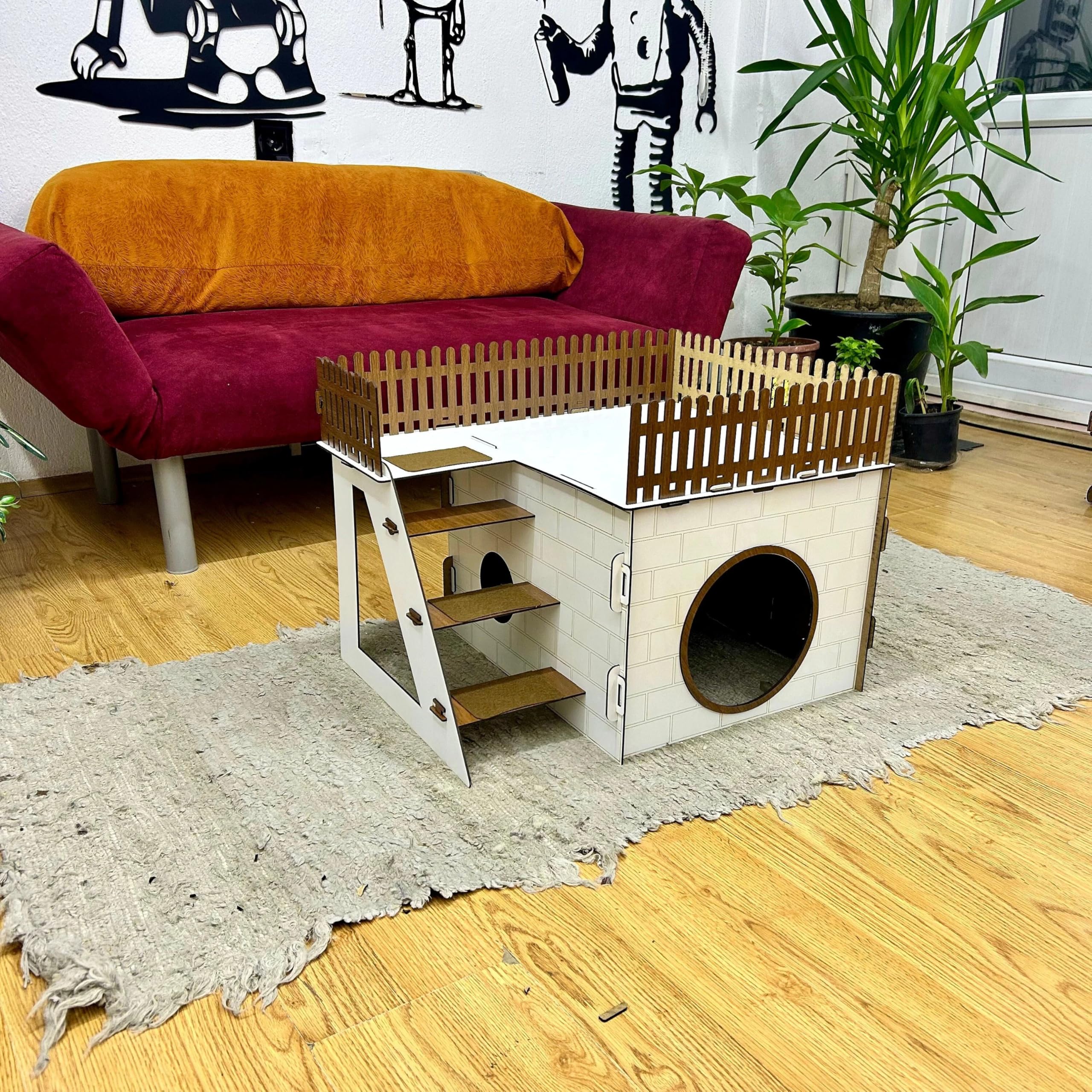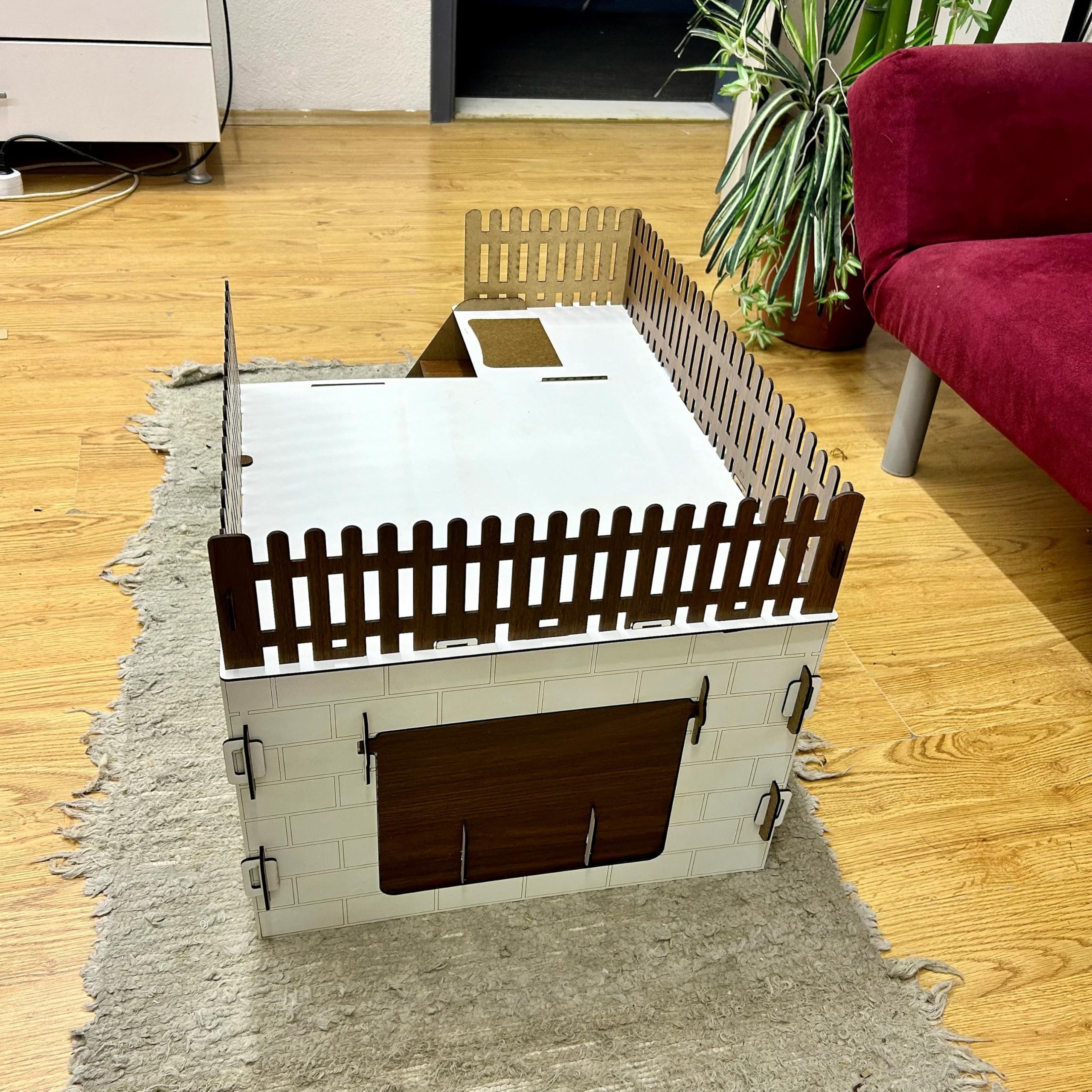Ein liebevoll gestaltetes Kaninchenhaus für mehr Lebensfreude im Alltag Ihrer Tiere. Das TERAS Kaninchenhaus von PrimePetHouse wurde speziell für 1–2 Kaninchen oder Chinchillas entwickelt. Die Kombination aus robuster Holzverarbeitung, verspielten Details und durchdachtem Design macht dieses Häuschen zu einem gemütlichen Rückzugsort mit Spielwert. Die große Terrasse bietet einen erhöhten Ausblick und viel Platz zum Ausruhen oder Erkunden. Die stabile Holztreppe mit rutschfestem Belag sorgt für sicheres Auf- und Absteigen. Besonders beliebt ist die seitliche Schwingtür, durch die Ihre Tiere aktiv ein- und ausgehen können – ideal für natürliche Bewegungsmuster und Spielverhalten. ? Das verarbeitete Holz ist zertifiziert, antibakteriell und sicher für Tiere. Die natürliche Holzstruktur bringt nicht nur Ästhetik, sondern auch Wärme und Natürlichkeit in Ihr Zuhause oder den Garten. ? Produktmaße: Höhe: 32 cm Breite: 38 x 43 cm Außenmaß: 46 x 60 cm Türdurchmesser: 20 cm ? Lieferung & Aufbau: Wird demontiert geliefert. Mit Aufbauanleitung – einfacher Zusammenbau ohne Werkzeug notwendig. Bei Fragen stehen wir gerne zur Verfügung. ? ? Geben Sie Ihren Kaninchen ein stilvolles, sicheres und funktionales Zuhause – mit Terrasse, Spiel & Komfort in einem.