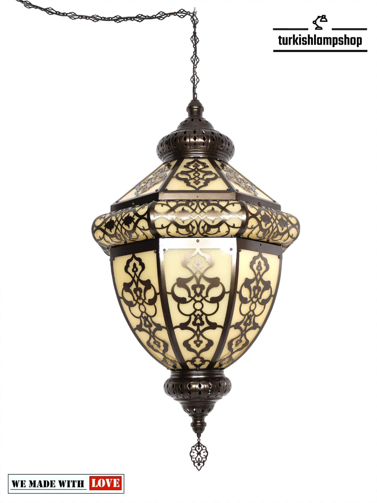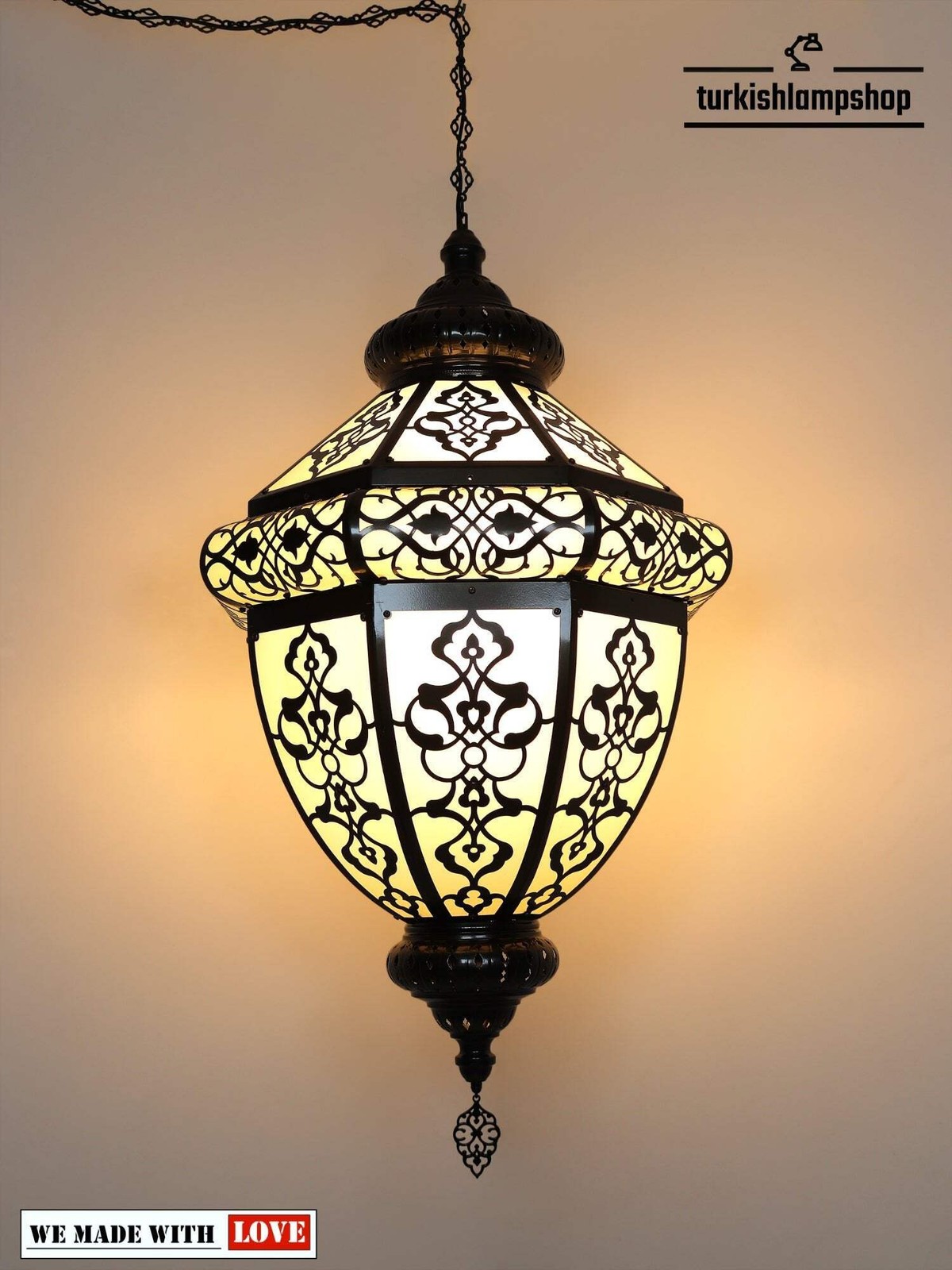 Zunächst einmal greifen wir bei der Herstellung von türkischen Laternen-Pendelleuchten auf Kunst zurück, die tief in dem reichen kulturellen Erbe der Türkei verwurzelt ist. Unsere Meister lassen sich auch von traditionellen türkischen Mustern inspirieren, die für ihre filigranen Muster und geometrischen Motive bekannt sind. Insbesondere diese Designs spiegeln oft den Einfluss der osmanischen, persischen und arabischen Kunst wider, was zu einer einzigartigen Verschmelzung verschiedener Stile führt.Die lasergeschnittenen Muster verbessern nicht nur die Optik der Leuchte, sondern erfüllen auch einen funktionalen Zweck. Ebenso fügen lasergeschnittene Muster komplexe Details hinzu und erzeugen faszinierende Lichtmuster. So können Sie türkische Laternen-Pendelleuchten in verschiedenen Bereichen einsetzen, darunter Wohnzimmer, Essbereiche und Schlafzimmer. Kurz gesagt: Türkische Laternen-Pendelleuchten sind in einer Vielzahl von Größen, Formen und Materialien erhältlich, sodass Sie die perfekte Lösung für Ihren Raum finden können. Ob Sie nun eine kleine und filigrane Pendelleuchte oder ein größeres Statement-Stück bevorzugen, es gibt ein türkisches Laternen-Design, das Ihren Bedürfnissen entspricht. ABMESSUNGENHöhe: 140 cmBreite: 70 cmHöhe ohne Kette: 115 cmKürzeste Aufhängehöhe: 125 cmANGABEN ZUR GLÜHBIRNETyp: E-26-Fassung für die USA – E-27-Fassung für Großbritannien und die EU.Anzahl: 3Maximale Wattzahl: 40 WGLÜHBIRNE NICHT ENTHALTENELEKTRISCHE ANGABENSpannung: 110 V für die USA – 220 V für Großbritannien und die EUStromversorgung: Mit Kabel von der DeckeVERSANDANGABENDas Produkt ist handgefertigt und die Produktionszeit beträgt 7 Tage, der Versand ist kostenlos.Bitte kontaktieren Sie mich, wenn Sie Ihre Bestellung nicht innerhalb von 15 Tagen erhalten haben. Ich werde mich darum kümmern und Ihnen helfen.PERSONALISIERENSie können unsere Produkte in Breite, Länge und Farbe nach Ihren Wünschen anpassen. Bitte kontaktieren Sie uns dazu. Am wichtigsten ist, dass wir ein individuelles 3D-Design erstellen können. Auf die gleiche Weise können Sie nachdem Entwurf das Bild und das Video davon sehen.MATERIALLasergeschnittenes MusterVerputztes MetallKetteKabel