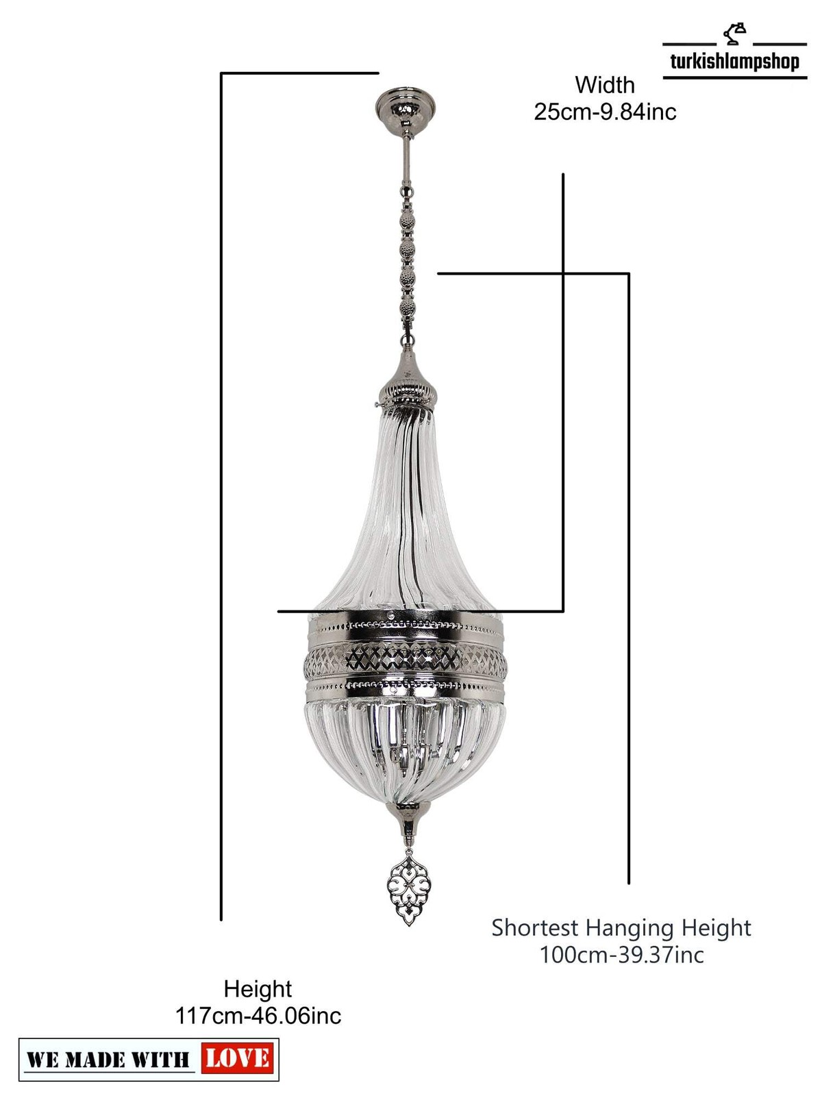 Wenn es um die Inneneinrichtung geht, spielt die Beleuchtung eine sehr wichtige Rolle bei der Schaffung der gewünschten Atmosphäre. Wenn Sie auf der Suche nach einer einzigartigen Leuchte sind, ist die klare türkische Laterne aus Pyrexglas die perfekte Wahl. Dieses elegante Stück ist eine auffällige Ergänzung für jeden Raum und verbindet traditionelle türkische Handwerkskunst mit modernem Design. Darüber hinaus wird die türkische Laterne aus Pyrexglas von erfahrenen Handwerkern handgefertigt, die die Kunst des Glasblasens beherrschen. Jede Lampe wird aus hochwertigem Pyrexglas hergestellt, das für seine Langlebigkeit und Klarheit bekannt ist. Insbesondere die klare Farbe des Glases lässt das Licht wunderschön durchscheinen und schafft eine warme und einladende Atmosphäre in jedem Raum. Die Investition in die türkische Laternen-Pendelleuchte aus Pyrexglas wertet jedoch nicht nur die Ästhetik Ihres Zuhauses auf, sondern bietet Ihnen auch eine langlebige und dauerhafte Beleuchtungslösung. Warum also warten? Werten Sie Ihre Einrichtung mit diesem zeitlosen Stück auf und genießen Sie den bezaubernden Schein, den es in Ihren Raum bringt. ABMESSUNGENHöhe: 117 cmBreite: 25 cmHöhe ohne Kette: 90 cmKürzeste Aufhängehöhe: 100 cmANGABEN ZUR GLÜHBIRNETyp: E-12-Fassung für die USA – E-14-Fassung für Großbritannien und die EU.Anzahl: 1Maximale Wattzahl: 40 WGLÜHBIRNE NICHT ENTHALTENELEKTRISCHE ANGABENSpannung: 110 V für die USA – 220 V für Großbritannien und die EUStromversorgung: Mit Kabel von der DeckeVERSANDDETAILSDas Produkt ist handgefertigt und die Produktionszeit beträgt 7 Tage, der Versand ist kostenlos. Bitte kontaktieren Sie mich, wenn Sie Ihre Bestellung nicht innerhalb von 15 Tagen erhalten haben, ich werde mich darum kümmern und Ihnen helfen.PERSONALISIERENSie können unsere Produkte in Breite, Länge und Farbe nach Ihren Wünschen anpassen. Bitte kontaktieren Sie uns dazu. Am wichtigsten ist, dass wir ein individuelles 3D-Design erstellen können. Ebenso können Sie nach dem Entwurf das Bild und das Video davon sehen.MATERIAL PyrexglasVerputztes MetallKetteKabel