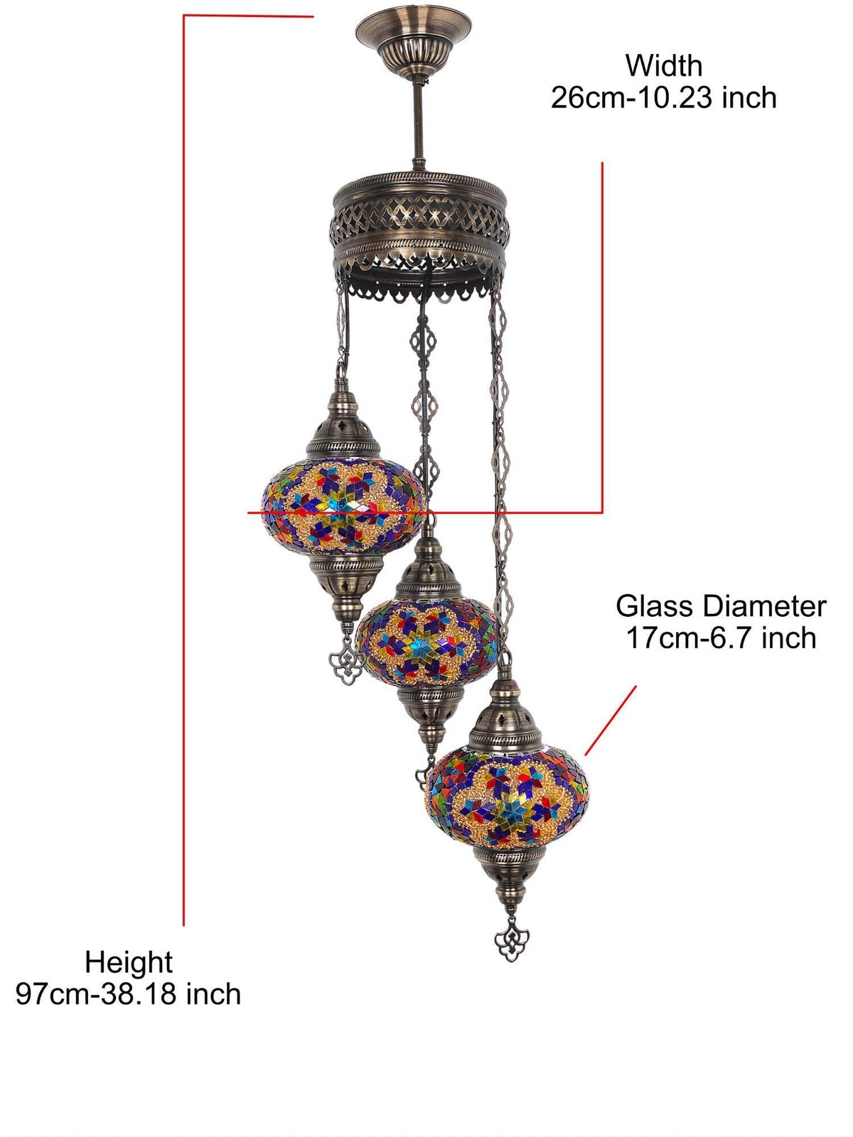 Firstly Turkish mosaic chandelier 3 globe ceiling lamp that easy to combine. These are the chandelier with mosaic mastery coming from Turkey’s rich cultural heritage. Secondly these elegant chandelier have gained worldwide popularity for their unique mastery and fascinating beauty. Thus experience the of Turkish mosaic mastery and let these chandeliers be a shining centerpiece in your space.However the warm and soft glow emitted by the chandeliers creates a peaceful and relax atmosphere. These lights have the power to convert even the most ordinary spaces into beware retreats where you can unwind and rejuvenate. By installing these remarkable pieces, you can convert your environment into a haven of elegance while creating a relaxing and charming atmosphere.The Turkish Mosaic Chandelier 3 Globe Ceiling Lights are an excellent choice to bring refinement and ambiance into your living or workspace. With their fascinating mosaic designs, in style, and unique lighting effects, these chandelier easily blend functionality and aesthetics. DIMENSIONSHeight : 97 cm – 38.18 incWidth : 26 cm – 10.23 incNot Chain Height : 26 cm – 10.23 incShortest Hanging Height : 26 cm – 10.23 incBULB DETAILSType : E-12 Socket for US – E-14 Socketfor UK and EU.Qty : 3Maximum Walt : 25 wBULB NOT INCLUDEDELECTRIC DETAILSVoltage : 110V for US – 220V for UK& EUPower source : With cable from ceilingSHIPMENT DETAILSThe product is handmade and the production time is 7 days, shipping is free.Please contact me if you do not receive your order within 15 days, i’ll lookinto it and help.PERSONALIZEYou can customize our products in width, length and color as you wish, please contact us forthis.Most important , we can make a custom 3D design. In the same way, after the design, you can see the picture and video of the.METARIAL Mosaic Glass Plastering Metal Chain Cable