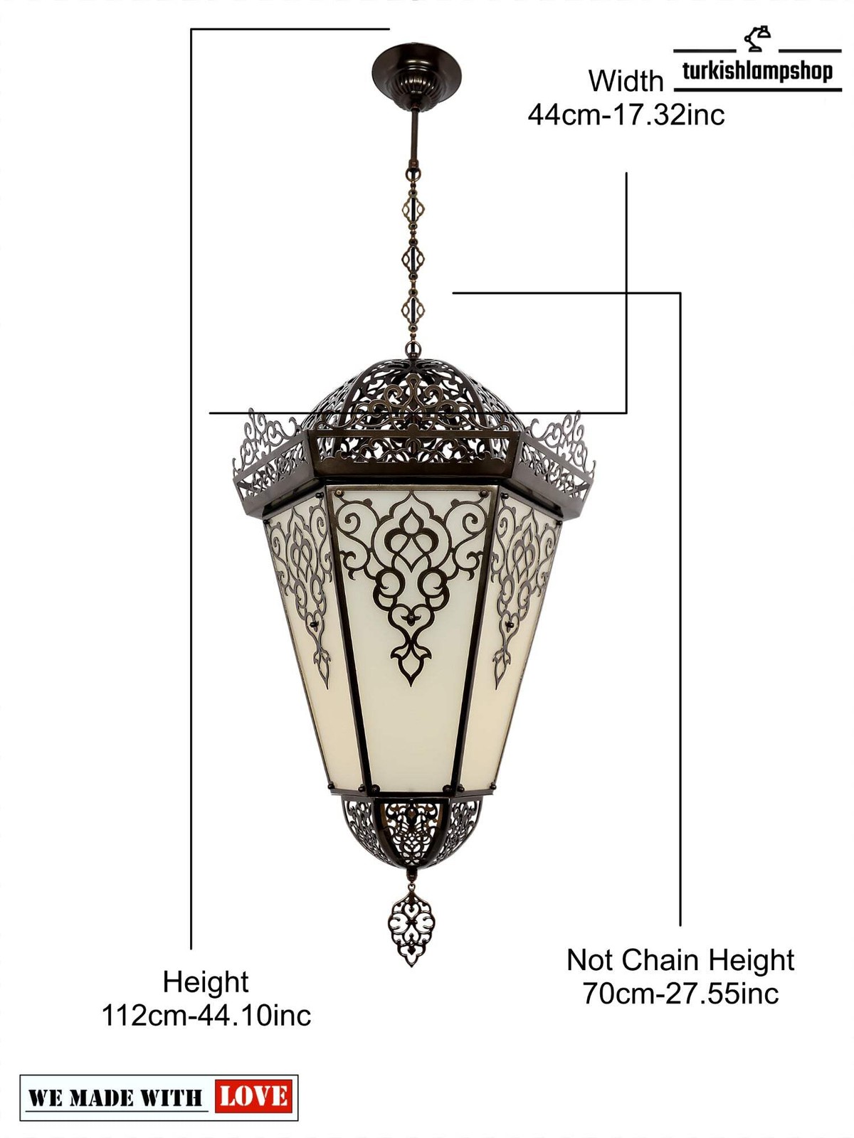 Erstens ist diese bezaubernde Pendelleuchte mit türkischem Muster eine lasergeschnittene Leuchte, die jedem Raum einen Hauch von Klasse und Ambiente verleiht. Zweitens wird ihr aufwendiges lasergeschnittenes Design sicherlich alle Ihre Gäste beeindrucken. Mit ihrem zeitlosen Stil verleiht diese Leuchte Ihrem Zuhause eine schöne, einzigartige Note. Beleuchten Sie jeden Raum mit dieser wunderschönen Pendelleuchte mit türkischem Muster, die mit aufwendigen lasergeschnittenen Details gestaltet ist und in jedem Zuhause eine schöne Atmosphäre schafft. Ihr klassischer Stil strahlt jedoch eine einladende Wärme aus und sorgt für elegantes Licht in Ihrem Lieblingsraum. Erhellen Sie Ihren Raum mit dieser atemberaubenden Pendelleuchte im türkischen Stil. Ihr lasergeschnittenes Design sorgt für einen einzigartigen und aufwendigen Look, der Ihre Einrichtung hervorhebt. Schaffen Sie mit diesem Statement-Stück im Handumdrehen eine warme und friedliche Atmosphäre. ABMESSUNGEN Höhe: 112 cmBreite: 44 cmHöhe ohne Kette: 70 cmKürzeste Aufhängehöhe: 85 cm DETAILS ZUR GLÜHBIRNETyp: E-26-Fassung für die USA – E-27-Fassung für Großbritannien und die EU.Anzahl: 1Maximale Wattzahl: 40 WGLÜHBIRNE NICHT IM LIEFERUMFANG ENTHALTEN ELEKTRISCHE ANGABENSpannung: 110 V für die USA – 220 V für Großbritannien und EUStromquelle: Mit Kabel von der Decke VERSANDDETAILS Das Produkt ist handgefertigt und die Produktionszeit beträgt 10 Tage, der Versand ist kostenlos. Bitte kontaktieren Sie mich, wenn Sie Ihre Bestellung nicht innerhalb von 15 Tagen erhalten haben, ich werde mich darum kümmern und Ihnen helfen. PERSONALISIERENSie können unsere Produkte in Breite, Länge und Farbe nach Ihren Wünschen anpassen. Bitte kontaktieren Sie uns dazu.Vor allem können wir ein individuelles 3D-Design erstellen. Ebenso können Sie nach dem Entwurf das Bild und das Video davon sehen. MATERIAL Lasergeschnittenes BlechVerputztes MetallKetteKabel