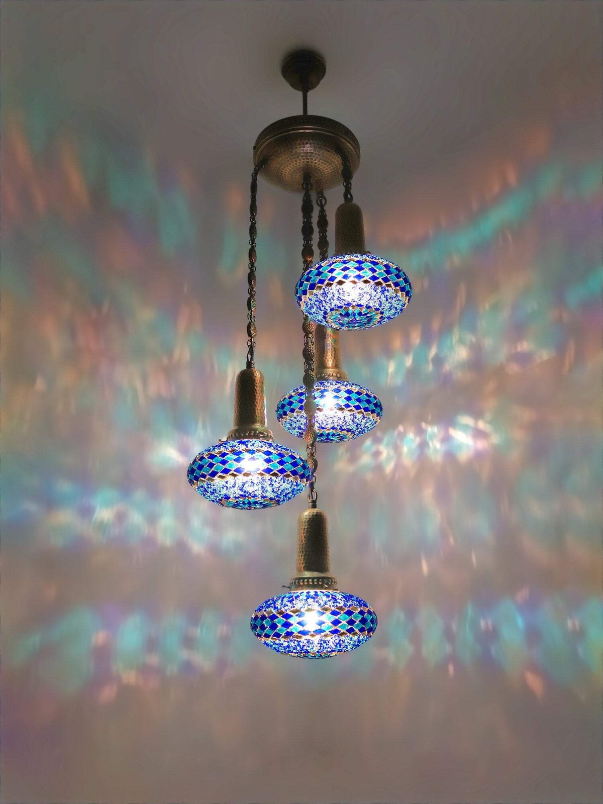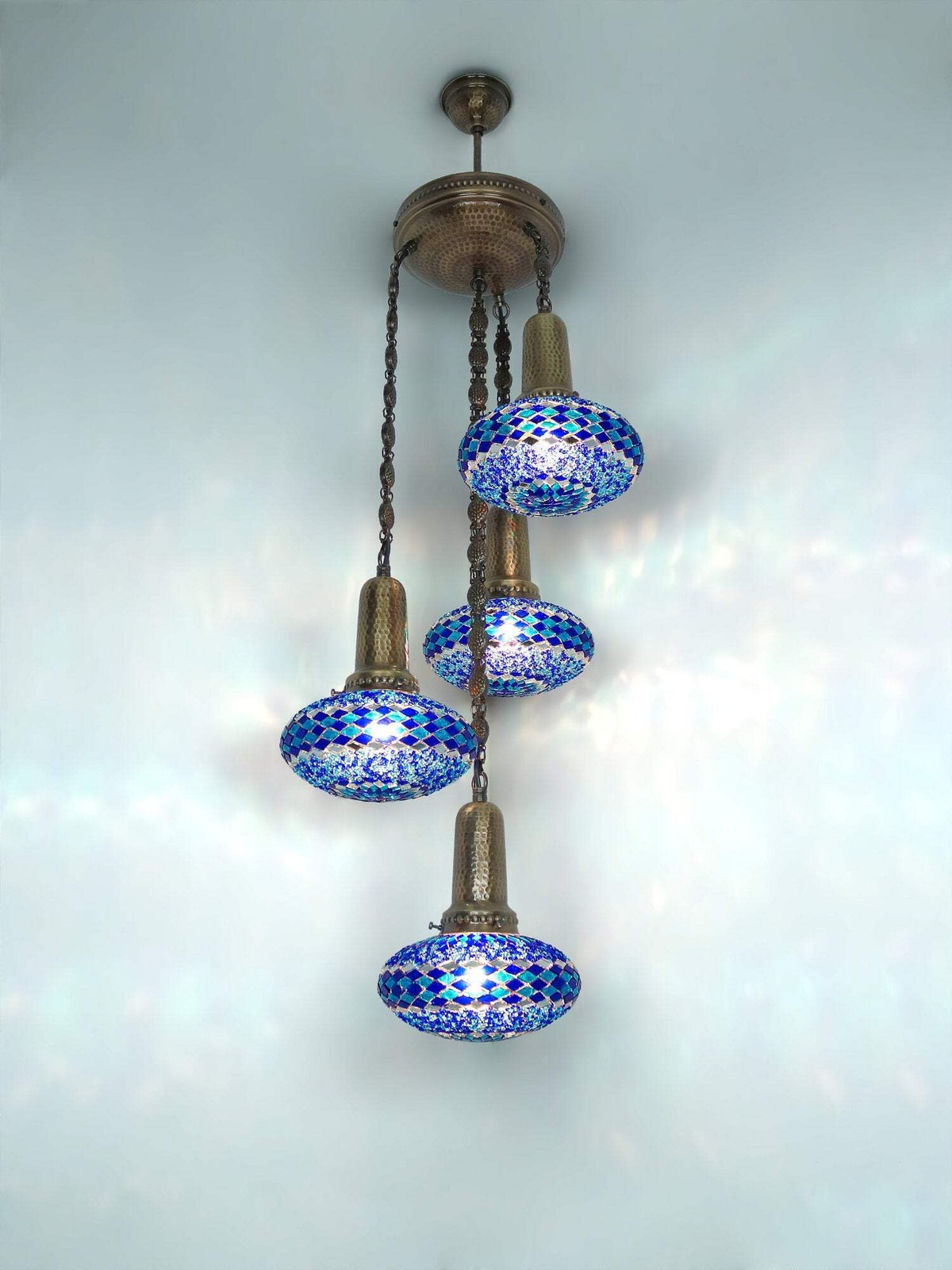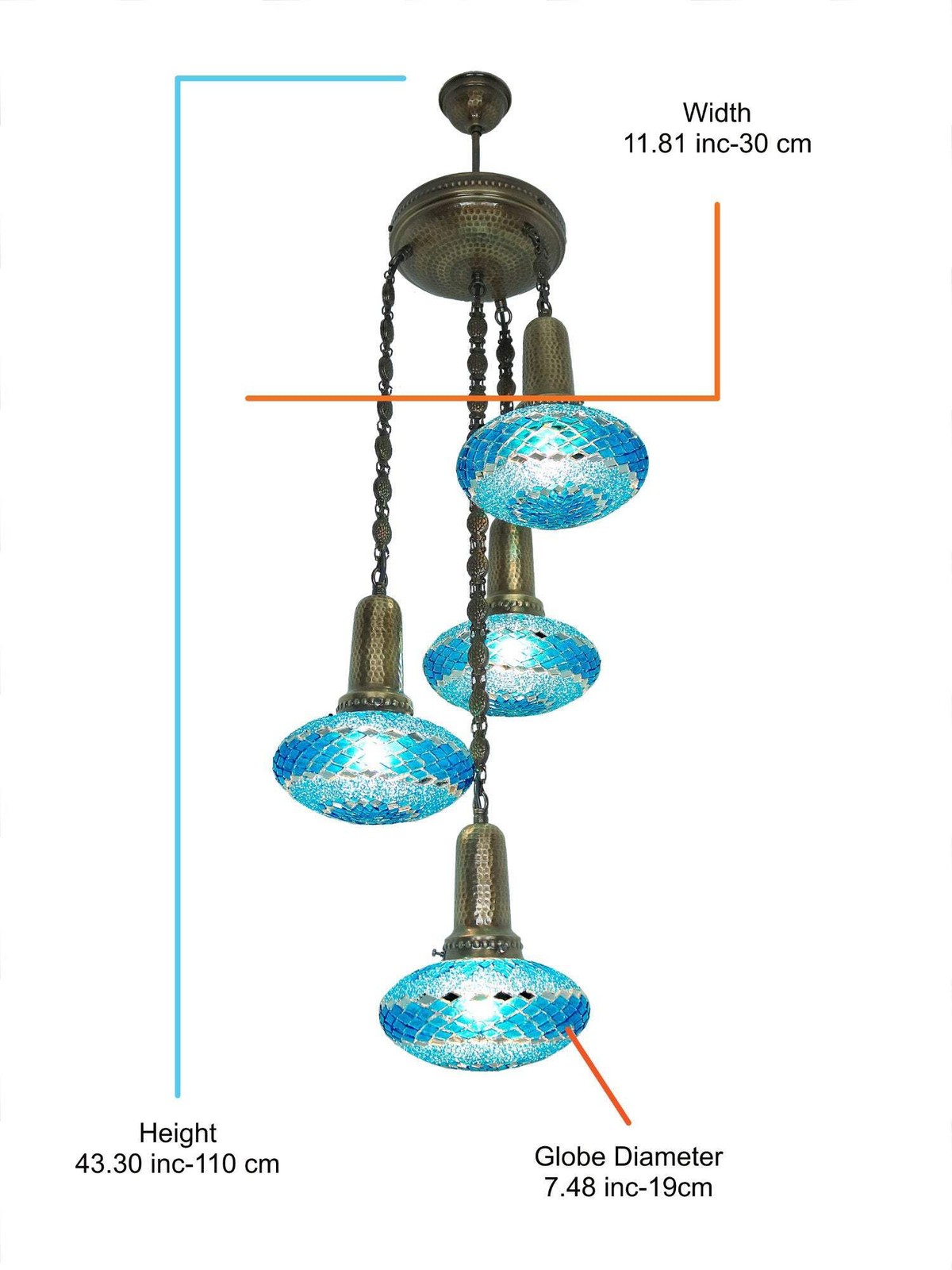 Firstly Turkish chandelier are renowned for their exceptional mastery, and the stained glass 4-globe spiral design is no exception. Secondly each piece is meticulously hand made by skilled artisans. Thus ensuring attention to detail and a high quality finished product.After that the use of stained glass, a technique dating back centuries, is now enhanced by advancements in glass manufacturing and cutting techniques. This allows for more intricate designs and a wider array of colors, resulting in breathtaking chandeliers that are both visually stunning and functional.However Turkish Chandelier Stained Glass 4 Sphere Spiral Design is a remarkable lighting fixture that effortlessly combine elegance, mastery and modern design. Shortly its stained glass panels and spiral arrangement create a captivating visual display, making it the perfect centerpiece for any room.DIMENSIONSHeight : 43.30 inc-110 cmWidth : 11.81 inc-30 cmGlobe Diameter : 7.48 inc -19cmBULB DETAILSType : E-12 socket for US – E-14 socket for UK and EU.Qty : 4Maximum Walt : 25wBULB NOT INCLUDEDELECTRIC DETAILSVoltage : 110V for US – 220V for UK & EUPower source : With cable from ceilingSHIPMENT DETAILSThe product is handmade and the production time is 7 days, shipping is free. Please contact me if you do not receive your order within 15 days, i’ll look into it and help.PERSONALIZEYou can customize our products in width, length and color as you wish, please contact us forthis.Most important , we can make a custom 3D design. In the same way, after the design, you can see the picture and video of the.METARIAL Mosaic Glass Plastering Metal Chain Cable