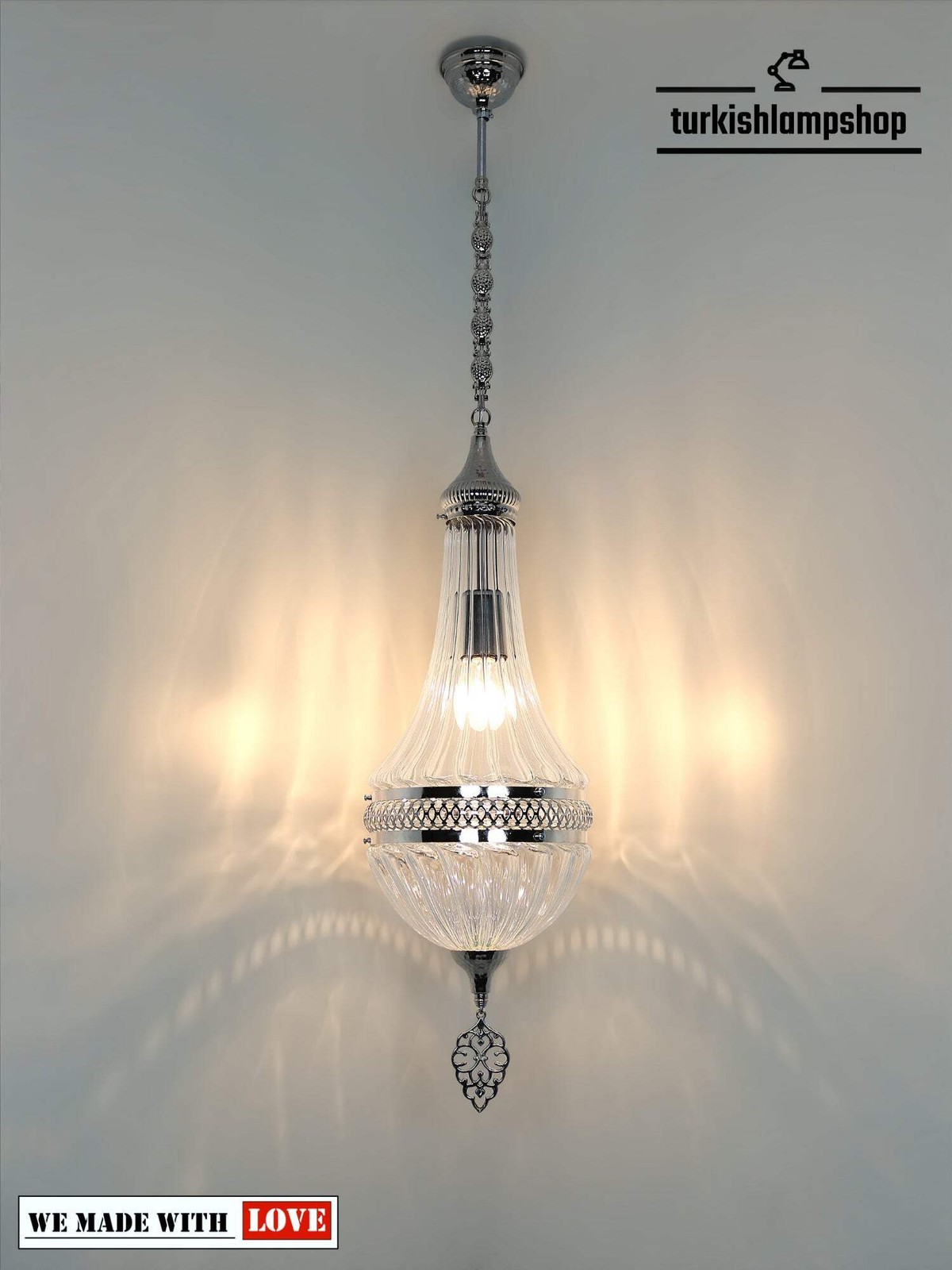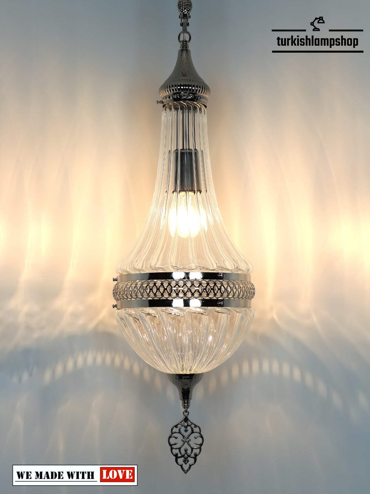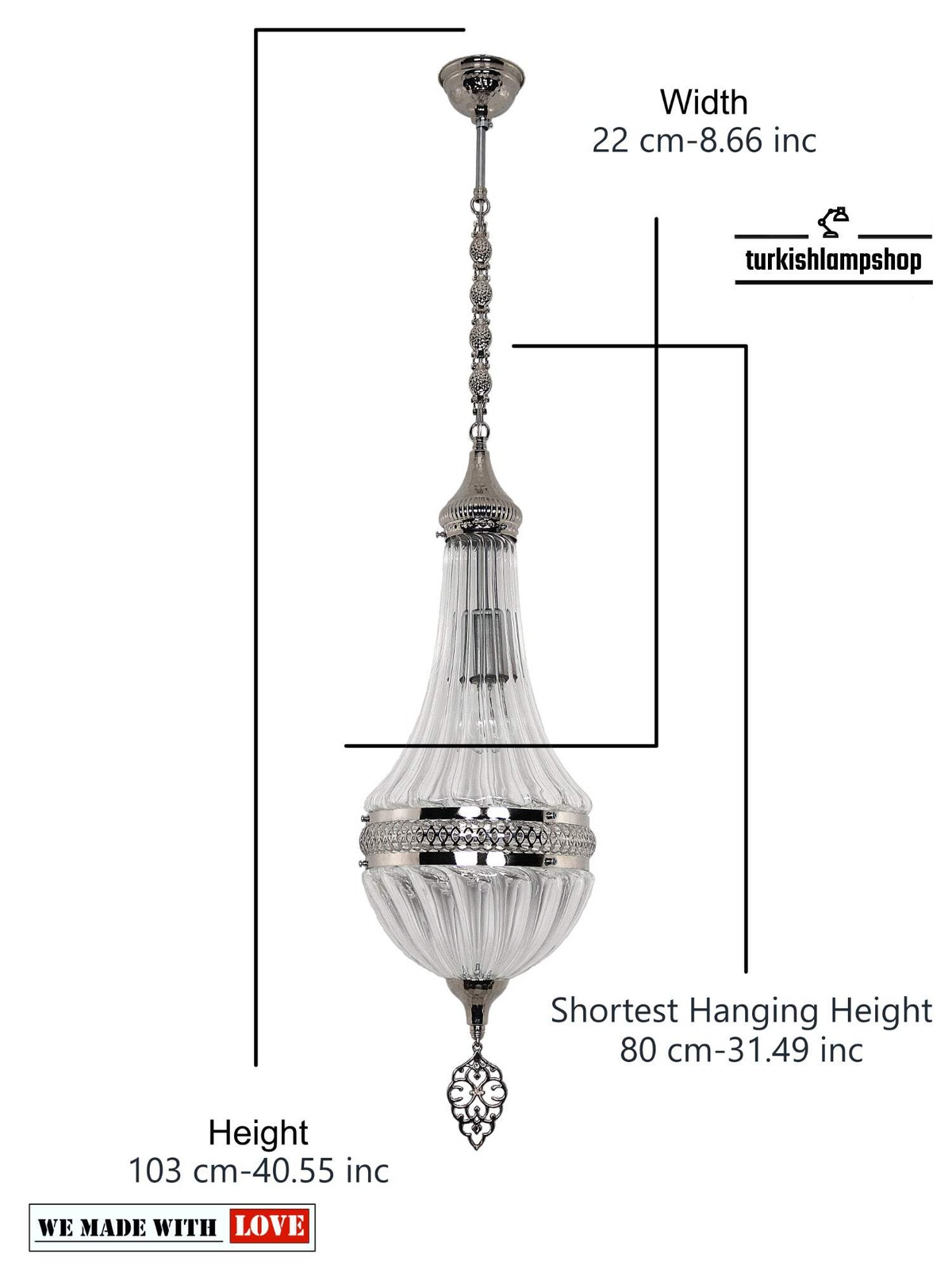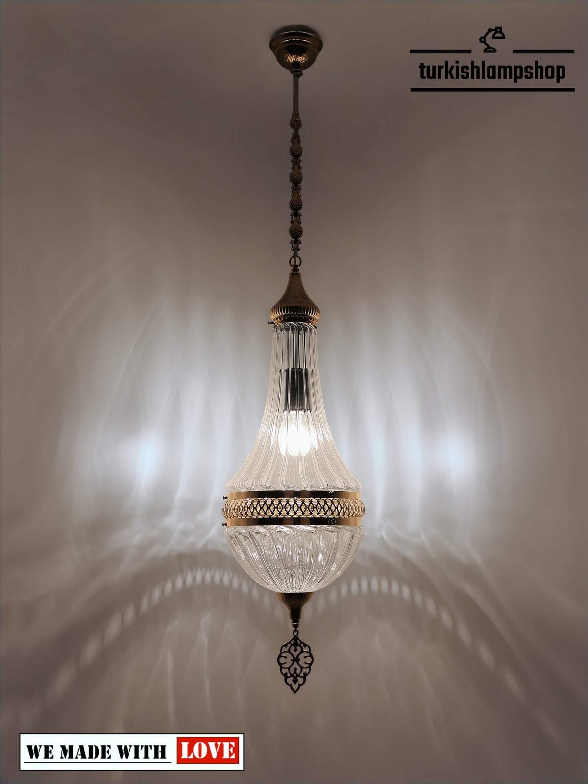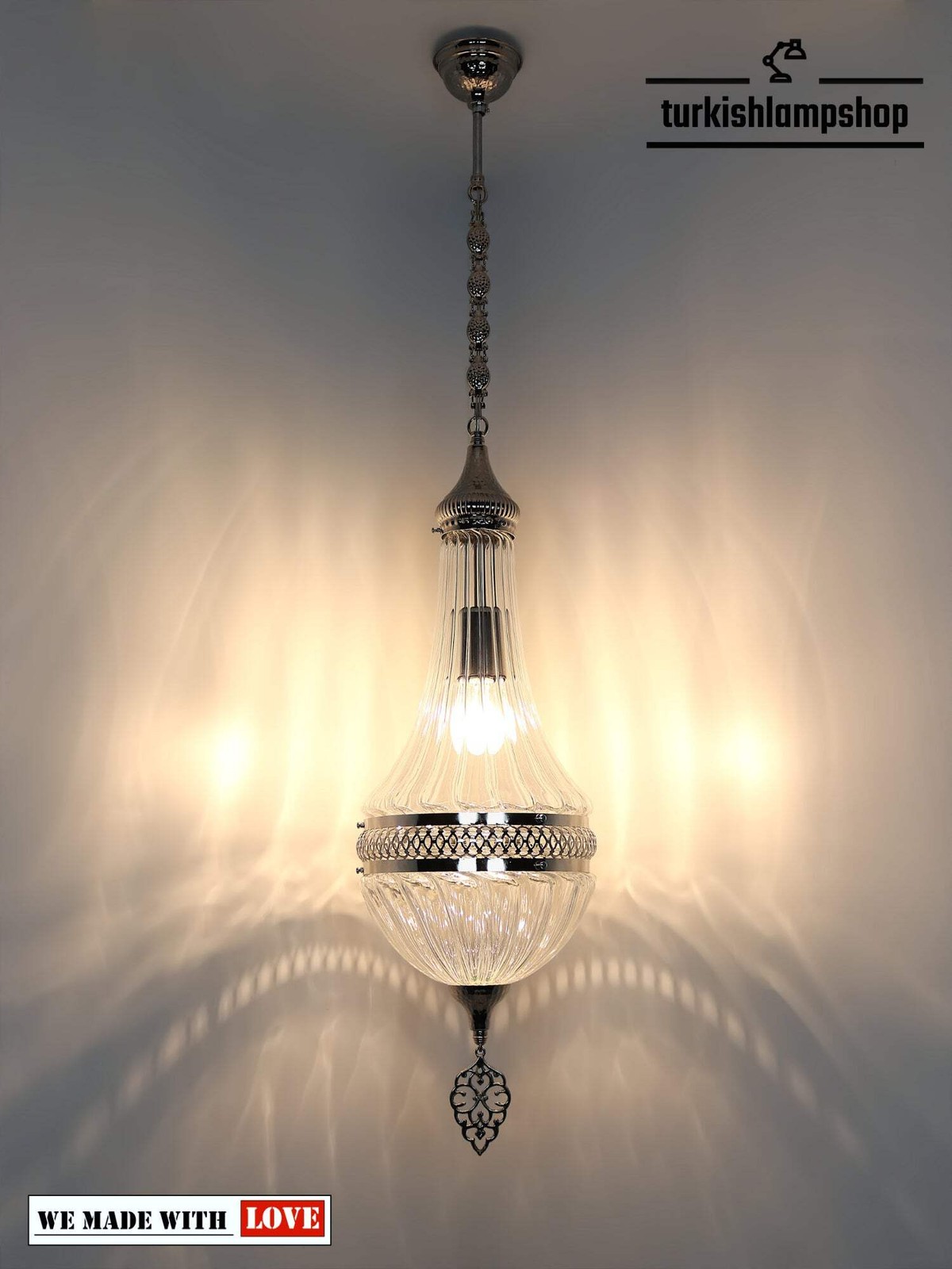 Bringen Sie mit dieser wunderschönen handgefertigten Pendelleuchte im türkischen Stil zeitlose Eleganz in Ihre Räume. Das hochwertige, klare Pyrex-Glas sorgt für ein sanftes, warmes Licht und schafft eine beruhigende Atmosphäre, die jedes Zuhause aufwertet. Diese Lampe vereint minimalistisches Design mit orientalischer Handwerkskunst.