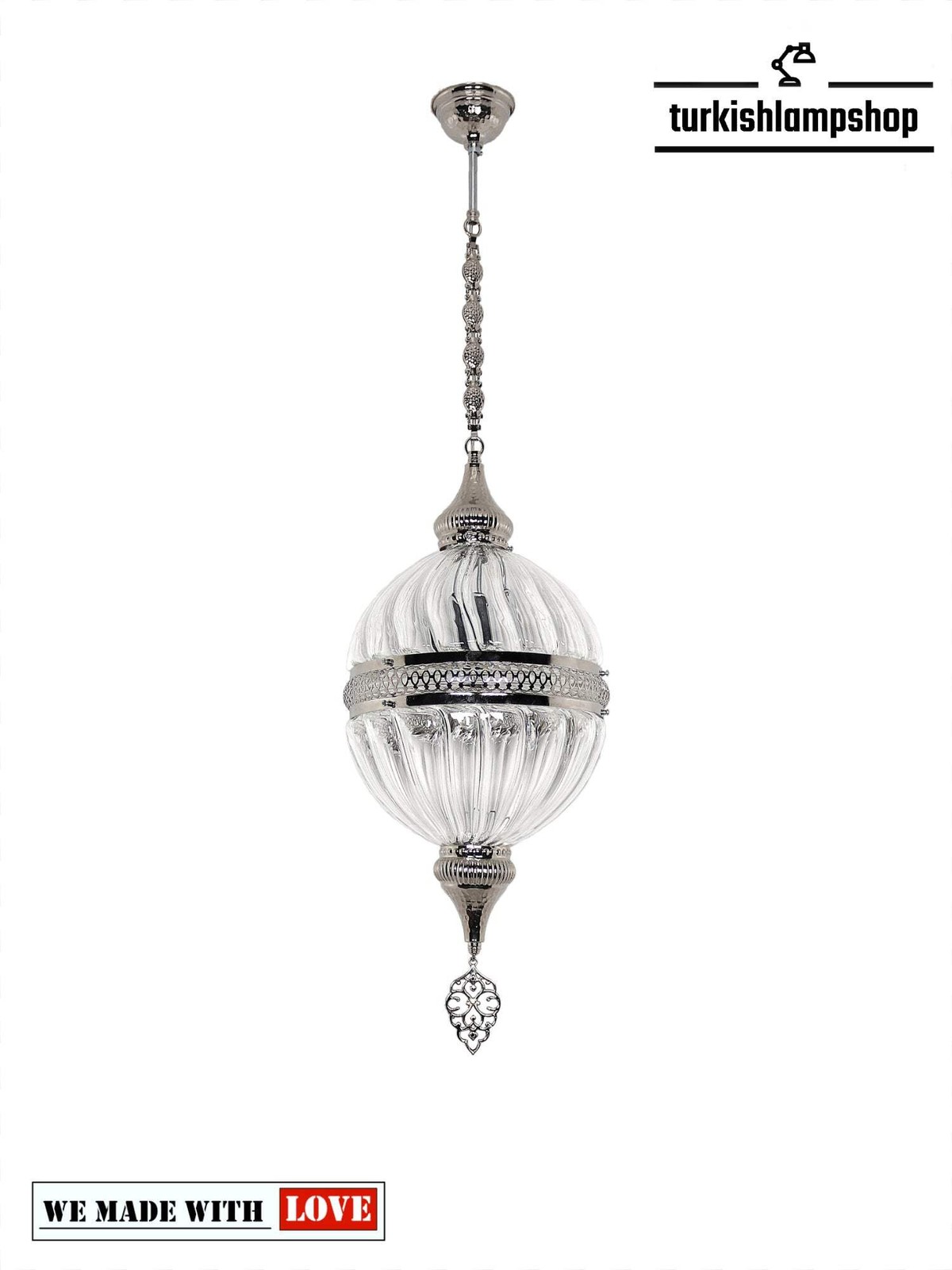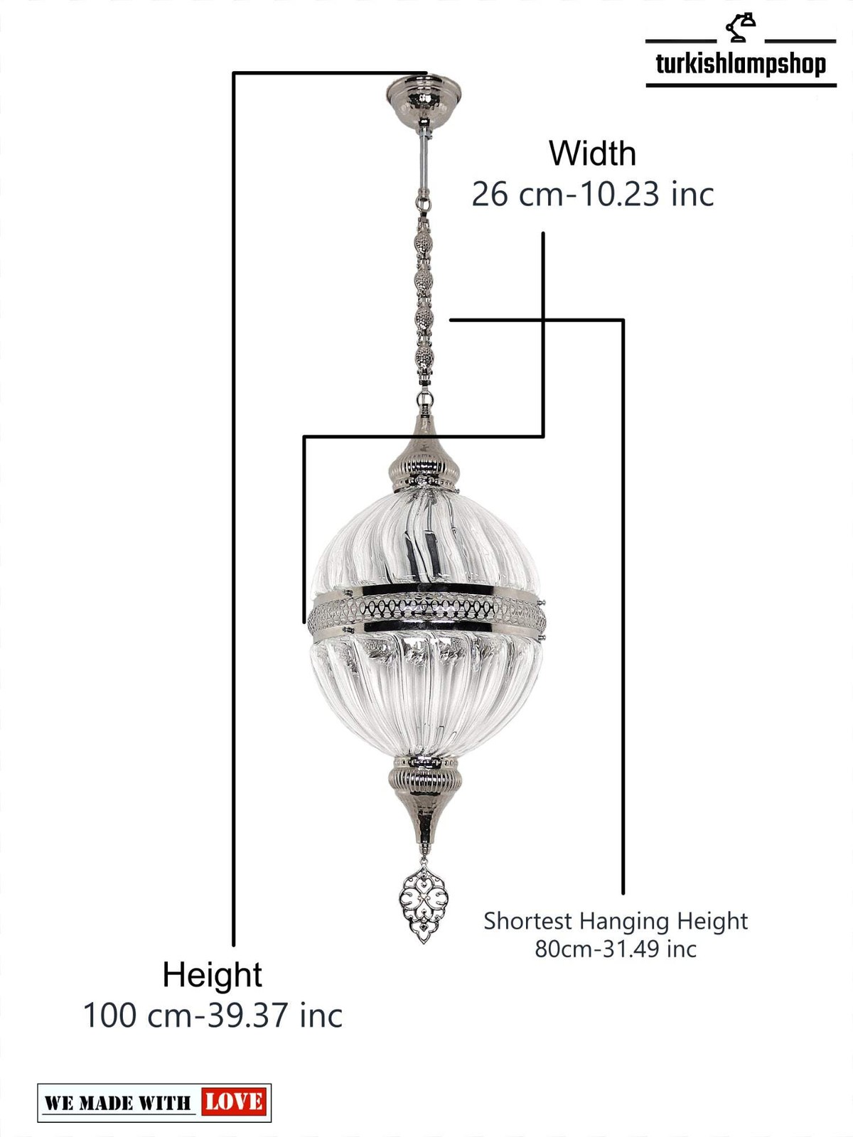 DIMENSIONSHeight : 100cm-39.37 incWidth : 26 cm-10.23 incNot Chain Height:65cm-25.59 incBULB DETAILSType : E-26 socket for US – E-27 socket for UK and EU.Qty : 1Maximum Walt : 60wBULB NOT INCLUDEDELECTRIC DETAILSVoltage : 110V for US – 220V for UK & EUPower source : Withcable from ceilingSHIPMENT DETAILSThe product is handmade and the production time is 7 days, shipping is free. Please contact me if you do not receive your order within 15 days, i’ll look into it and help.PERSONALIZEYou can customize our products in width, length and color as you wish, pleasecontact us forthis. Most important we can make a custom 3D design. In the same way, after the design, you can see the picture and video of the. METARIAL Pyrex Glass Plastering Metal Chain Cable Firstly, when it comes to home decoration, lighting plays a very important role in creating the desired ambiance. Secondly, are you looking for a unique light fixture? Thus the clear Turkish lantern pyrex glass pendant is an excellent choice. Thus, this elegant piece combines traditional Turkish craftsmanship with modern design, making it a beautiful addition to any space. Also Turkish lantern pyrex glass pendant lamp is made by skilled artisans knowledgeable in the art of glassblowing. Similarly, each lamp is made of fire-resistant glass known for its clarity. Especially the clear color of the glass allows the light to shine through beautifully. Thus it creates an inviting atmosphere in any room. However investing in the Turkish Lantern Pyrex Glass Pendant Lamp will not only enhance the aesthetics of your home but also provide you with a durable and long lasting lighting solution. So, why wait. Finally elevate your home décor with this timeless piece and enjoy the enchanting glow it brings to your space.