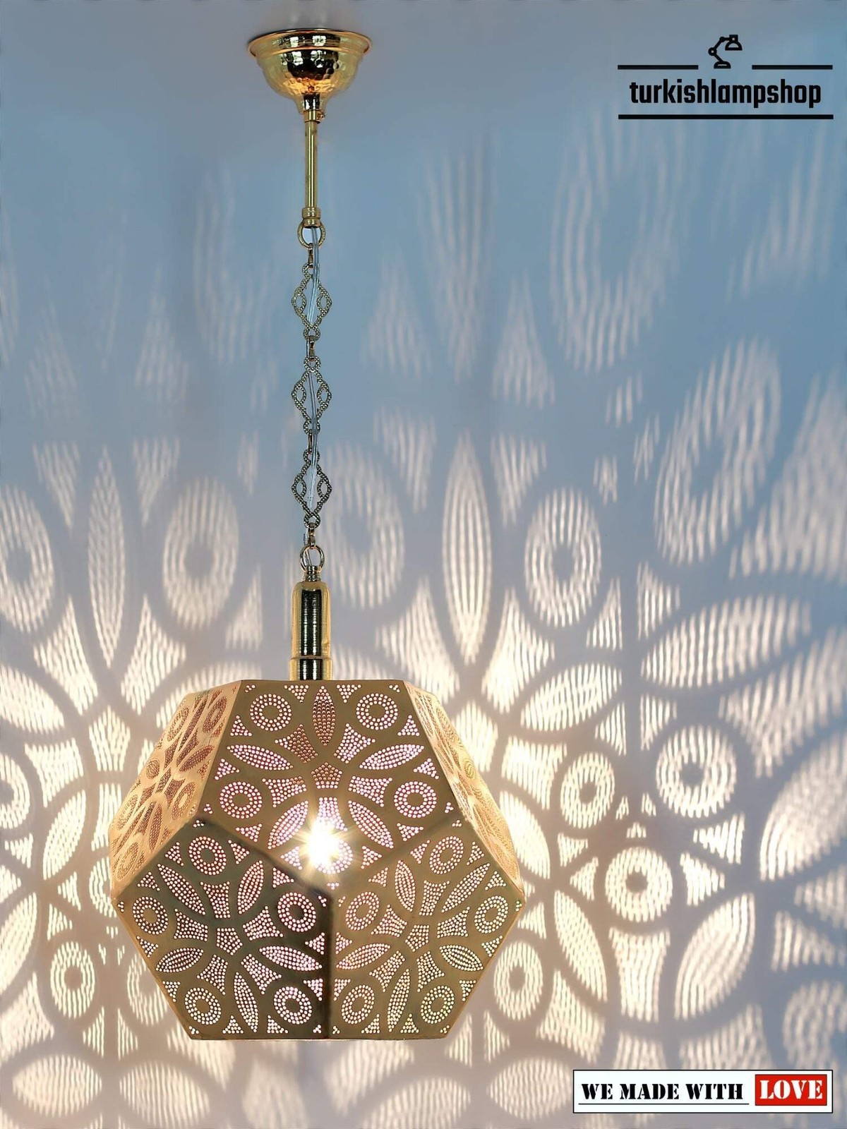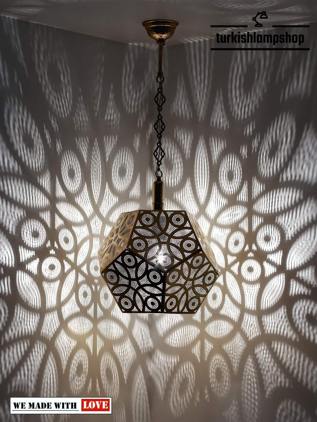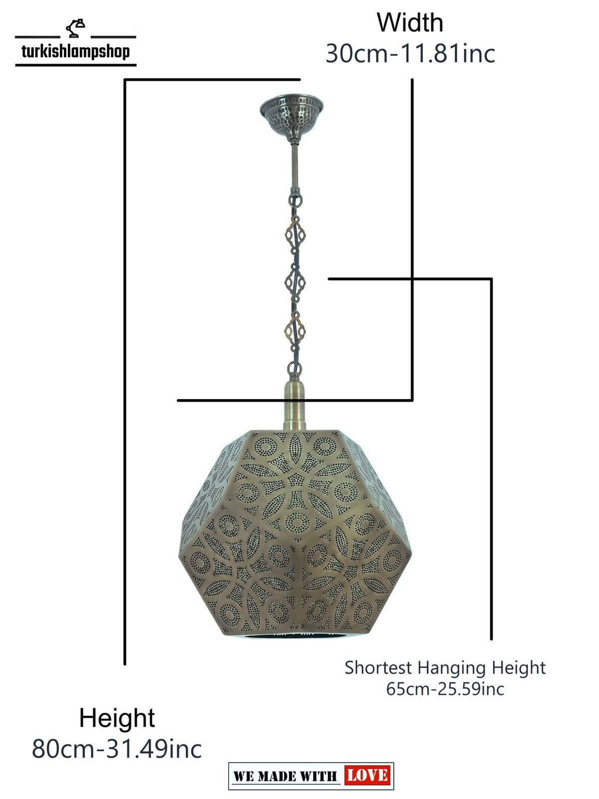 Firstly comes to home decor, finding the perfect lighting fixture can make a significant impact on the overall ambiance of a space. Secondly one exquisite option that effortlessly combines. Thus Turkish and Moroccan design elements is the Turkish pattern Moroccan hanging lamp in a stunning gold color. Moreover this handcrafted lamp boasts intricate patterns, a warm golden hue, and a beautiful hanging design, instantly adding elegance and charm to any room. Especially in this article, we will explore the prominent Moroccan pattern features of this outstanding Turkish hanging lamp, its progress in popularity of the gold color and its extraordinary result in enhancing the aesthetics of your living space.After that whether you are aiming for a classic, bohemian, or contemporary look, this hanging lamp will undoubtedly make a statement while casting a warm and inviting glow. Shortly why not embrace the captivating allure of the Turkish pattern Moroccan hanging lamp and experience the wonders it can bring to your living space?DIMENSIONSHeight : 80cm-31.49incWidth : 30cm-11.81 incNot Chain Height : 50cm-19.68incShortest Hanging Height : 65cm-25.59incBULB DETAILSType : E-26 socket for US – E-27 socket for UK and EU.Qty : 1Maximum Walt : 40wBULB NOT INCLUDEDELECTRIC DETAILSVoltage : 110V for US – 220V for UK & EUPower source : With cable from ceilingSHIPMENT DETAILSThe product is handmade and the production time is 10 days, shipping is free. Please contact me if you do not receive your order within 15 days, i’ll look into it and help.PERSONALIZEYou can customize our products in width, length and color as you wish, please contact us forthis.Most importantly, we can make a custom 3D design. In the same way, after the design, you can see the picture and video of the.METARIAL Hole pattern sheet metal Plastering Metal Chain Cable
