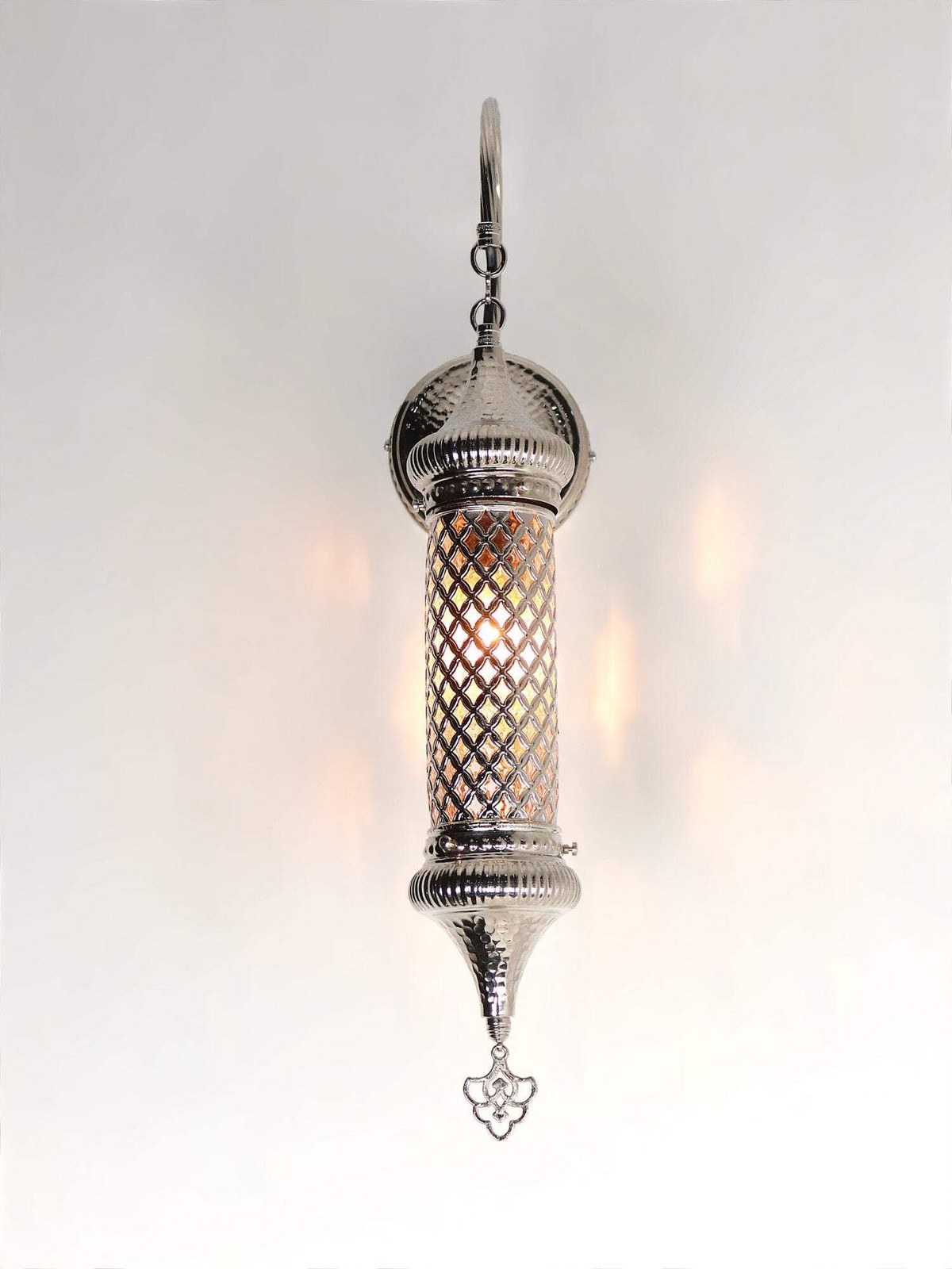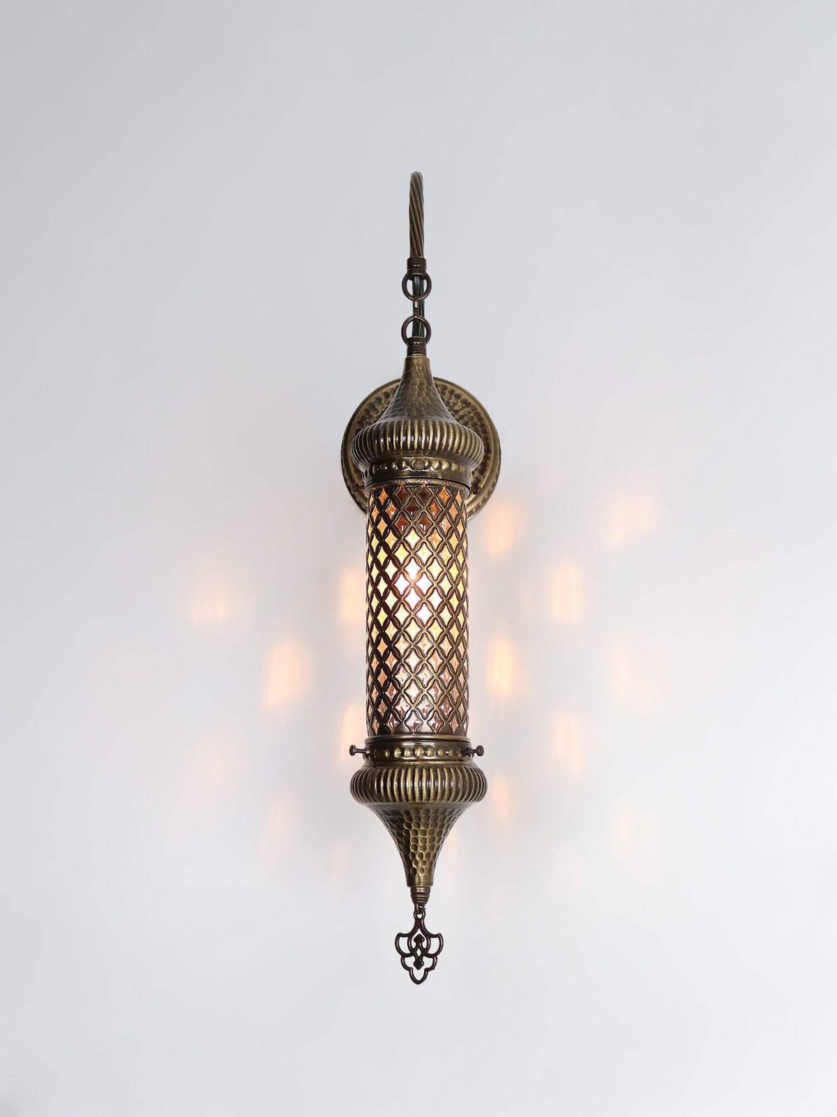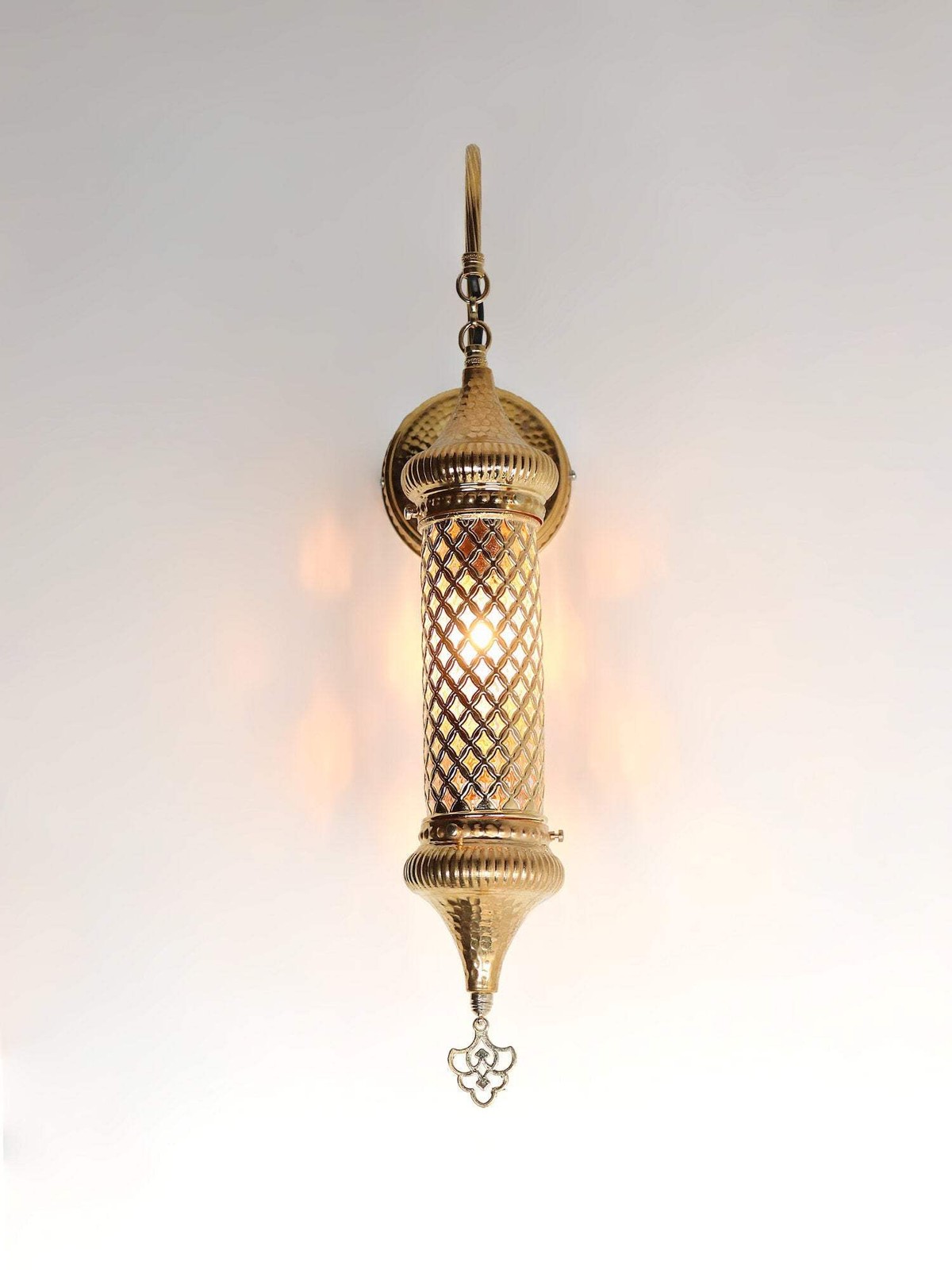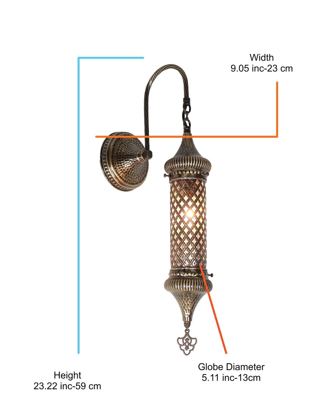 Above all the gold color sconce lighting in Turkish cylinder wall lamp adds an element of luxury and sophistication to any space. Secondly the radiant glow of the gold beautifully complements the blown glass cylinder, casting intriguing shadows and reflections throughout the room.Whether you want a statement piece for your living room, hallway or a touch of opulence for your restaurant or hotel. Moreover this gold coloured sconce provides the perfect backdrop for any occasion. The Turkish wall lamp blends seamlessly with a variety of interior design styles, whether contemporary or bohemian. Especially their timeless appeal allows them to adapt to changing trends.After that its ethereal glow radiates warmth and beauty, creating an enchanting atmosphere. For example hang it in your living room or hallway. Shortly urkish cylinder wall lamp is captivating that elevates your space and leaves a lasting impression on everyone. Finally let this exclusive lighting fixture take you to the fascinating world of Turkish mastery.DIMENSIONSHeight : 23.22 inc-59 cmDepth : 9.05 inc-23 cmGlobe Diameter :5.11 inc-13cmBULB DETAILSType : E-12 socket for US – E-14 socket for UK and EU.Qty : 1Maximum Walt : 40wBULB NOT INCLUDEDELECTRIC DETAILSVoltage : 110V for US – 220V for UK & EUPower source : With cable from ceilingSHIPMENT DETAILSThe product is handmade and the production time is 7 days, shipping is free. Please contact me if you do not receive your order within 15 days, i’ll look into it and help.PERSONALIZEYou can customize our products in width, length and color as you wish, please contact us forthis.Most important , we can make a custom 3D design. In the same way, after the design, you can see the picture and video of the.METARIAL Blown Glass Plastering Metal Chain Cable