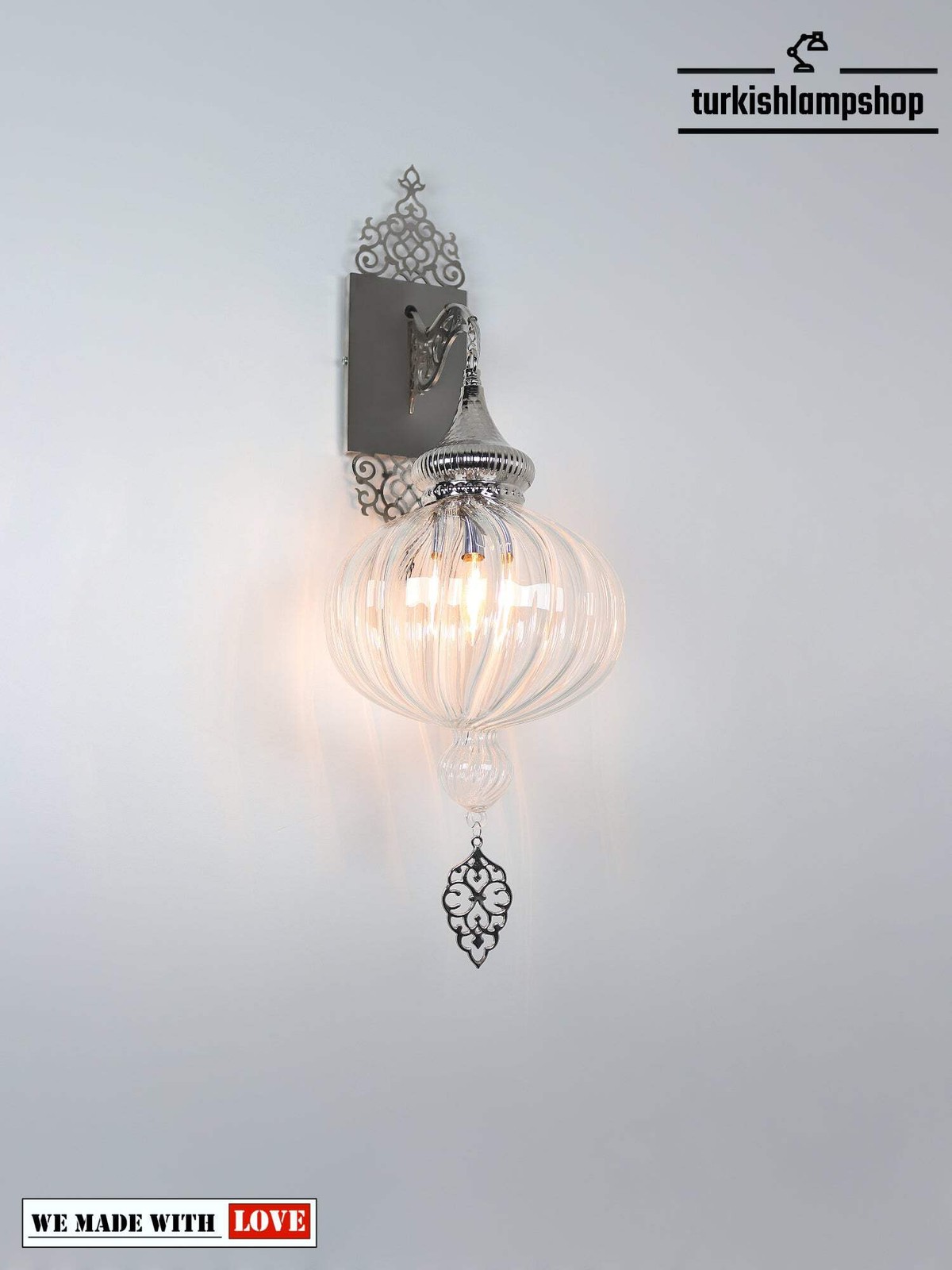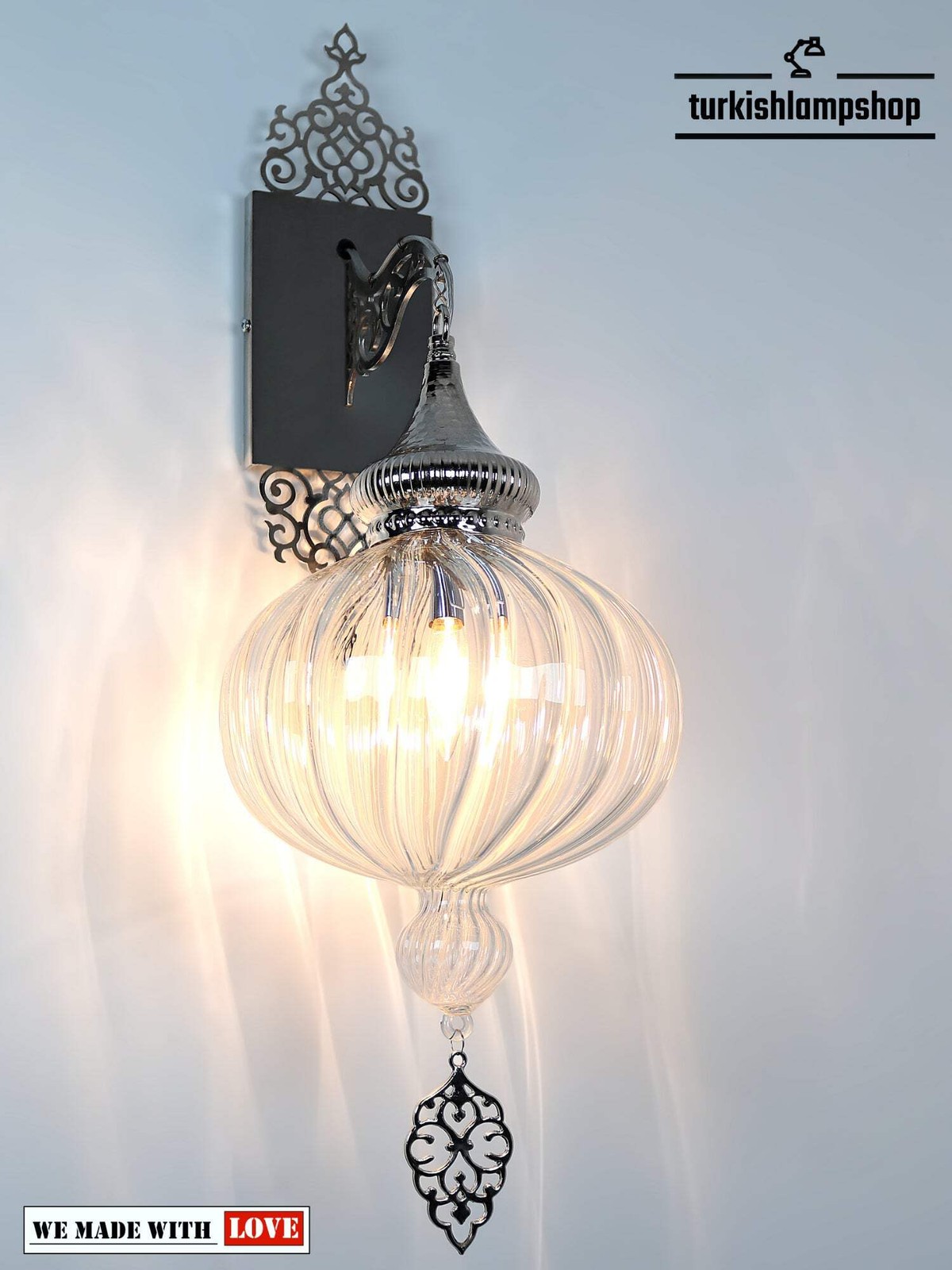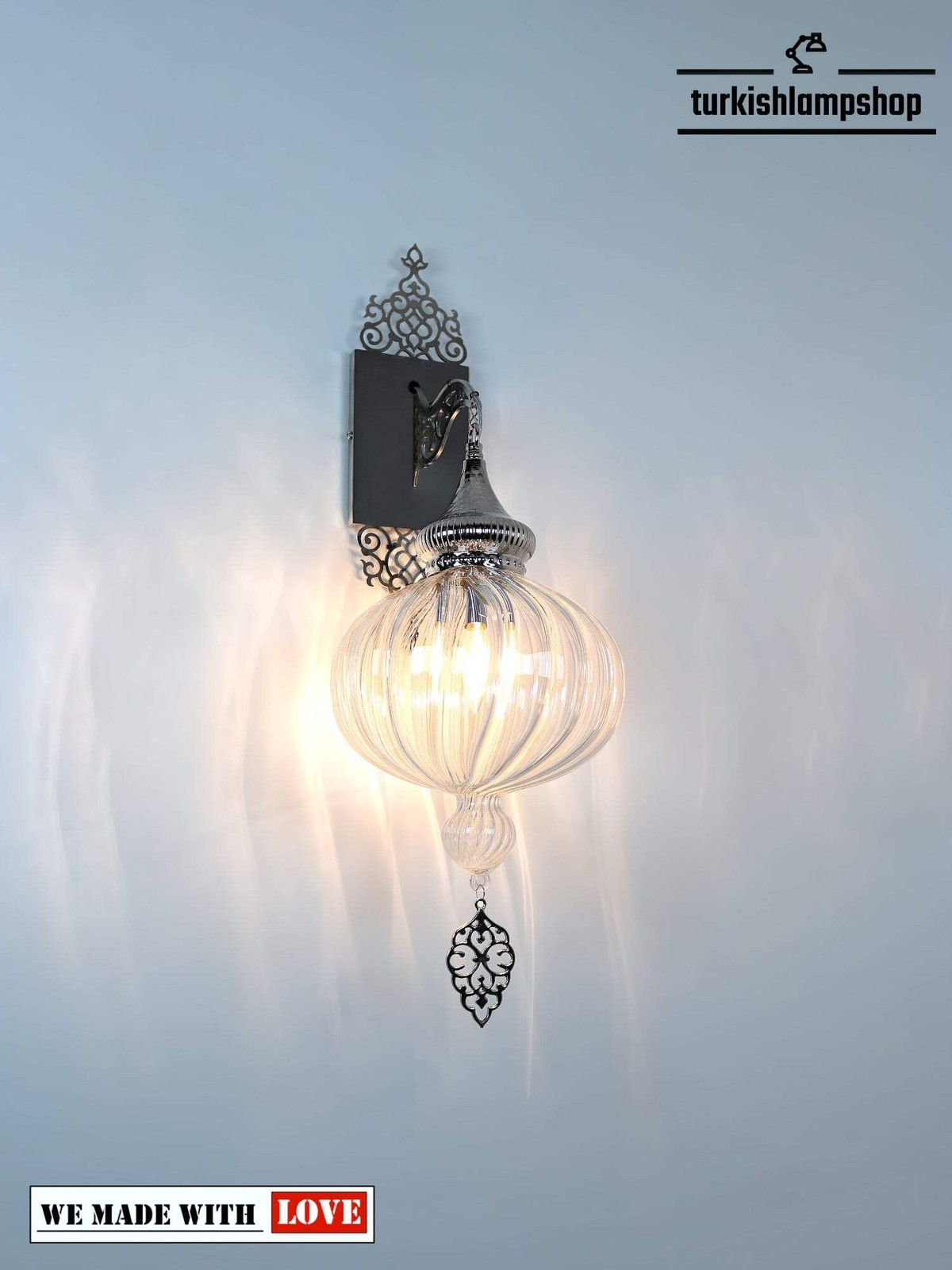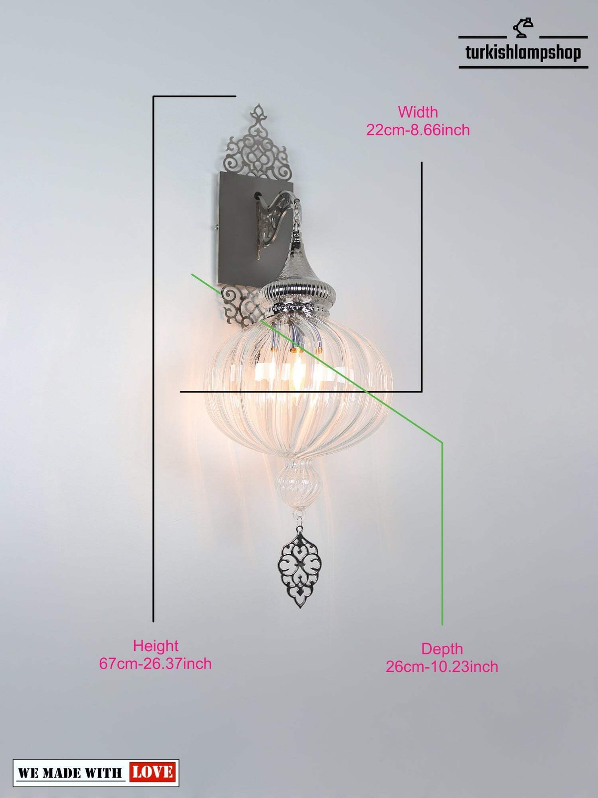 Firstly light up your home with this beautiful Turkish wall light, the pyrex glass is transparent and features a delicate, muted color that adds a subtle touch to your interior design. Thus Turkish wall light pyrex glass it is transparent. After that enjoy a soft yet beautiful ambience with this eye-catching wall light.Moreover this exquisite piece of Turkish wall light home decor adds a touch of refinement to any space. After that crafted from the finest Pyrex glass, it emits a gentle luminescence with its transparent color hues sure to imbue any room with a sophisticated aura. Especially perfect for any home, this Turkish wall light is sure to be an instant classic.Finally challenge the darkness with this Turkish Wall Light! Its Pyrex glass lends a luxurious glow to any room, making it a daring statement of boldness and flair. Enjoy the transparent color, that will transform your space with a touch of elegance inspired by adventure.DIMENSIONS Height : 67cm-26.37incWidth : 22cm-8.66Depth : 26cm-10.23incBULB DETAILSType : E-12 socket for US – E-14 socket for UK and EU.Qty : 1Maximum Walt : 40wBULB NOT INCLUDEDELECTRIC DETAILSVoltage : 110V for US – 220V for UK & EUPower source : With cable from ceiling SHIPMENT DETAILSThe product is handmade and the production time is 10 days, shipping is free. Please contact me if you do not receive your order within 15 days, i’ll look into it and help.PERSONALIZEYou can customize our products in width, length and color as you wish, please contact us forthis.Most importantly, we can make a custom 3D design. In the same way, after the design, you can see the picture and video of the.METARIAL Mosaic Glass Plastering Metal Chain Cable